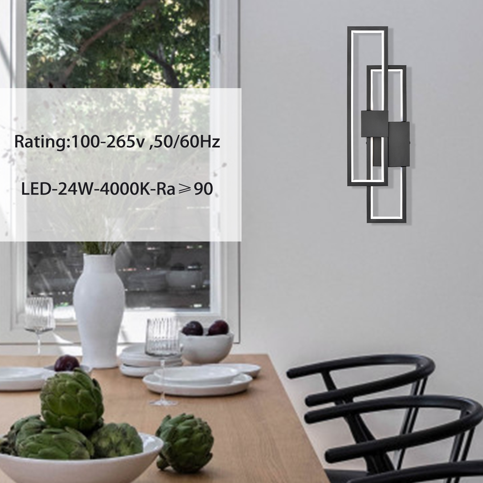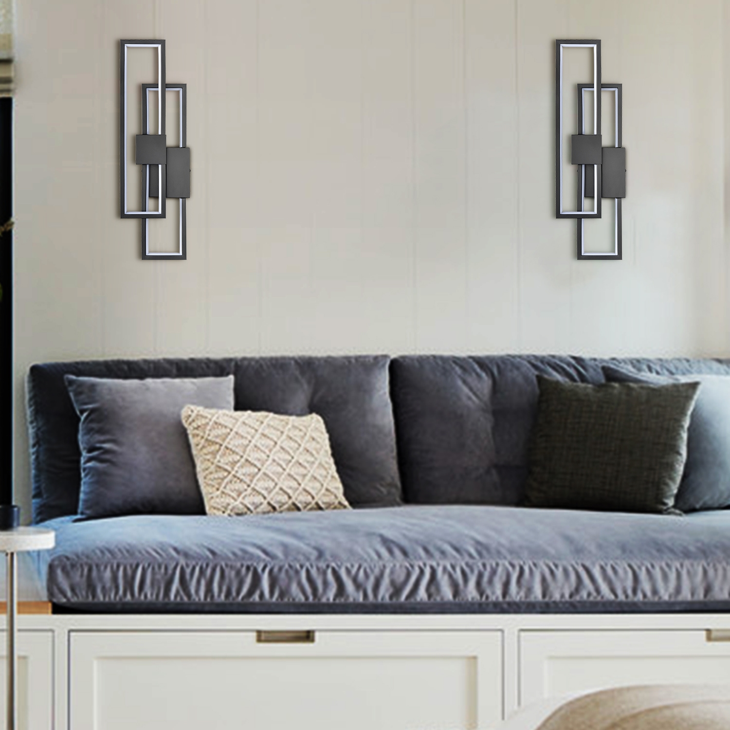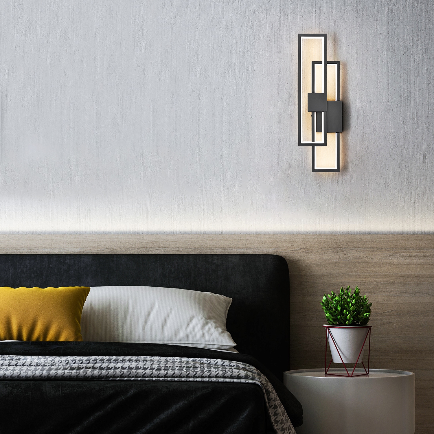 Flaunting a matte black finish, the black LED wall sconce adds a touch of modern sophistication to your interior. It shows off a simple but edgy design as an energy-efficient wall light. Two rectangular black metal frames intersect and are held aloft by the smaller rectangular metal frames in the middle, presenting an intricate yet whimsical look. It provides a surprising twist and an attractive eye appeal. A charming glow shines through the light, filling the space without any glare. It supplies a dash of drama and showcases the beauty of geometry. It can be installed horizontally or vertically.