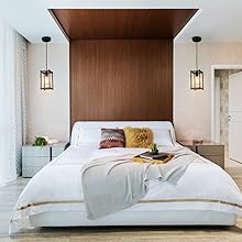 Flaunting a semi-gloss black finish, the hanging pendant light fixture’s canopy, cord, lamp holder, and four vertical bars composing the cage lend industrial-inspired charm to the interior. Its square frames on the top and bottom of the open cage add a hint of rusticity to the living space with a beige-brown faux wood finish. The pendant light fixture’s mix of finishes encompasses both nature-inspired qualities and farmhouse elements, yet maintains an industrial feel. The two-toned finish and the sturdy refinement of the rectangular body provide stunning decorative detail to your home interior.