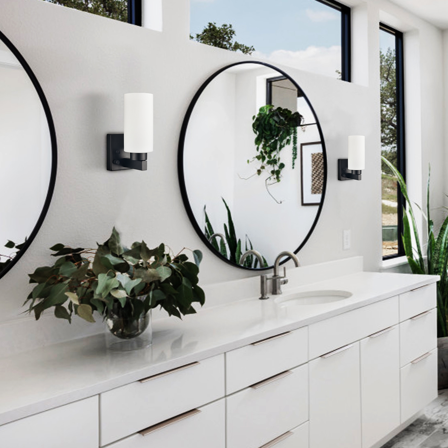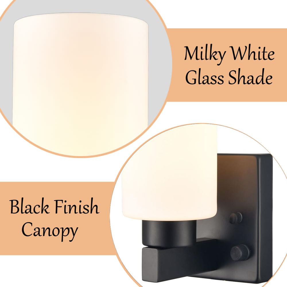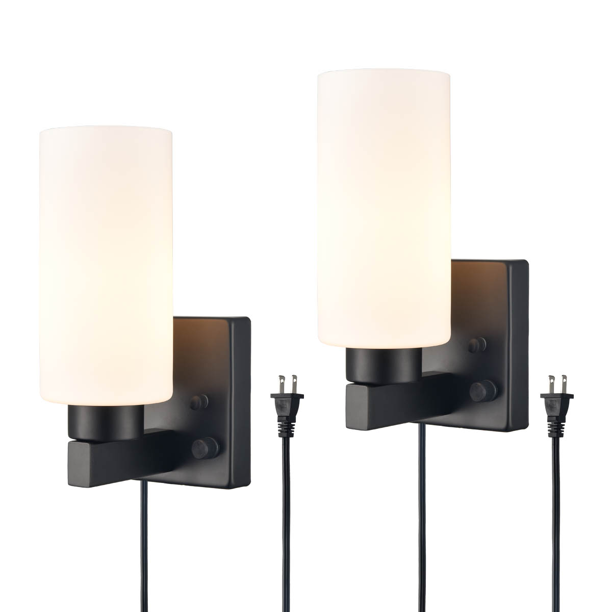 The modern plug-in wall sconces’ canopies, lamp holders, and arms give your interior a touch of modern sophistication with a rustproof semigloss black finish. Crafted from impurity-free hand-blown glass, their milk glass cylinder shades give your aesthetic a dash of drama and showcase the beauty of geometry. Their cylinder shades contrast the black finish and complete the aesthetic with a black-and-white classic color combo. Each wall sconce comes with a 78.7-inch plug-in cord. The switch on their canopies is both an on/off switch and a dimmer switch.
