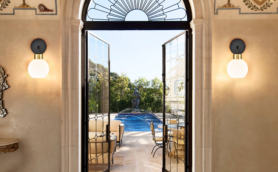 The mid century modern wall lights' canopies and arms are accented with a rustproof semigloss black finish, bringing a dash of drama to your interior. Their lamp holders boast a rustproof electrophoretic brass finish, highlighting your interior with a bit of bling. Crafted from impurity-free opaque opal glass, the wall sconces provide the perfect blend of mid-century classic and modern elements. A mix of finishes encompasses both shiny accent and classic elements, yet maintains an industrial edge. They can be new showpieces for your bathroom, bedroom, entryway, exterior, hallway, living room, and stairwell.