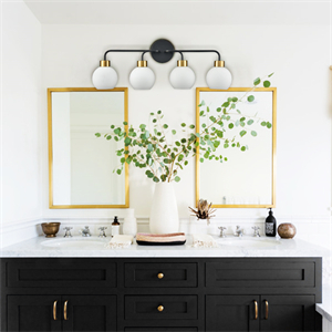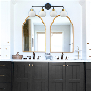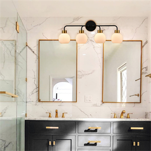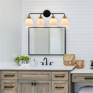 The 4-light black modern wall light's canopy and arms are accented with a rustproof semigloss black finish, bringing a dash of drama to your interior. Its lamp holders boast a rustproof electrophoretic brass finish, highlighting your interior with a bit of bling. Crafted from impurity-free opaque opal glass, it provides the perfect blend of mid-century classic and modern elements. A mix of finishes encompasses both shiny accent and classic elements, yet maintains an industrial edge. It can be new showpieces for your bathroom, bedroom, entryway, exterior, hallway, living room, and stairwell.