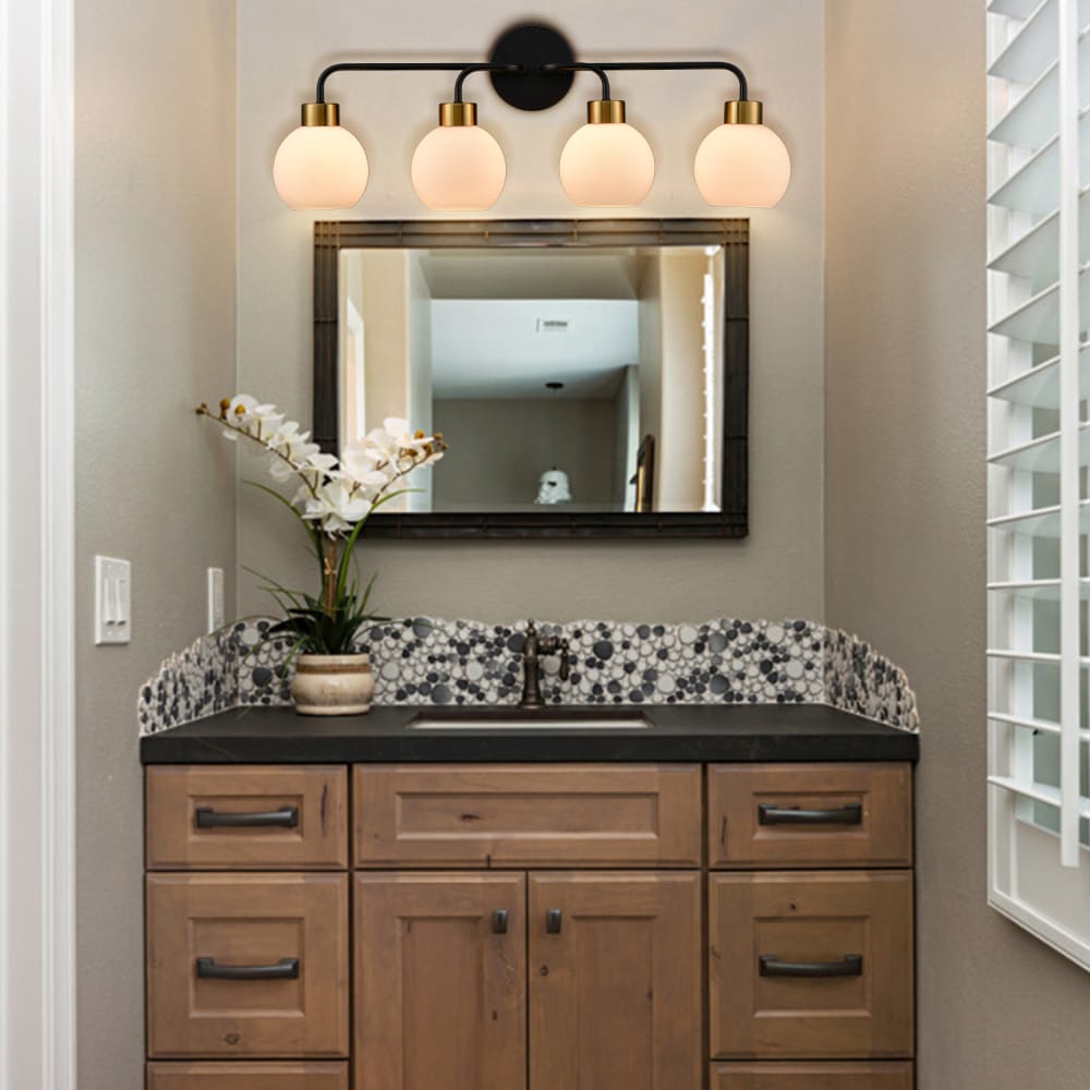 The 4-light black modern wall light's canopy and arms are accented with a rustproof semigloss black finish, bringing a dash of drama to your interior. Its lamp holders boast a rustproof electrophoretic brass finish, highlighting your interior with a bit of bling. Crafted from impurity-free opaque opal glass, it provides the perfect blend of mid-century classic and modern elements. A mix of finishes encompasses both shiny accent and classic elements, yet maintains an industrial edge. It can be new showpieces for your bathroom, bedroom, entryway, exterior, hallway, living room, and stairwell.
