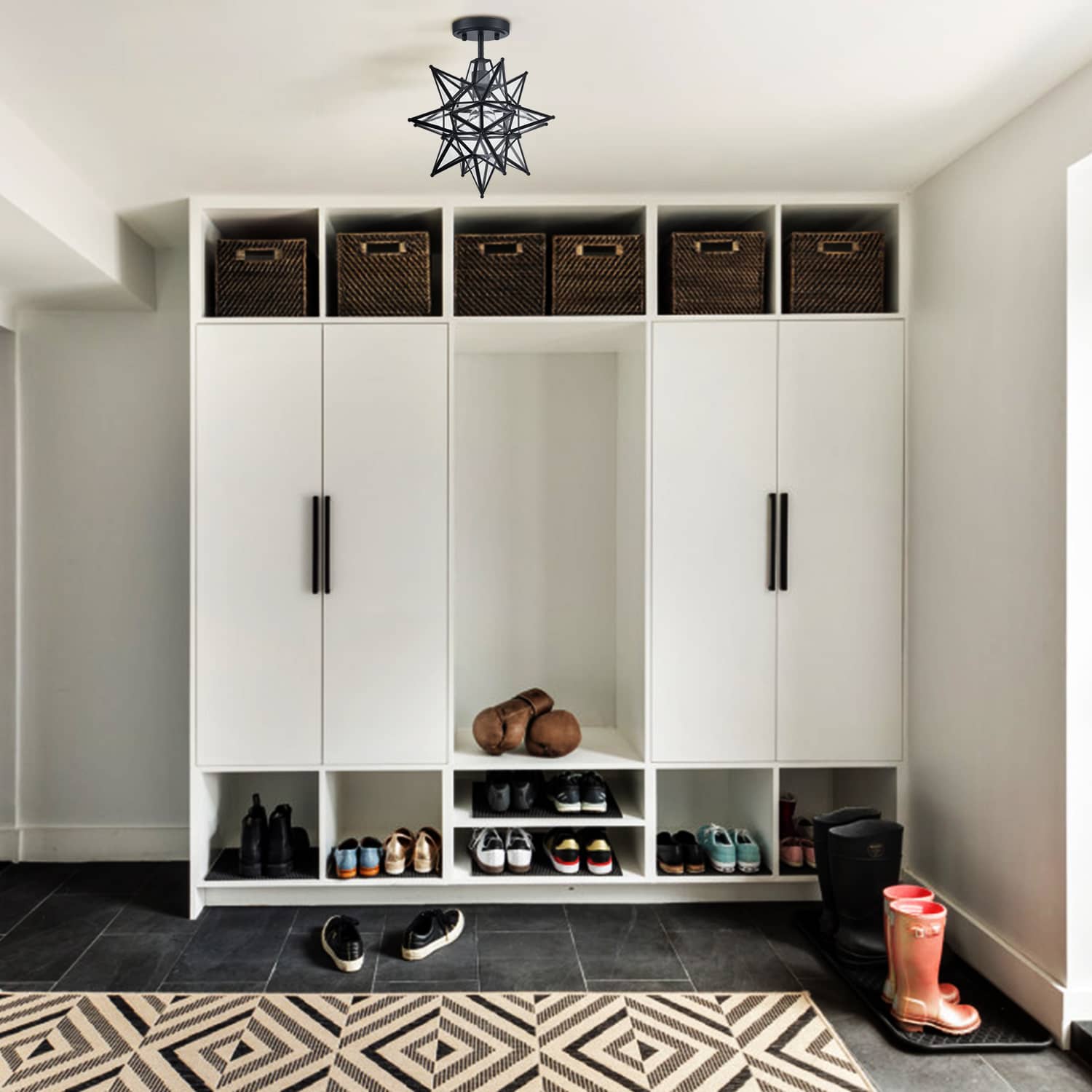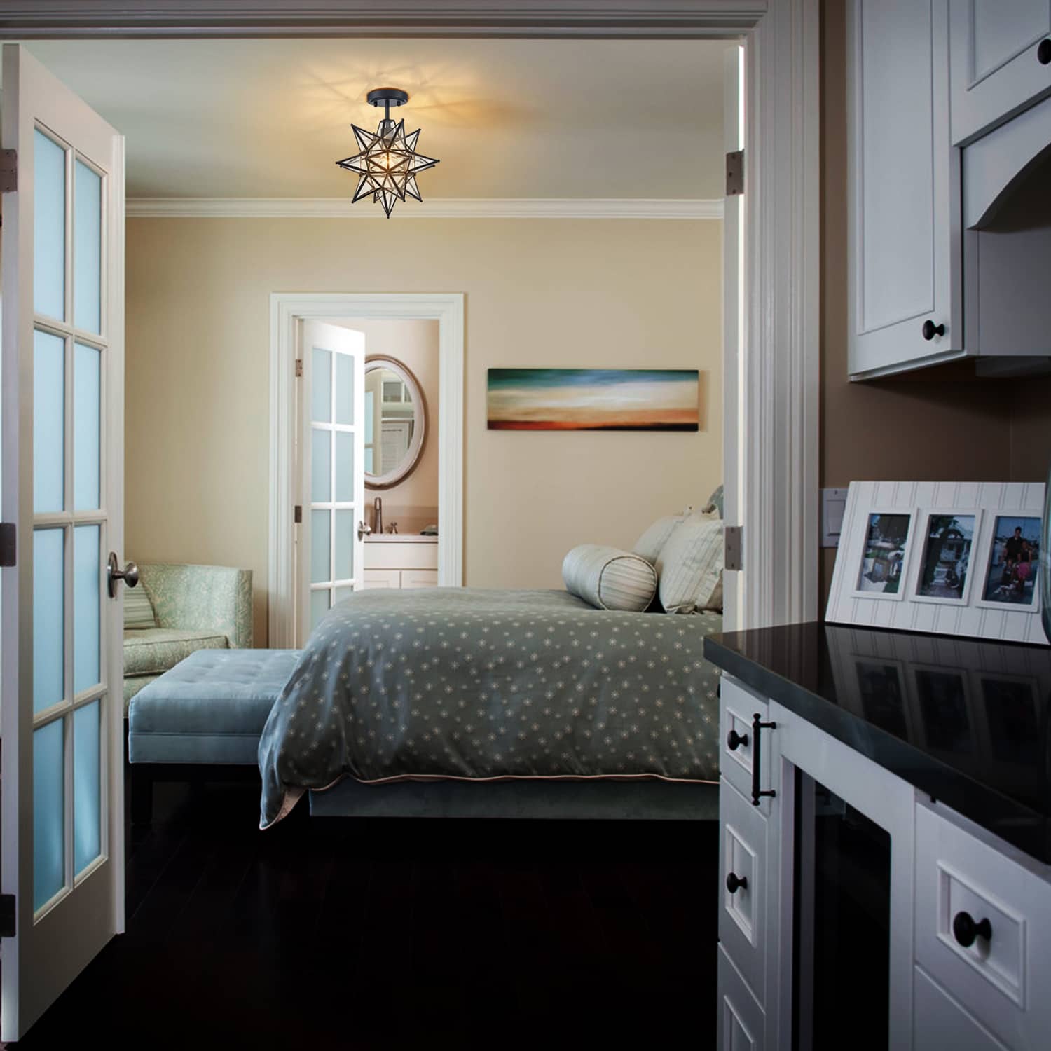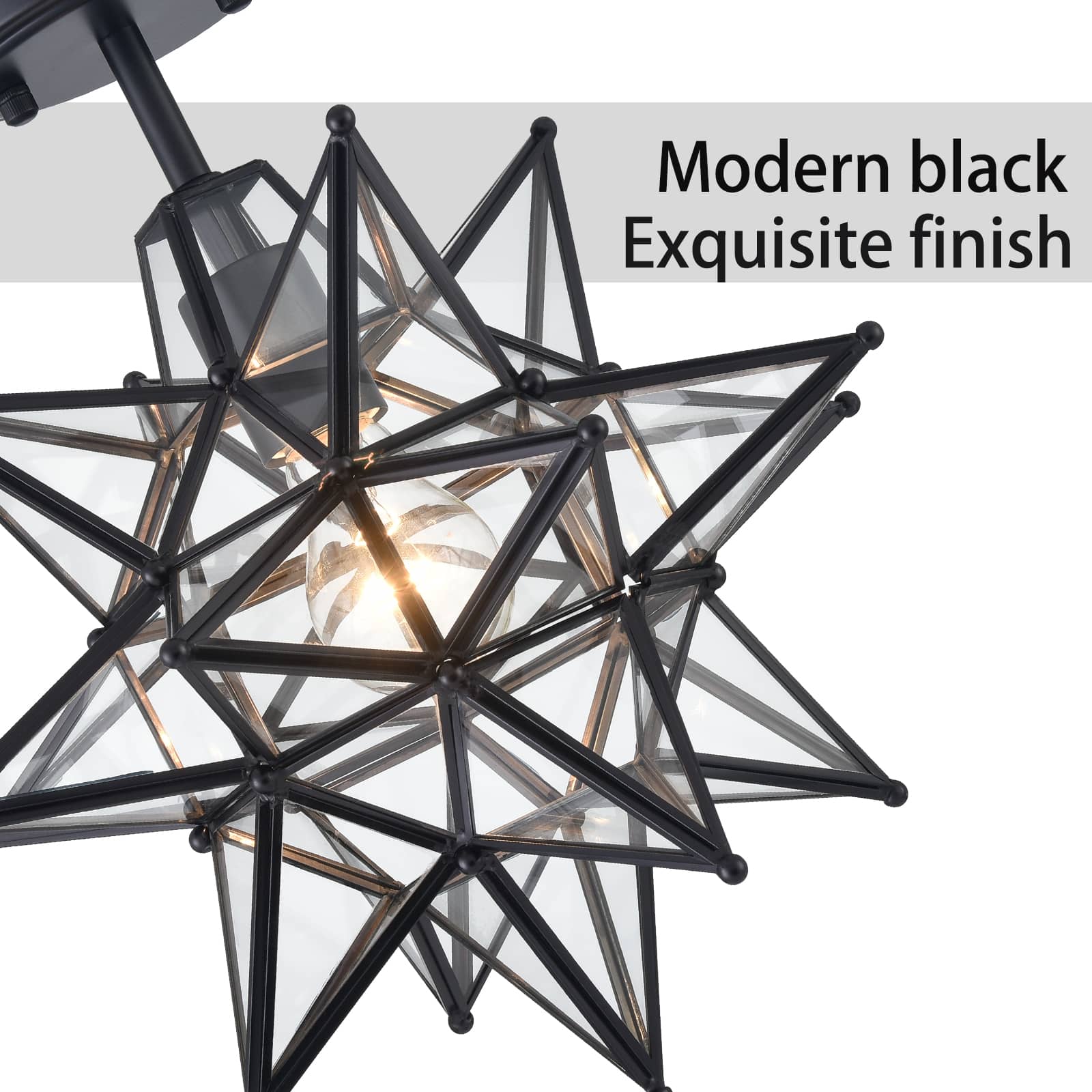 Crafted of impurity-free hand-blown clear glass, the glass shade of the Moravian star ceiling light is exquisitely hand-welded and pairs nicely with the black edges featuring copper alloy covering. It flaunts a rustproof semi-gloss black finish that adds a dash of drama to your living space. It brings a whimsical touch with its celestial-inspired design. A hinged access door can be opened for bulb replacement. It emits a subtle, amazing glow to create a wonderful ambiance.