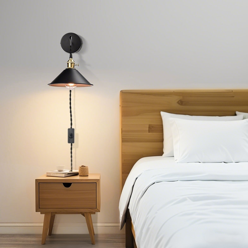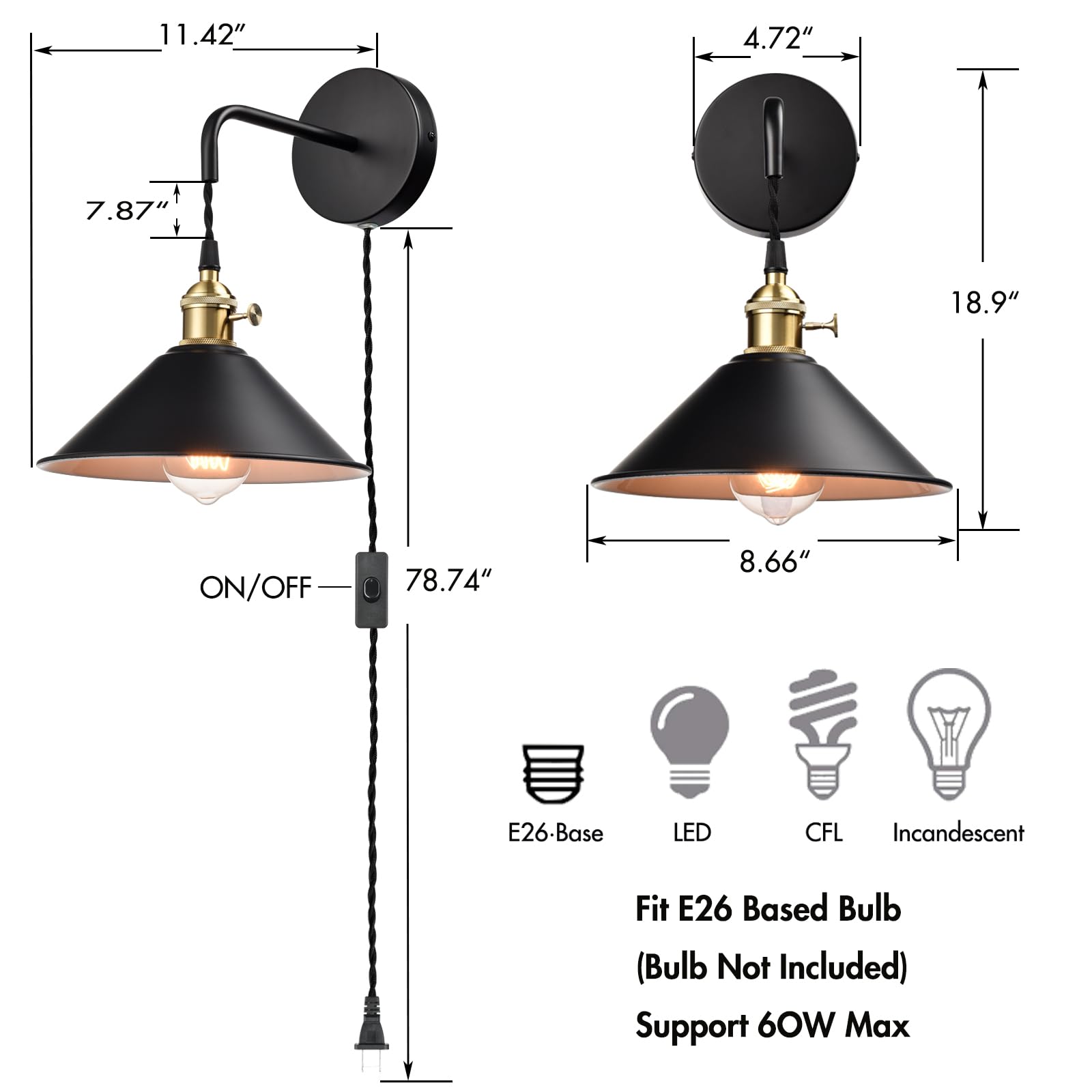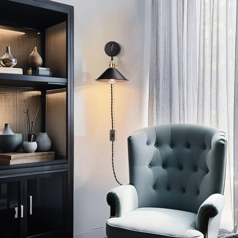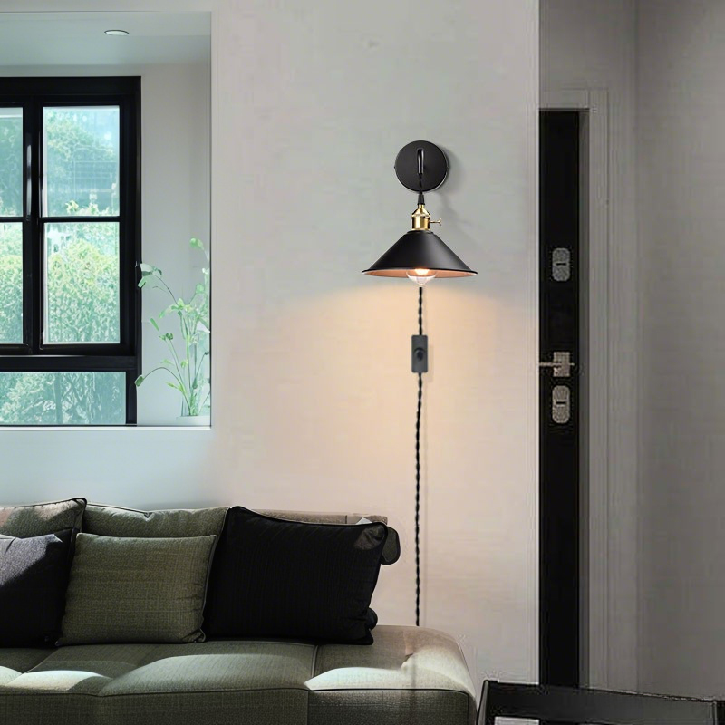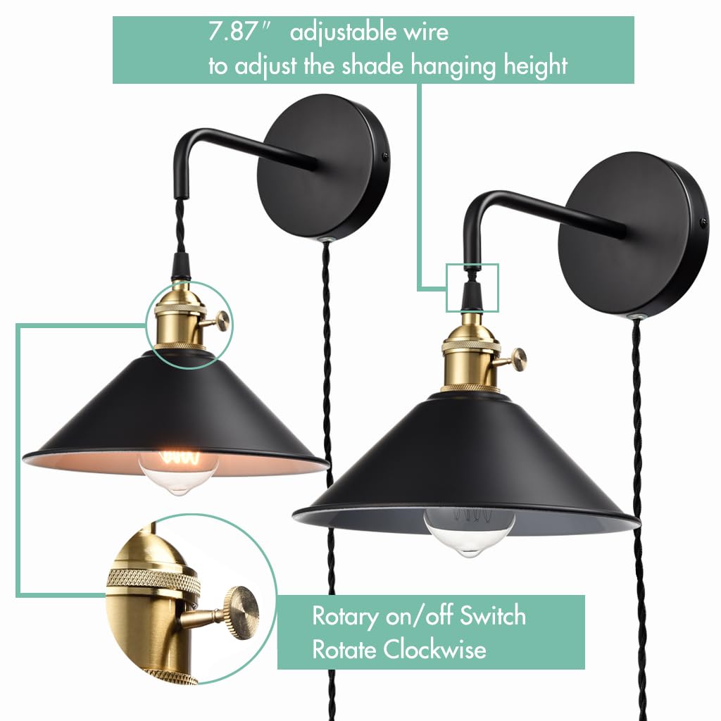 The industrial wall sconces’ cone shades, canopies, plug-in cords, and arms show off a black finish while their lamp holders and rotary switches flaunt a gold finish. The white interior of the cone shades helps reflect the light. A mix of finishes encompasses both a dash of drama and a touch of modernity, yet maintains an industrial edge. The industrial wall sconces’ cone shades round out the design and elevate your interior with a touch of geometry. Their shiny gold finish offers a stark contrast to the black finish and adds alluring eye appeal to the space. Feel free to turn on/off the wall lights with the rotary switch on the lamp holders or the on/off switch on the cords. Each light comes with a 78.74-inch adjustable plug-in cord to suit your lighting needs.