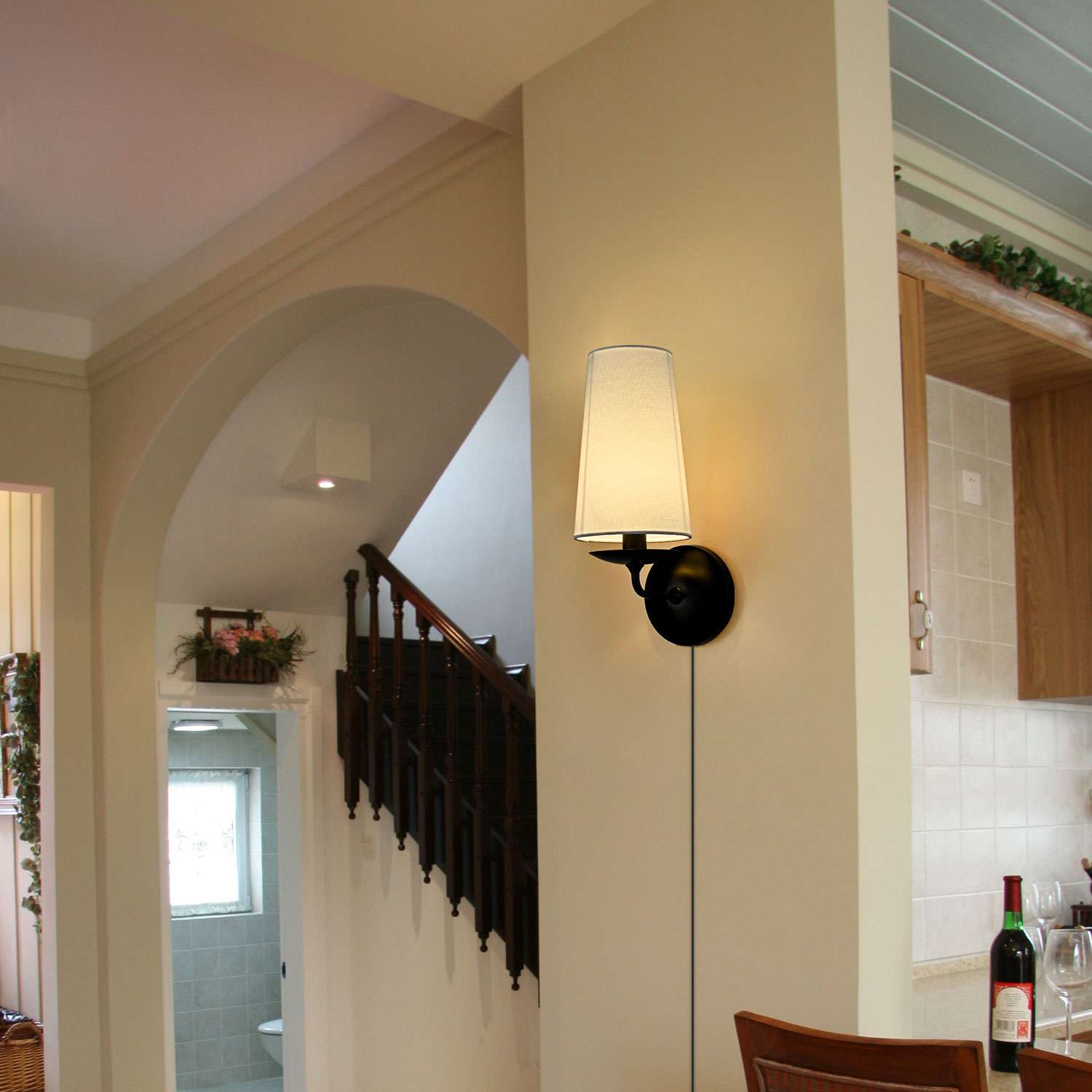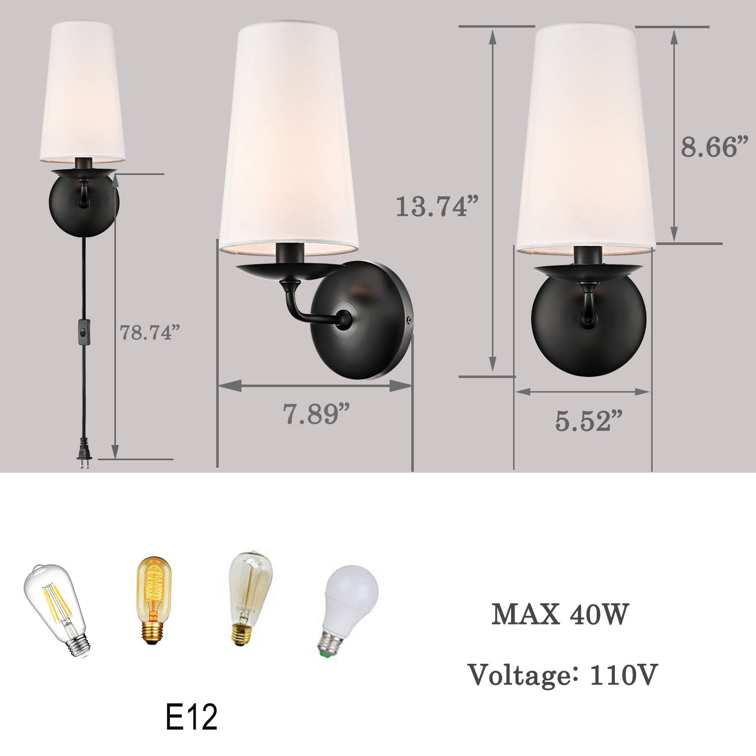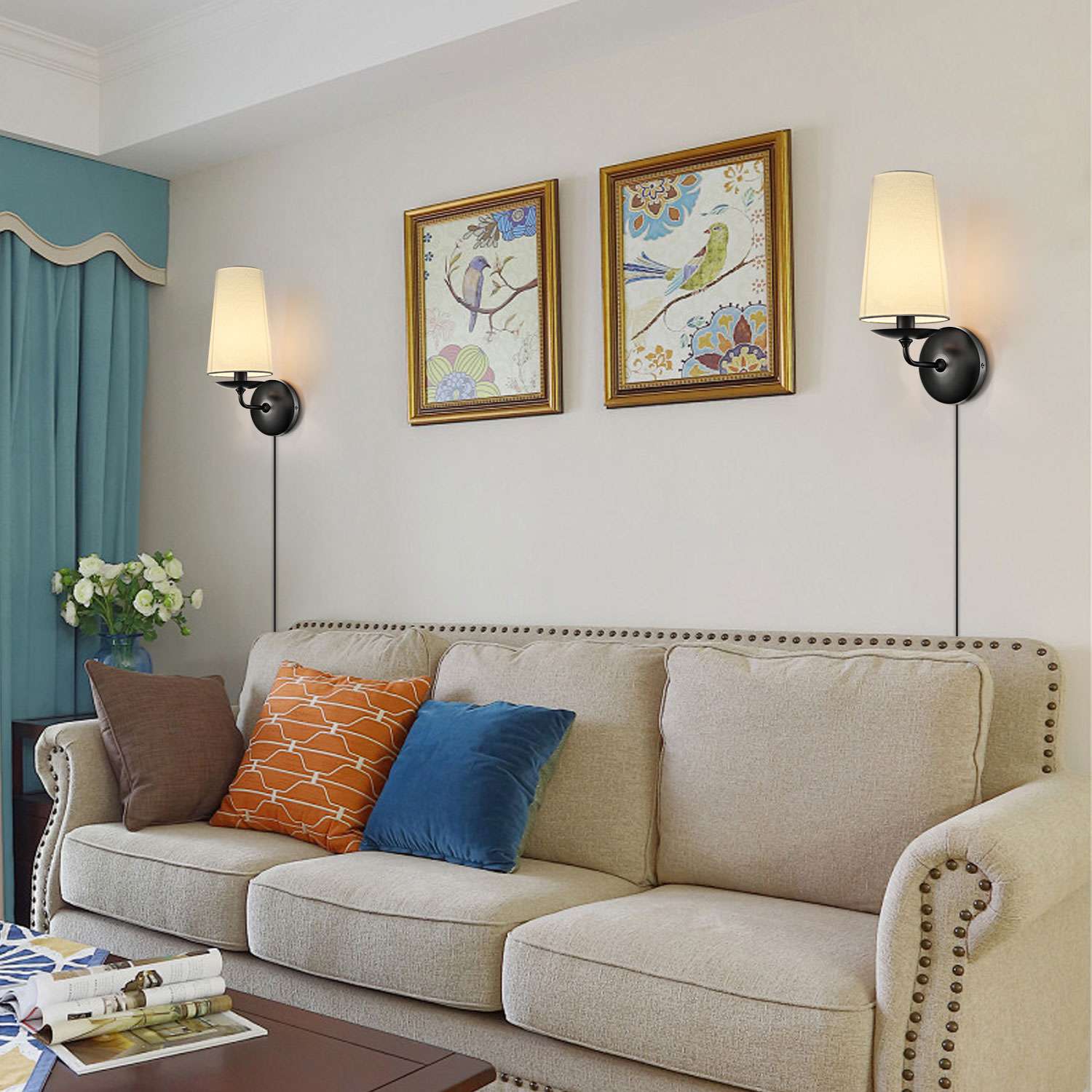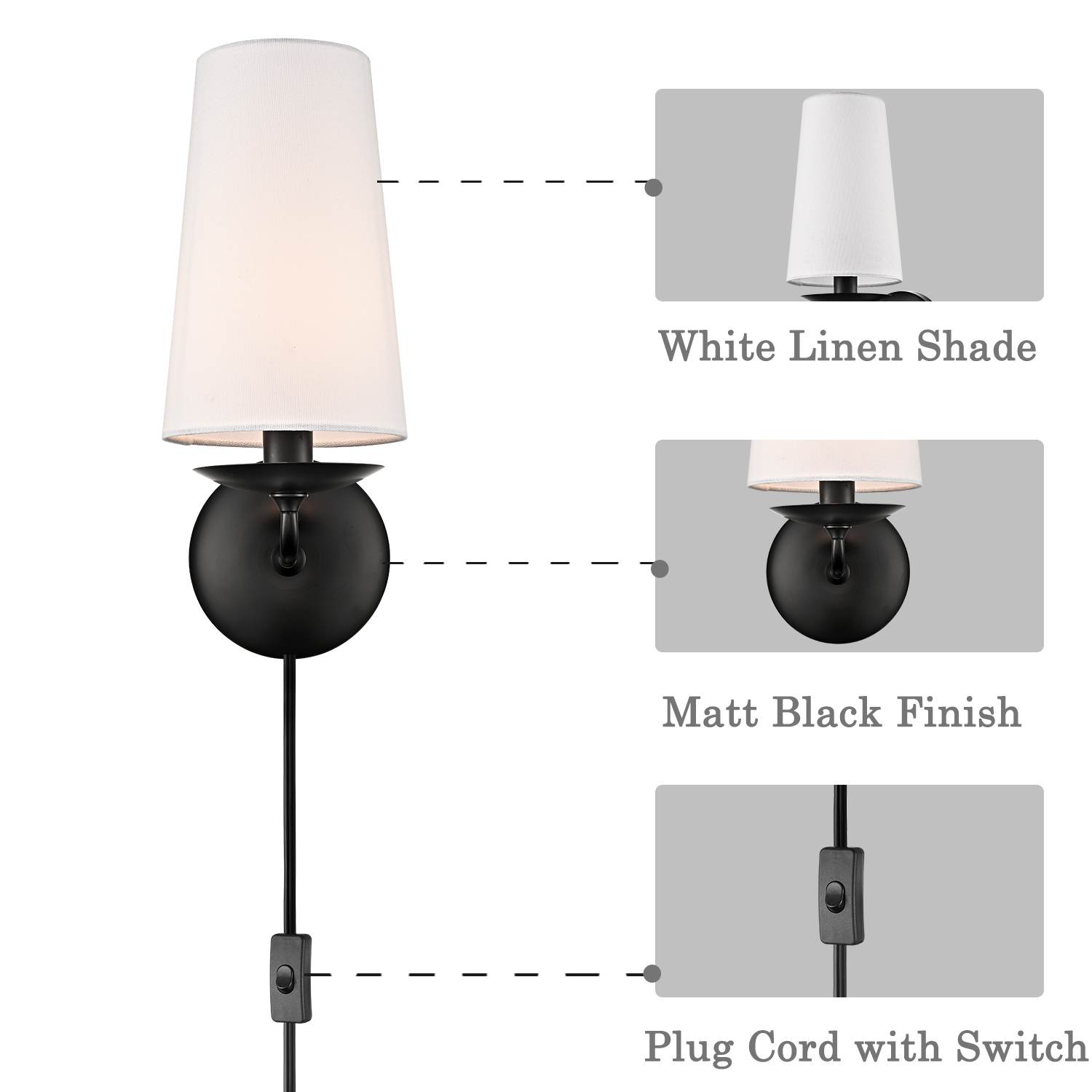 The black plug-in wall sconces’ canopies, lamp holders, and arms flaunt a rustproof semigloss black finish, sprucing up your interior with a dash of drama. Their elongated white linen cone shades cast an enchanting aura of elegance and make for a tasteful statement in your home. The light pouring through the linen lampshades is gently muted and fills the room without any glare. Their white linen cone shades contrast the black finish and add alluring visual interest to the living area. Each wall sconce comes with a 78.74-inch plug-in cord. The switches on the plug-in cords are just on/off switches without a dimming function.