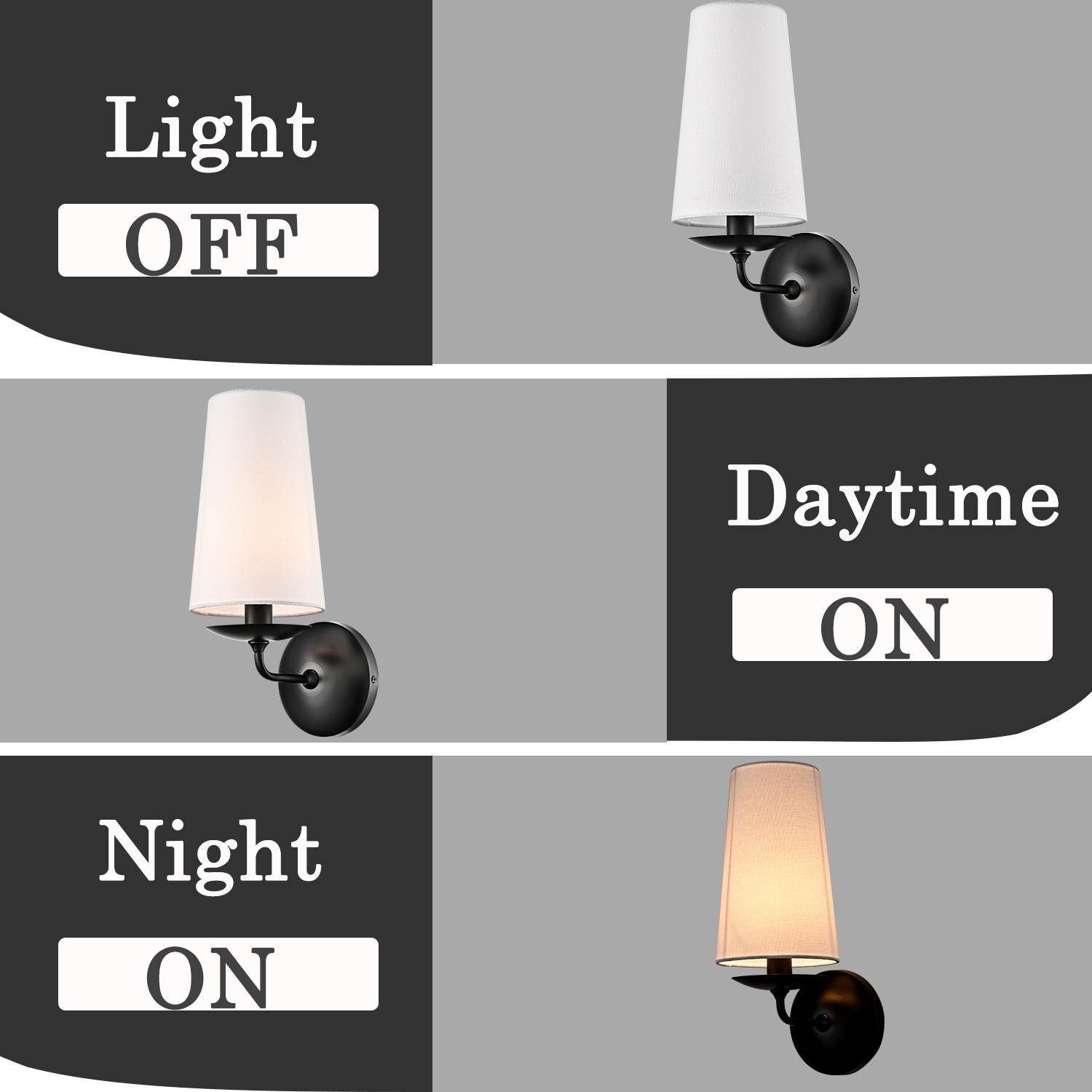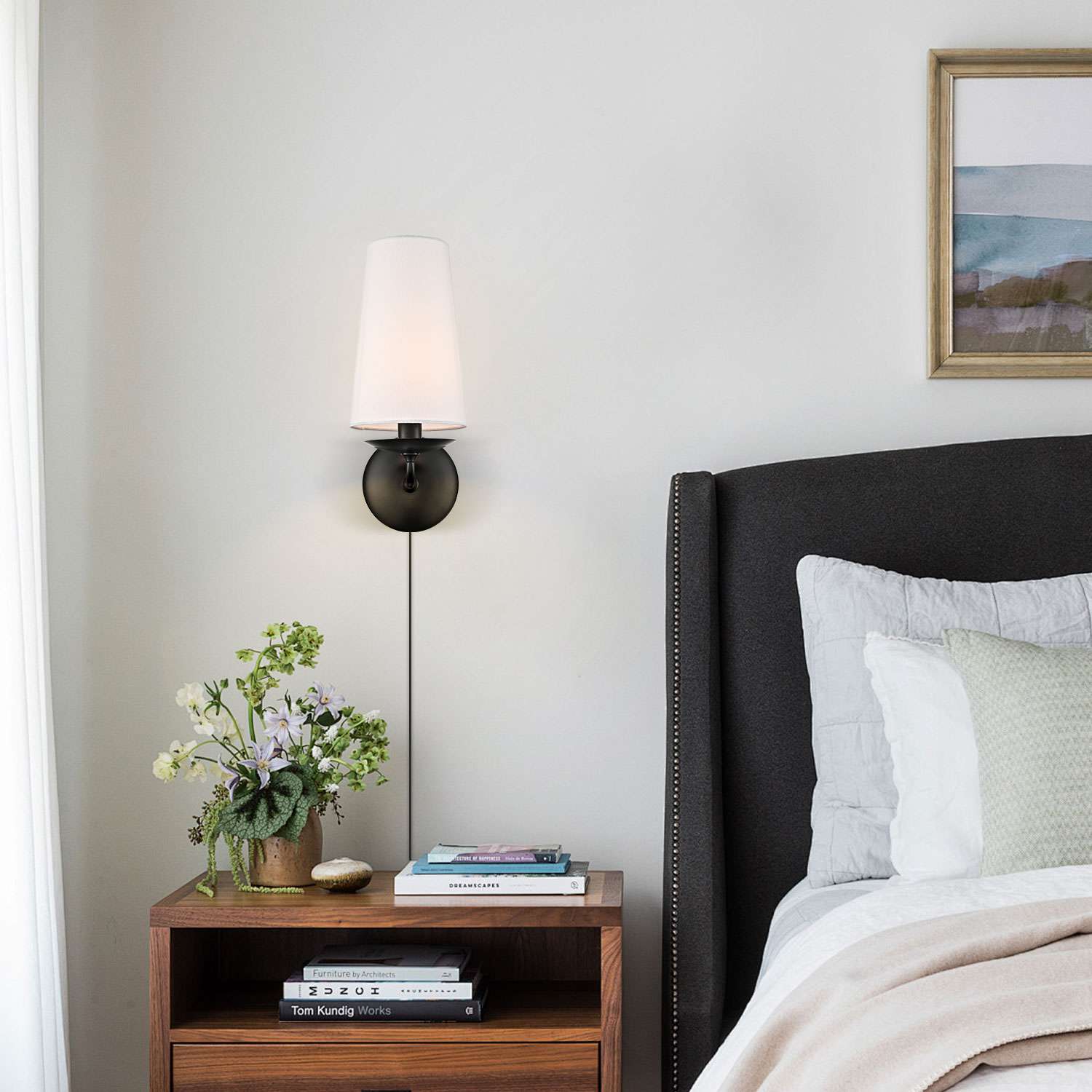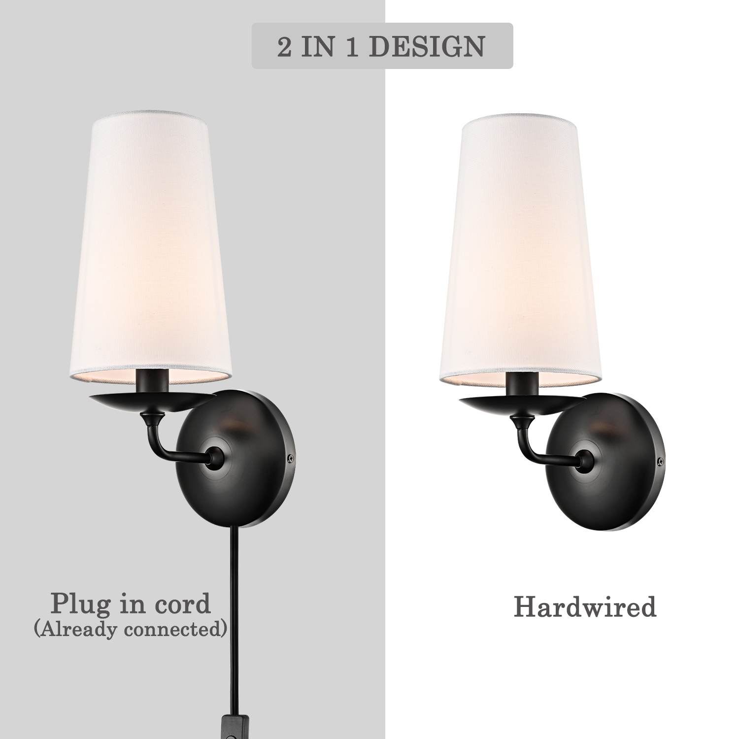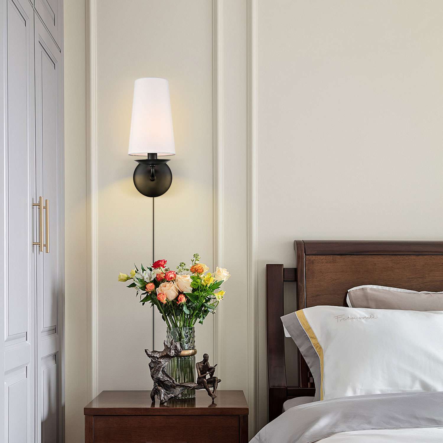 The black plug-in wall sconces’ canopies, lamp holders, and arms flaunt a rustproof semigloss black finish, sprucing up your interior with a dash of drama. Their elongated white linen cone shades cast an enchanting aura of elegance and make for a tasteful statement in your home. The light pouring through the linen lampshades is gently muted and fills the room without any glare. Their white linen cone shades contrast the black finish and add alluring visual interest to the living area. Each wall sconce comes with a 78.74-inch plug-in cord. The switches on the plug-in cords are just on/off switches without a dimming function.