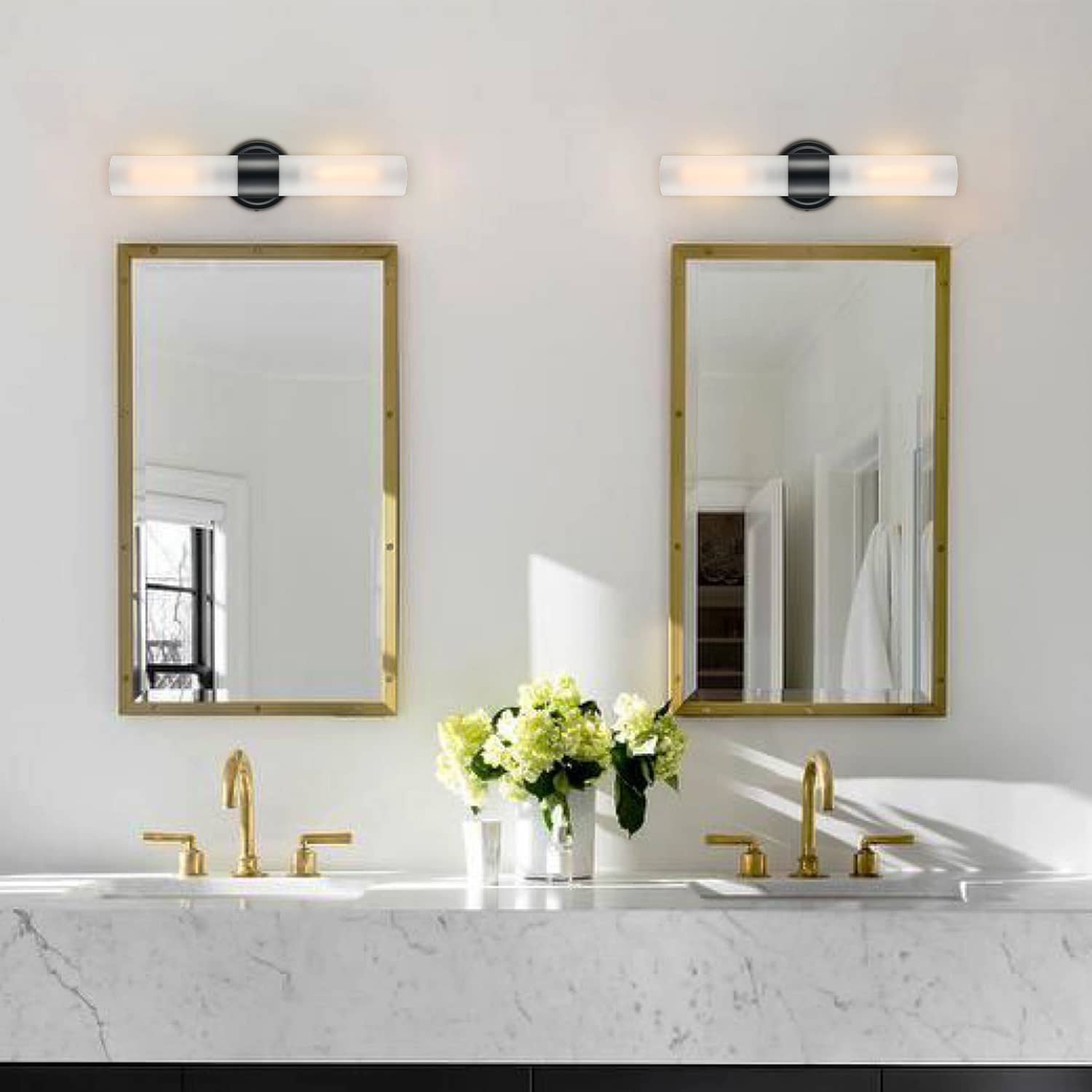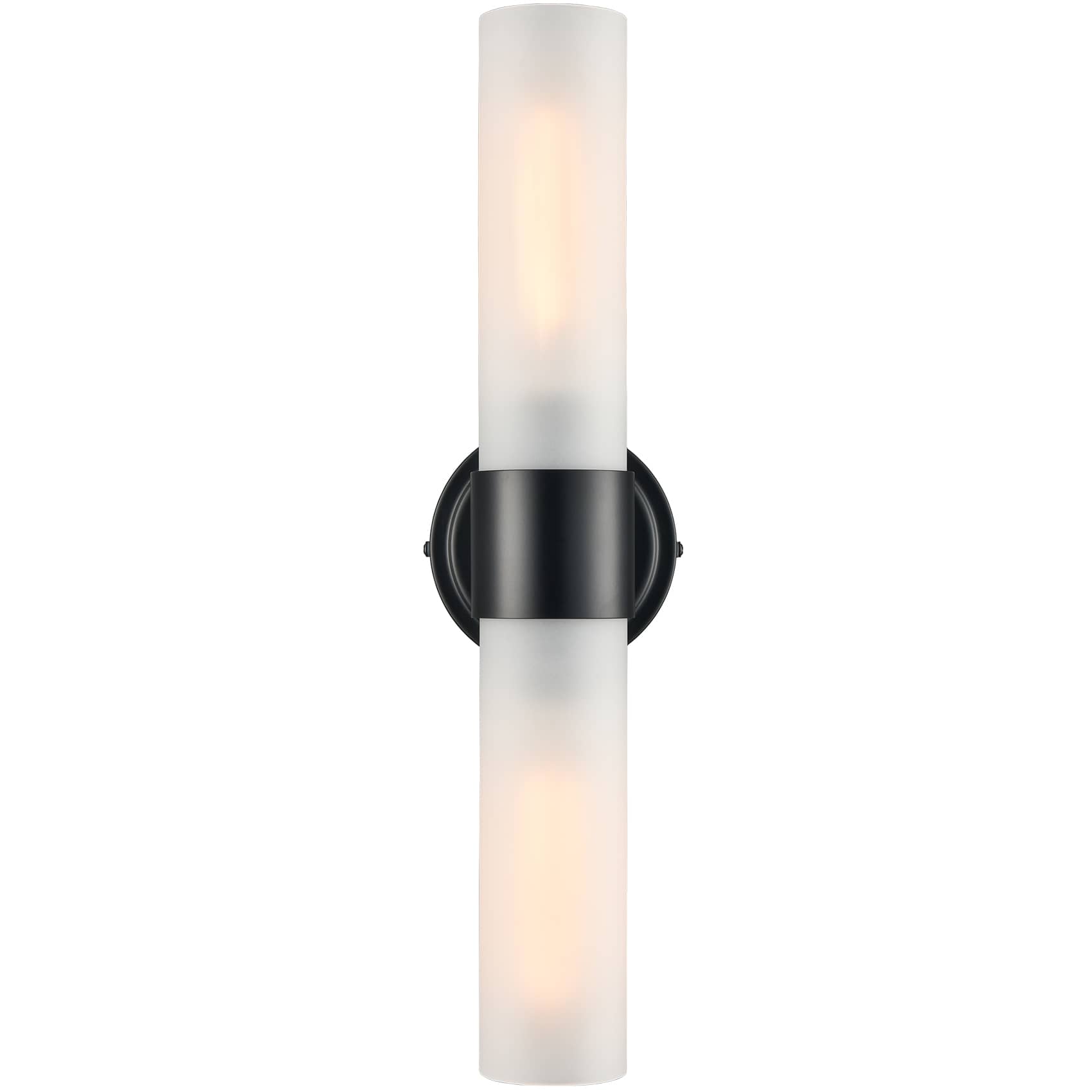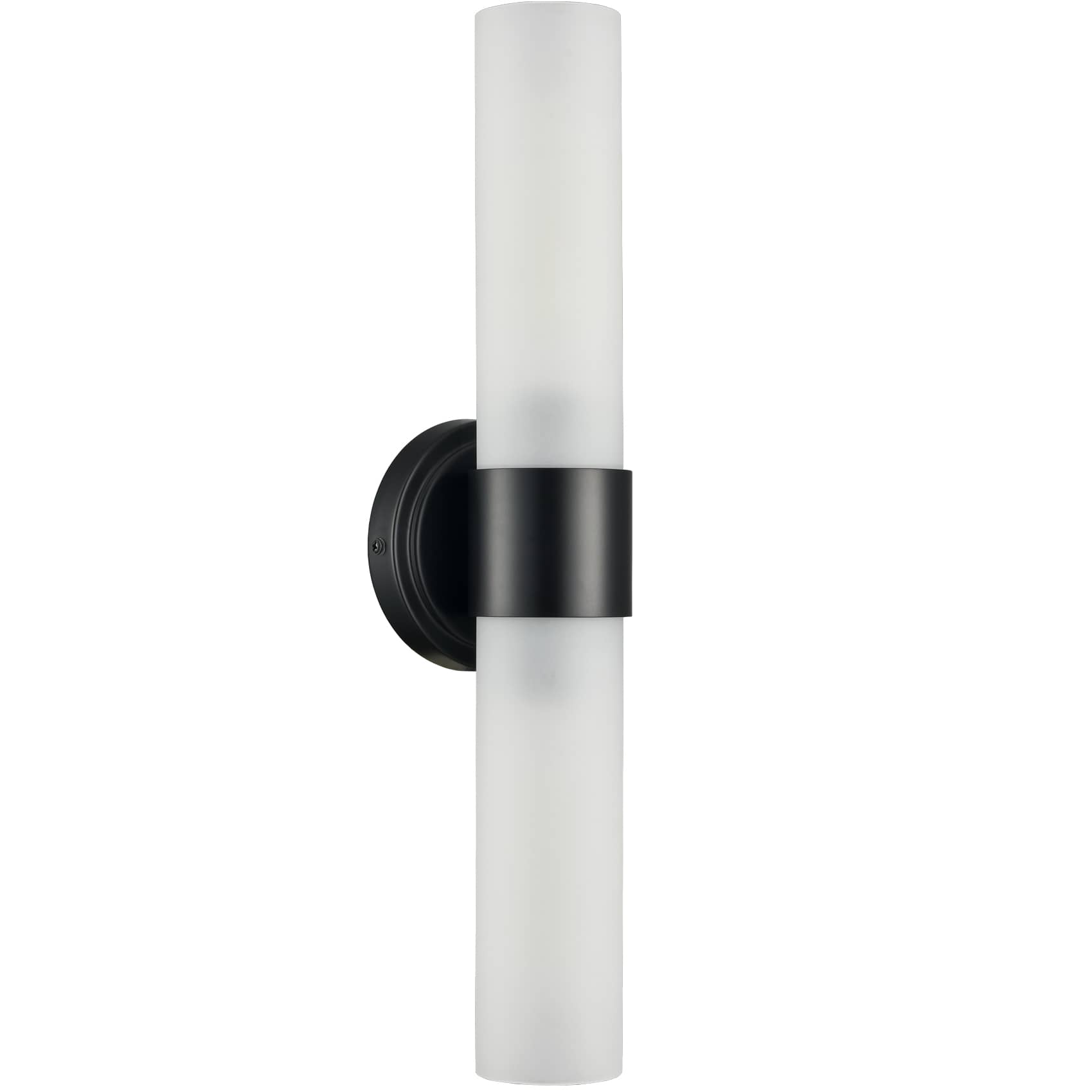 The modern black wall sconce flaunt a rustproof semigloss black finish, bringing a dash of drama and dramatic decorative impact to your home. It shows off an elongated cylinder shade crafted from impurity-free explosion-proof frosted glass. The shade is designed to encircle two candelabra-inspired sockets to complete the aesthetic. It is held aloft by a black metal ring in the middle of the glass shade. Its cylinder shade contrasts the black finish and adds alluring visual interest to the living area. It can be installed horizontally or vertically.