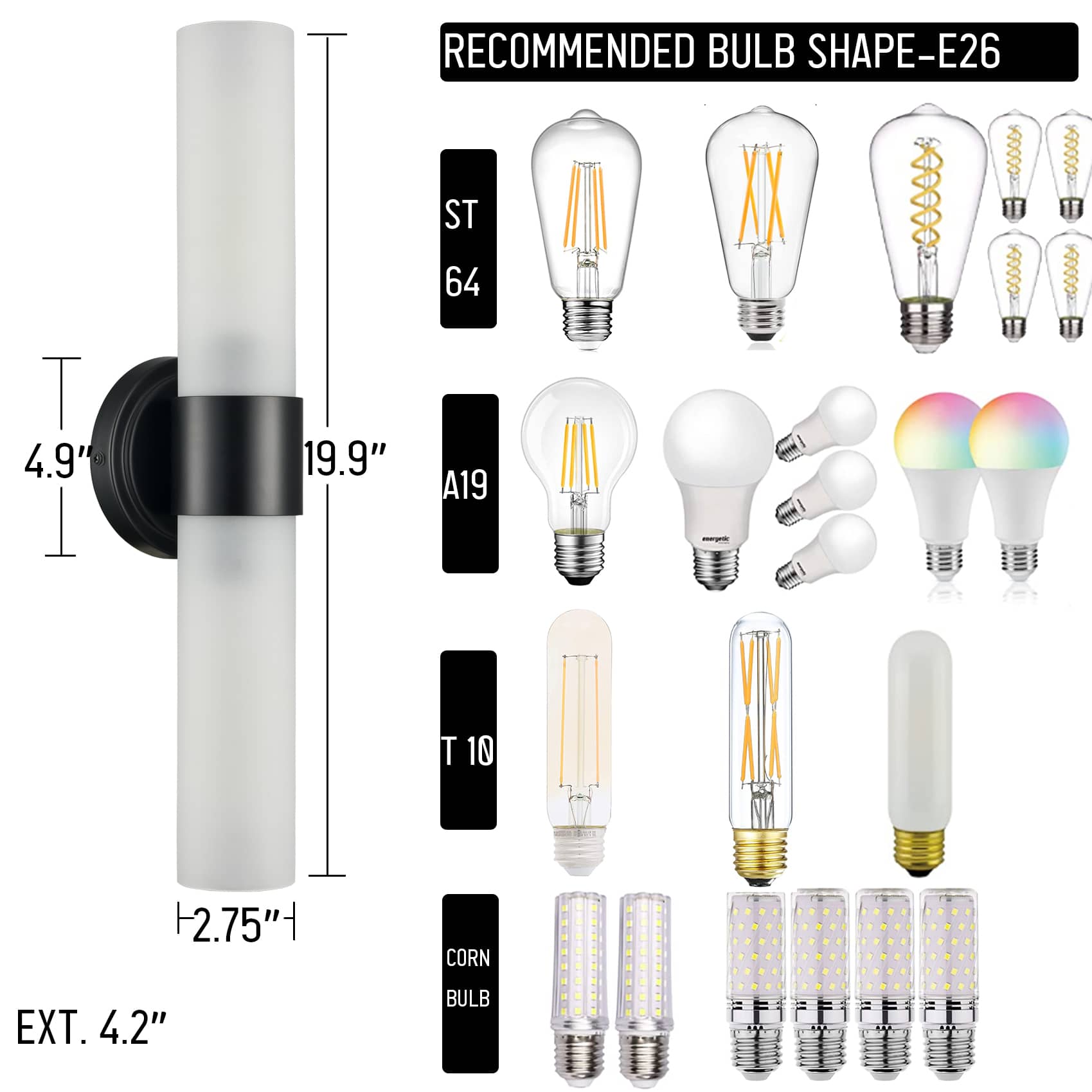 The modern black wall sconce comes with 2 E26-base sockets which are compatible with a variety of bulb types: LED, INCANDESCENT, and CFL.