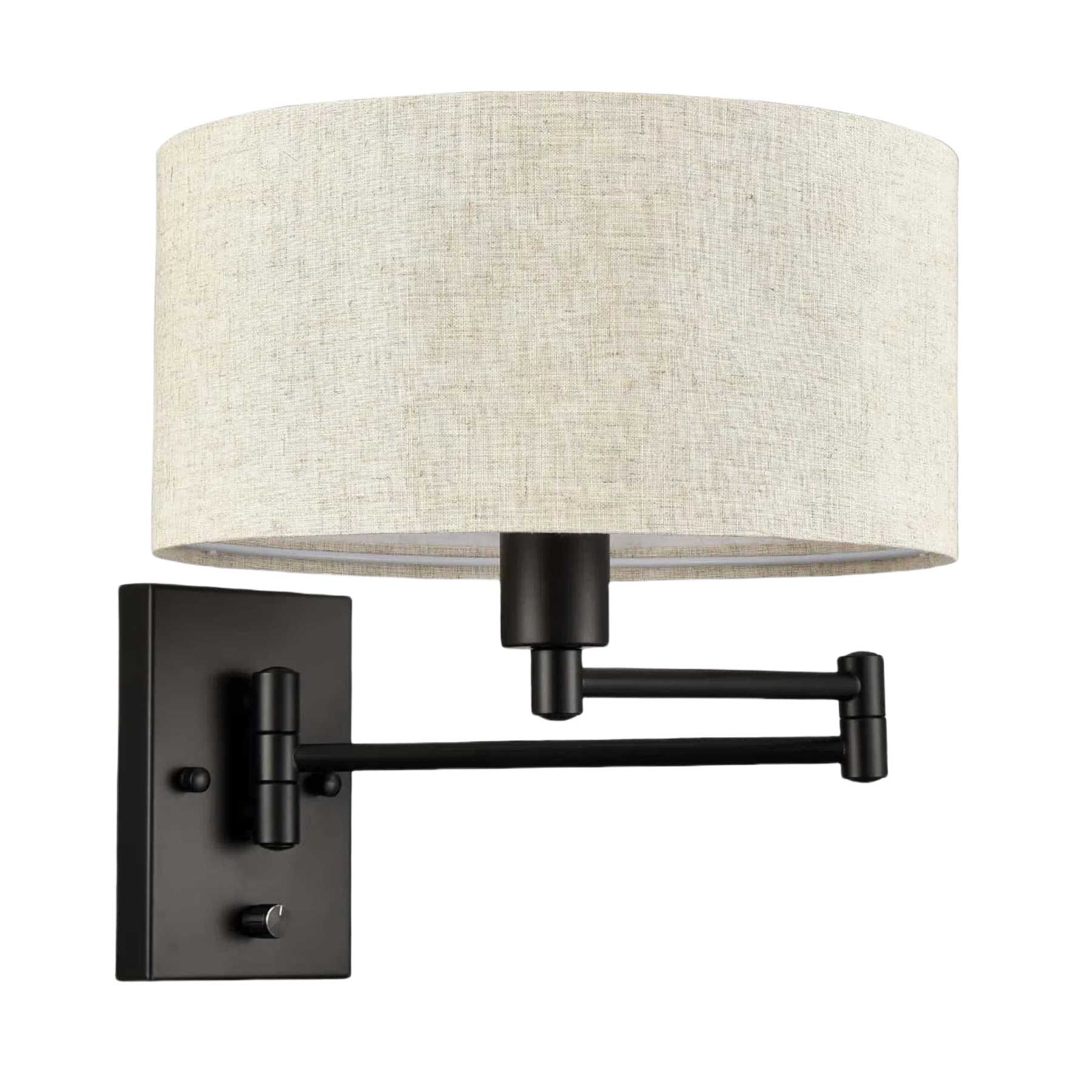 The wall sconces are dressed in a black finish, oozing a retro-chic to your space. Their beige linen drum shade complete the aesthetic with a large dose of texture. Their double-jointed swing arms can be adjusted to direct light where it is needed most.