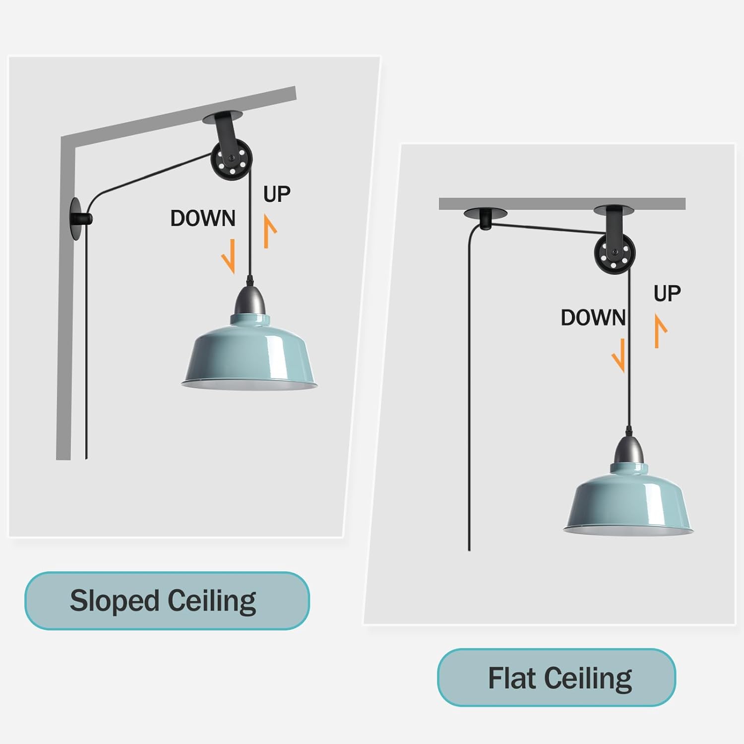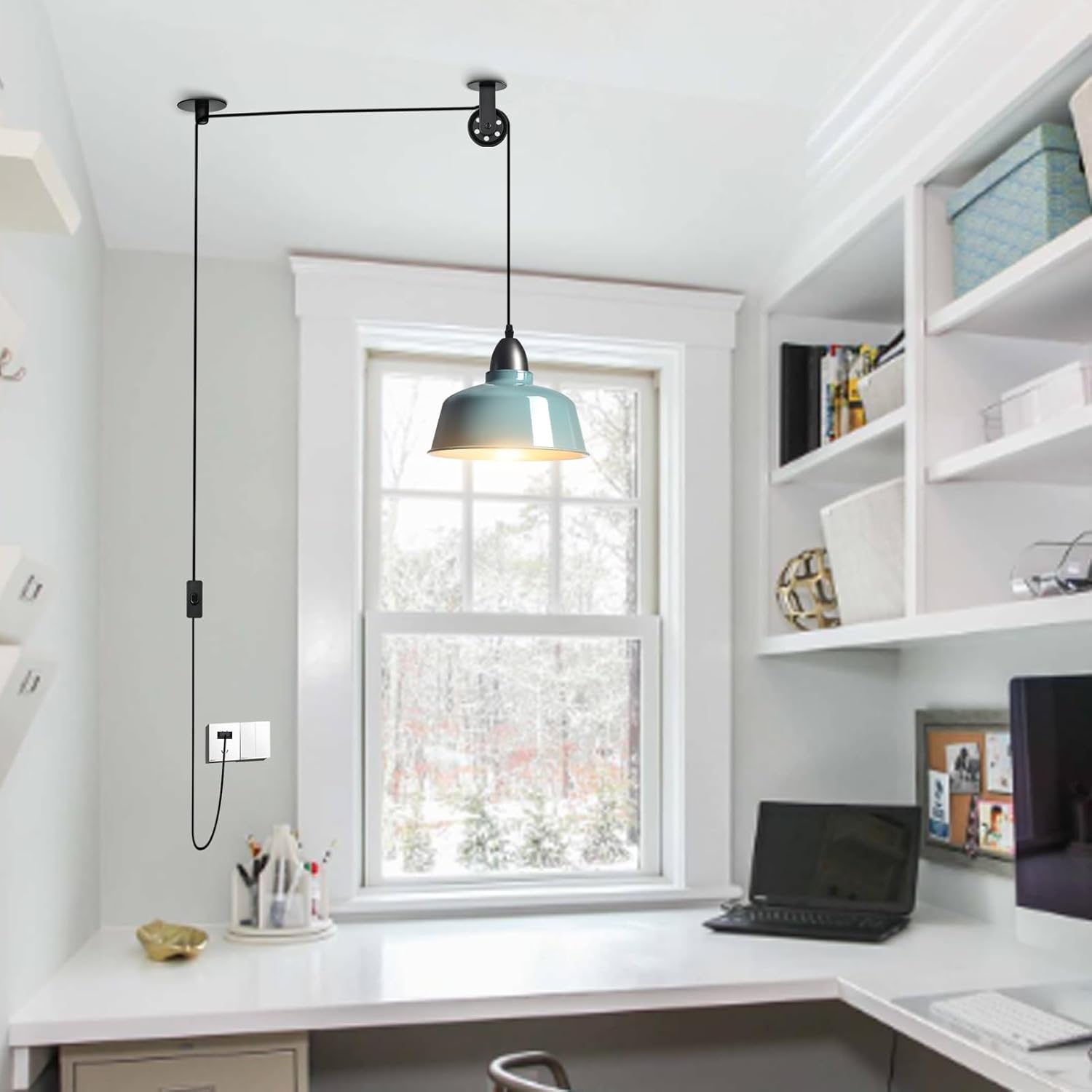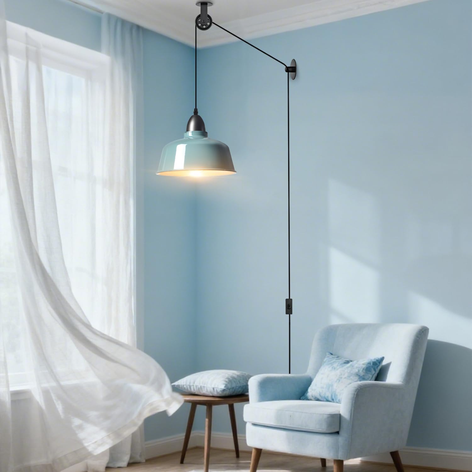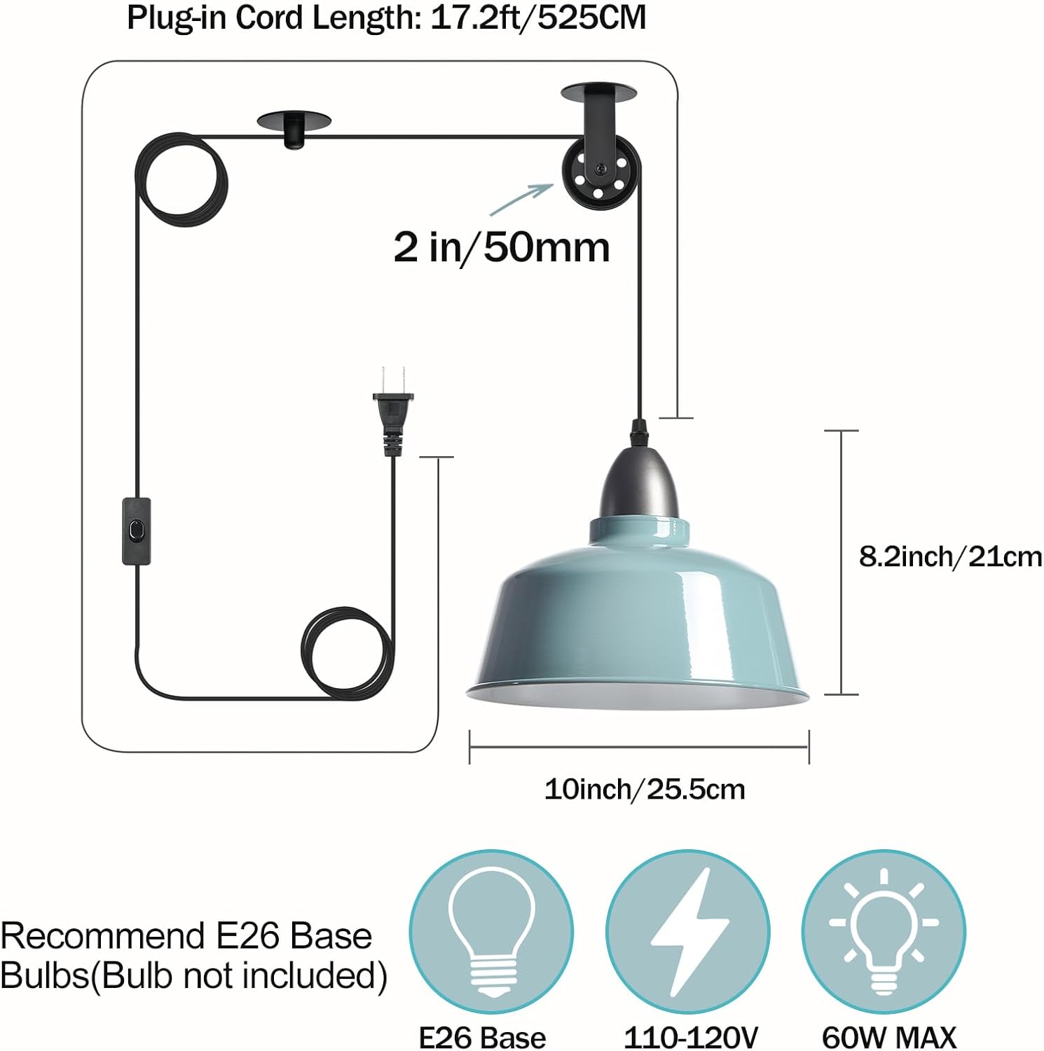 The plug-in pendant light's lamp holder is coated in a dark gray finish while its barn shade flaunts a pale turquoise finish. The barn shade boasts a white finish on the inner surface. Its plug-in cord and pulley are dressed in black. Its pale turquoise lampshade gives your home a snappy look and a glamorous, refreshing vibe. Its dark gray lamp holder, black cord, and black pulley offer a stark contrast to the pale turquoise barn shade and add alluring eye appeal to the interior. It is equipped with a strong pulley for stable hanging. It will not deform in long-term use. Feel free to adjust the height of the pendant light to suit your different lighting needs. It comes with a 17.2-foot plug-in cord and is slope ceiling adaptable. The switch on the plug-in cord is just an on/off switch without a dimming function.