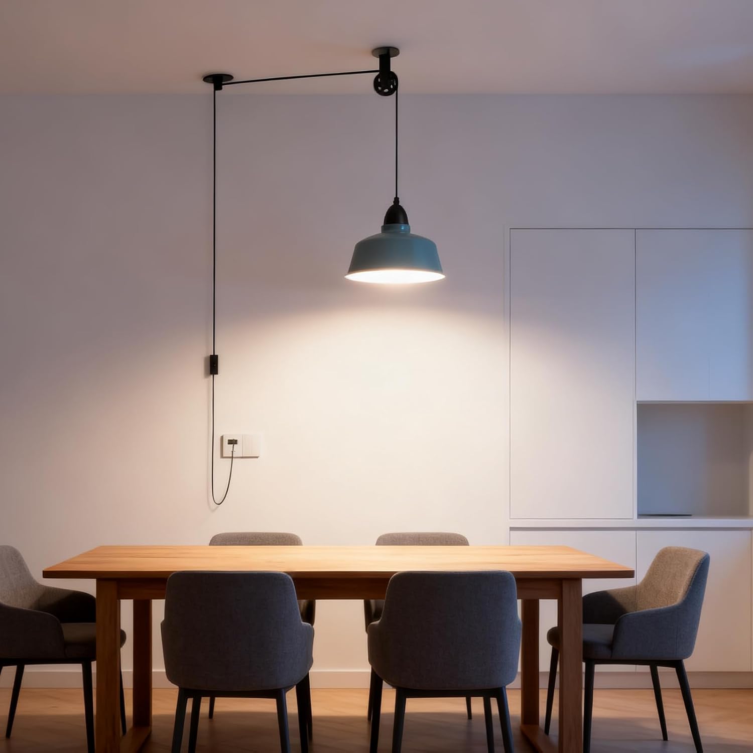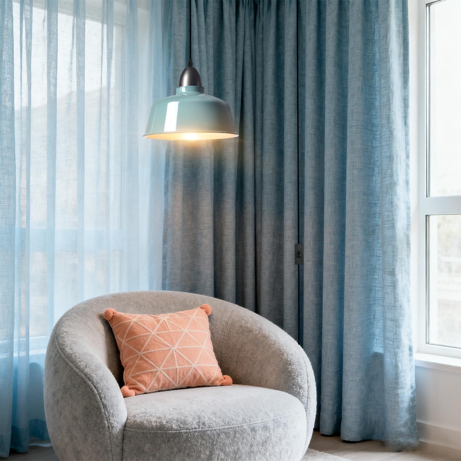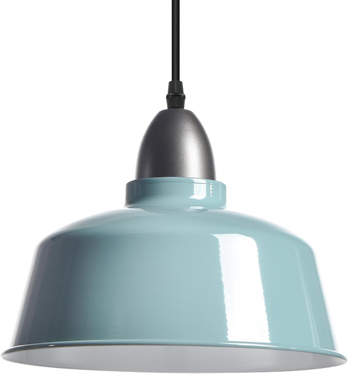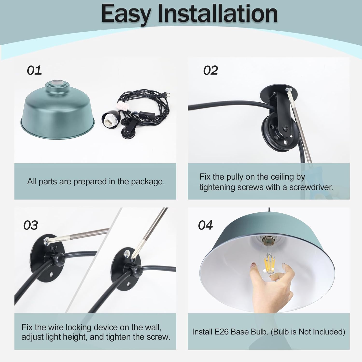 The plug-in pendant light's lamp holder is coated in a dark gray finish while its barn shade flaunts a pale turquoise finish. The barn shade boasts a white finish on the inner surface. Its plug-in cord and pulley are dressed in black. Its pale turquoise lampshade gives your home a snappy look and a glamorous, refreshing vibe. Its dark gray lamp holder, black cord, and black pulley offer a stark contrast to the pale turquoise barn shade and add alluring eye appeal to the interior. It is equipped with a strong pulley for stable hanging. It will not deform in long-term use. Feel free to adjust the height of the pendant light to suit your different lighting needs. It comes with a 17.2-foot plug-in cord and is slope ceiling adaptable. The switch on the plug-in cord is just an on/off switch without a dimming function.