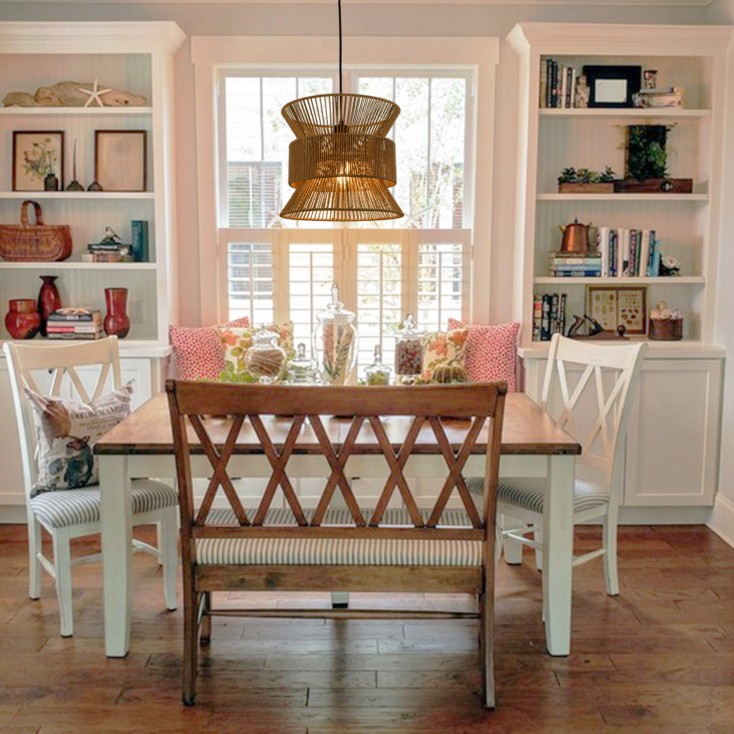 I am absolutely IN LOVE with this Rattan Pendant light! It is just gorgeous! The fibers are high quality and placed with robust precision, balance, and uniformity. It is clear that the woven, artistic aspects of the fixture are made to last and won't quickly or easily come undone or crack. It is a very beautiful addition to our home and an eye pleasing centerpiece for our room. The installation was a breeze and will be easily understandable for anyone looking to install it as well. With all of these factors considered, I find it to be a bargain of a buy and pleasing to anyone who decides to make it a part of their home.