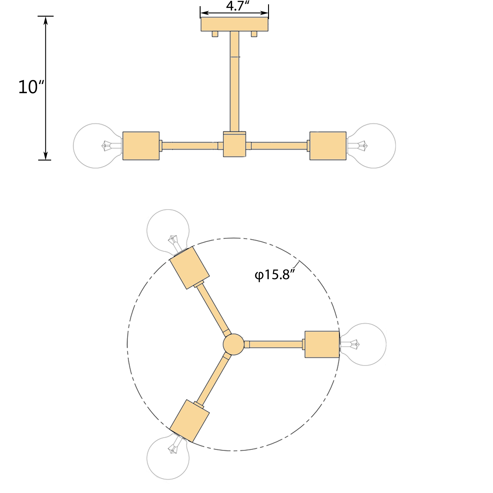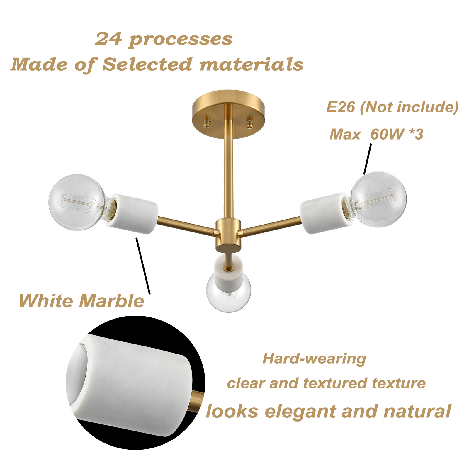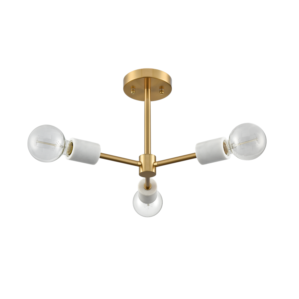The 3-light sputnik ceiling lighting’s canopy, hanging rod, and arms sport an electrophoretic brass finish, making your home fizz with a pop of personality. Its lampholders are accented with a white finish with marbling. A mix of finishes encompasses both shiny accent and mid-century elements, yet maintains an industrial edge. It is inspired by the look of a fan, with the exposed bulbs and arms taking the place of the blades. The white lamp holders contrast the brass finish, adding a ton of eye appeal and enhancing the piece's visual depth and beauty even further. It can be a new showpiece for your bar, bedroom, dining room, entryway, foyer, hallway, kids room, kitchen, and living room.