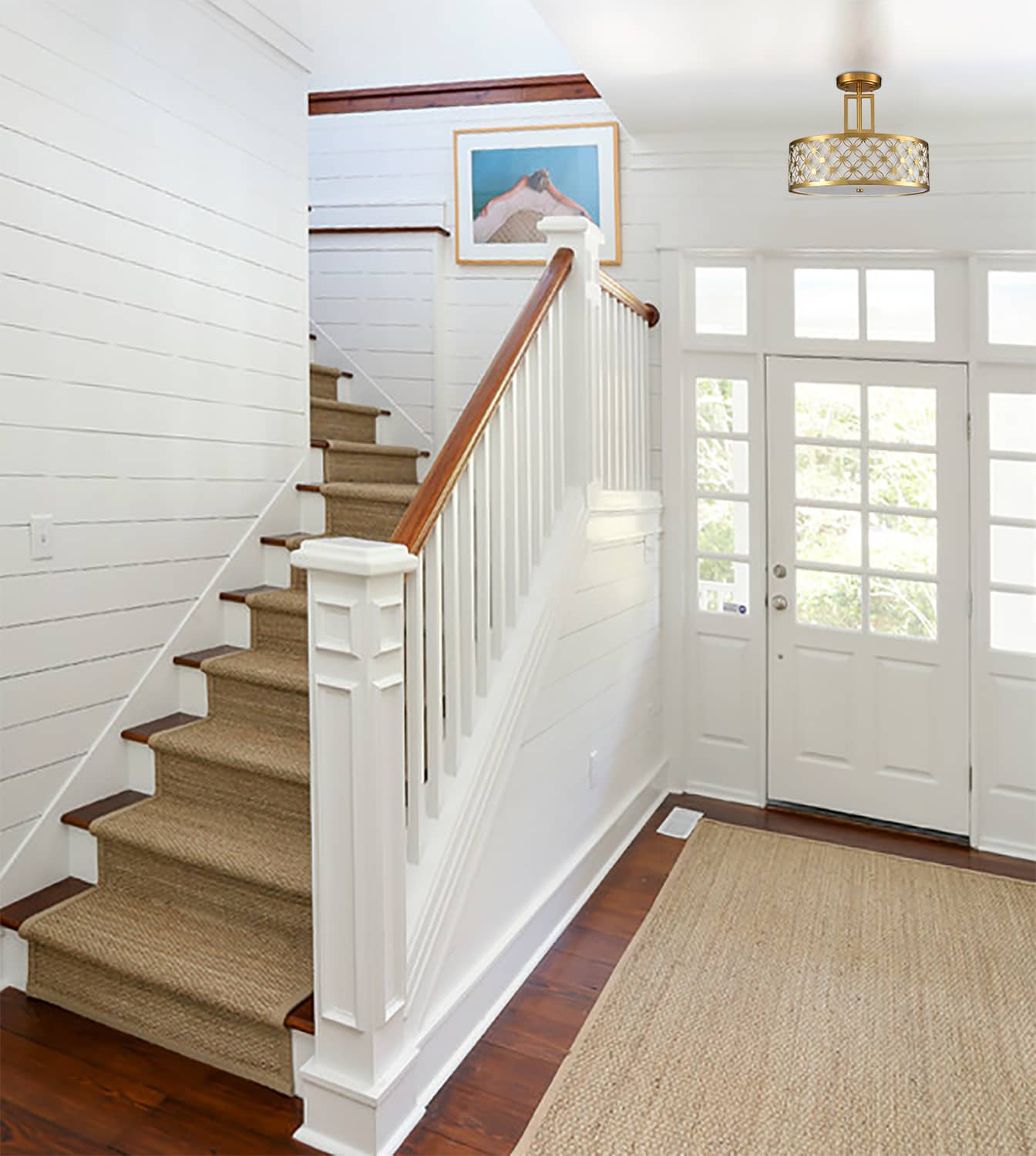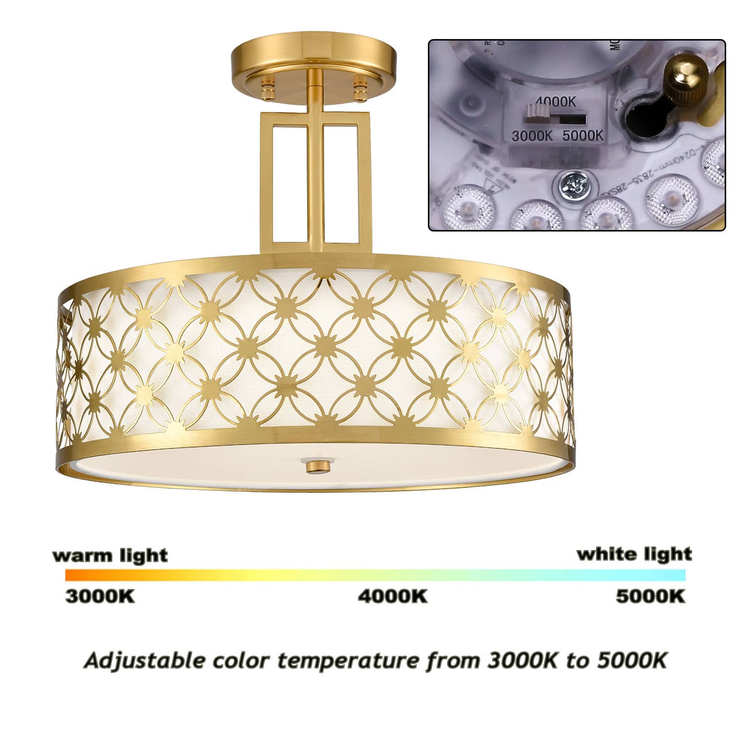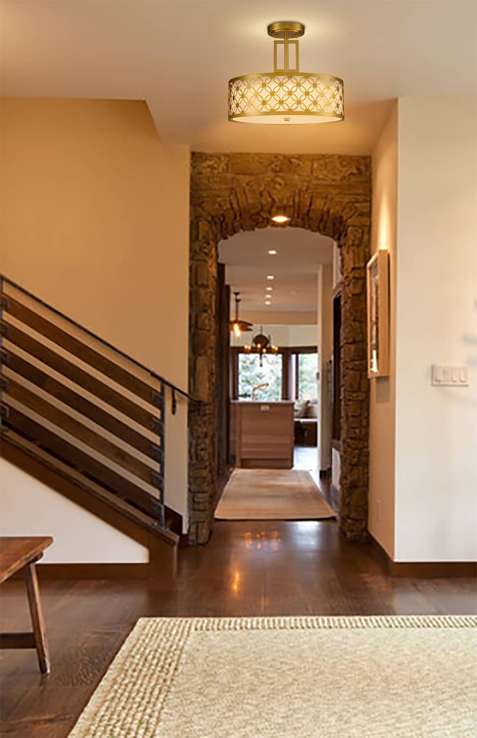 The linen shade led semi flush mount ceiling light fixture’s canopy, lamp-holder, bottom accent, and airy cage are coated in an electrophoretic brass finish. Its creamy white linen drum shade is protected by an airy metal cage featuring conjoining circles and floral patterns, creating a look that is sure to be noticed. The light pouring through the fabric lampshade is gently muted and fills the room without any glare. The linen shade led semi flush mount ceiling light fixture is an attention-grabbing addition to your space with its shimmery finish.