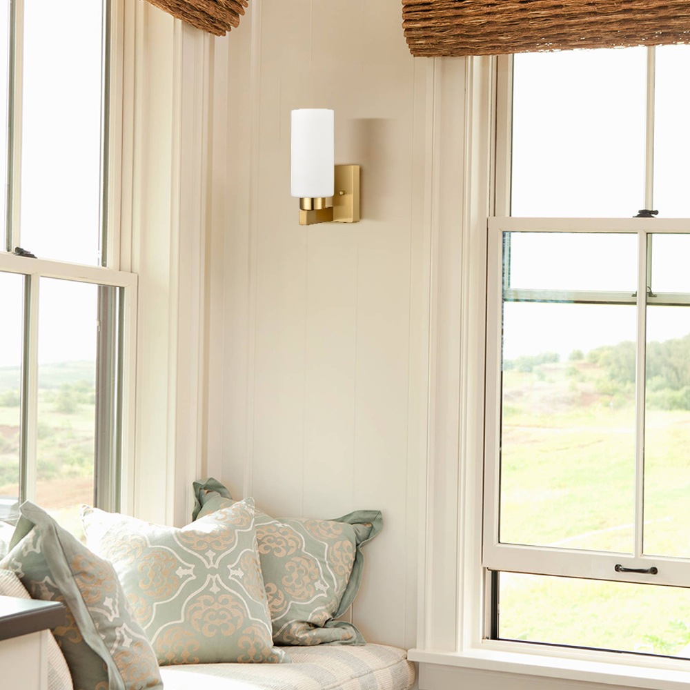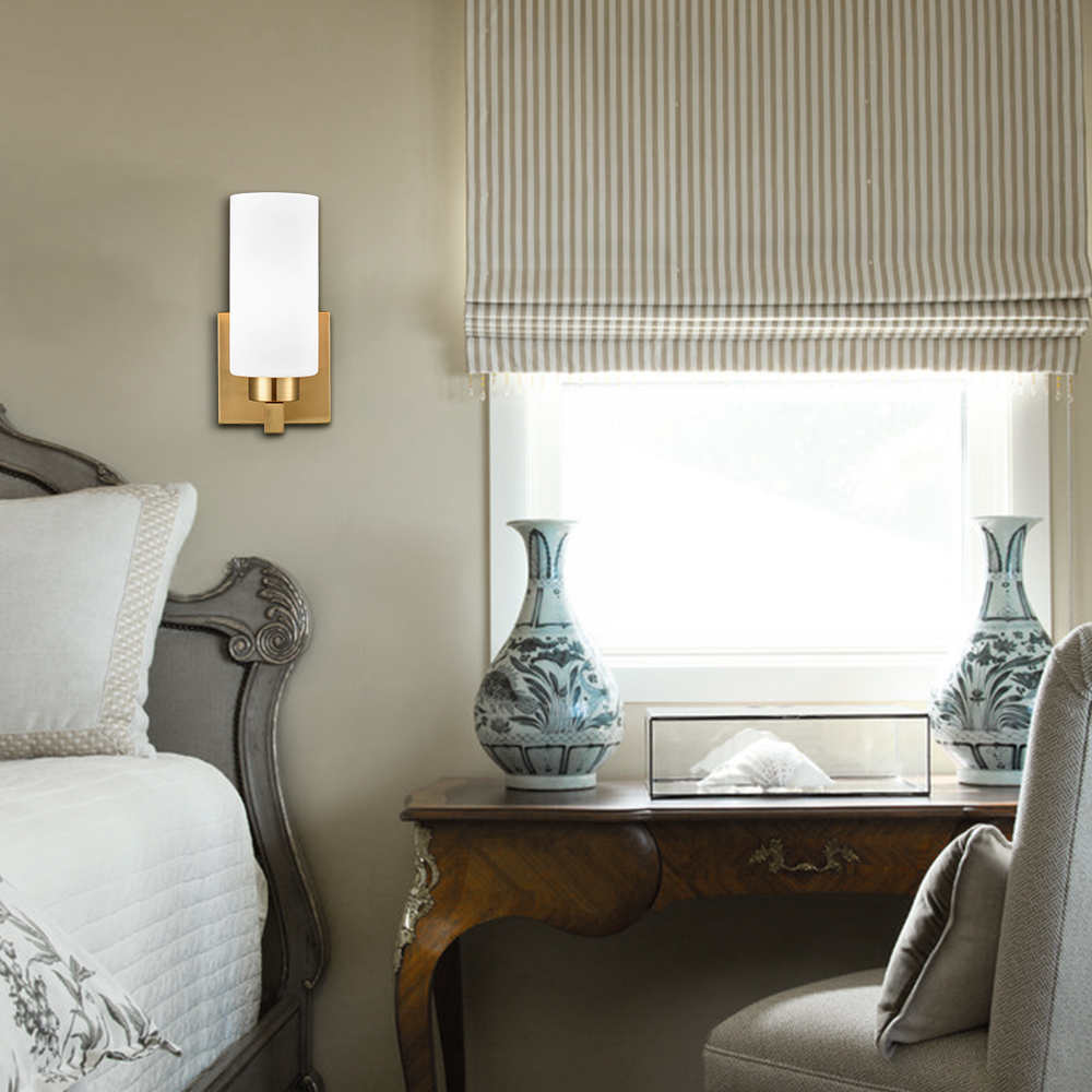 The modern wall light fixtures’ canopies, lamp holders, and arms are accented with a rustproof electrophoretic brass finish, livening up your interior with a touch of shimmer. Crafted from impurity-free hand-blown glass, their opal glass cylinder shades give your aesthetic a dash of modern sophistication and showcase the beauty of geometry.