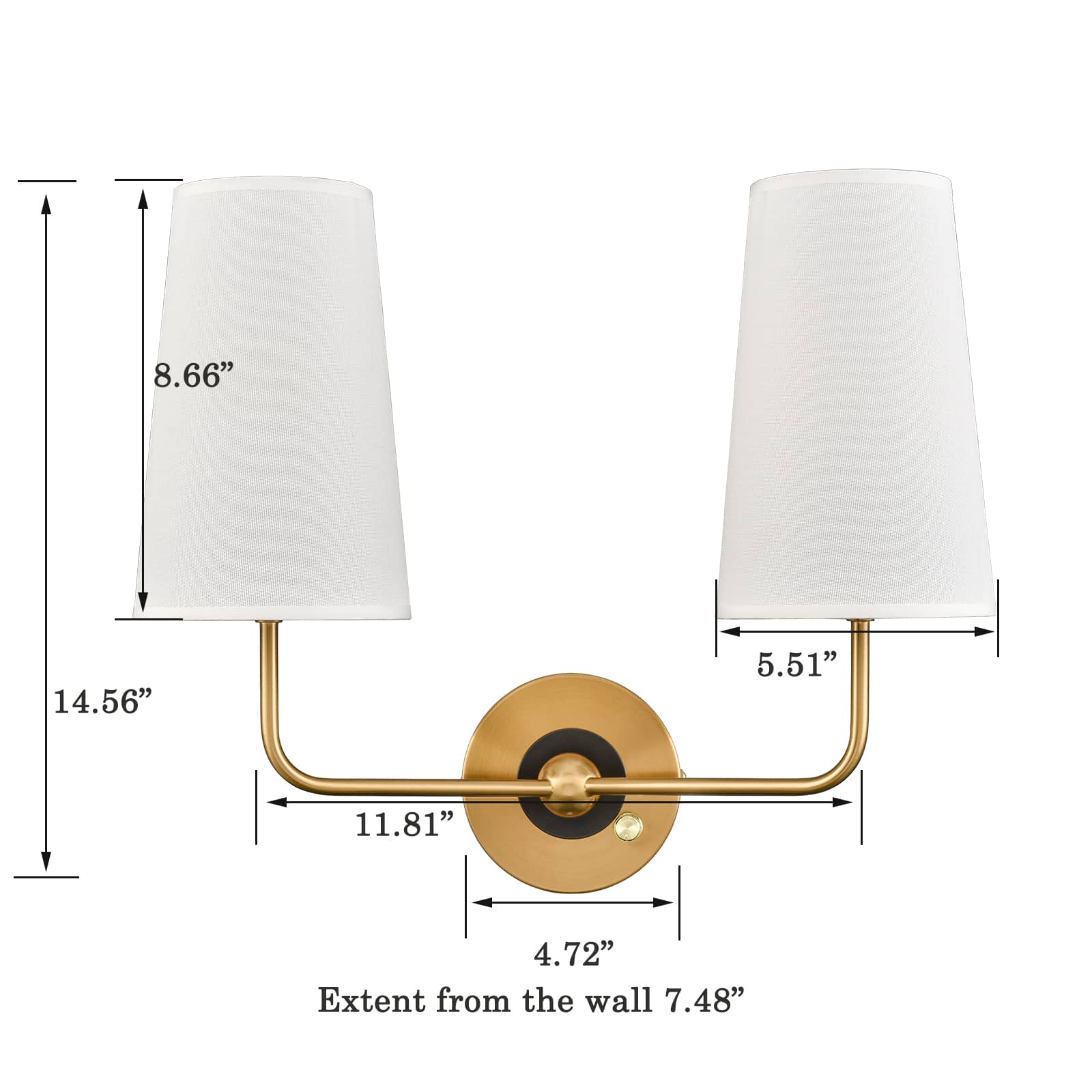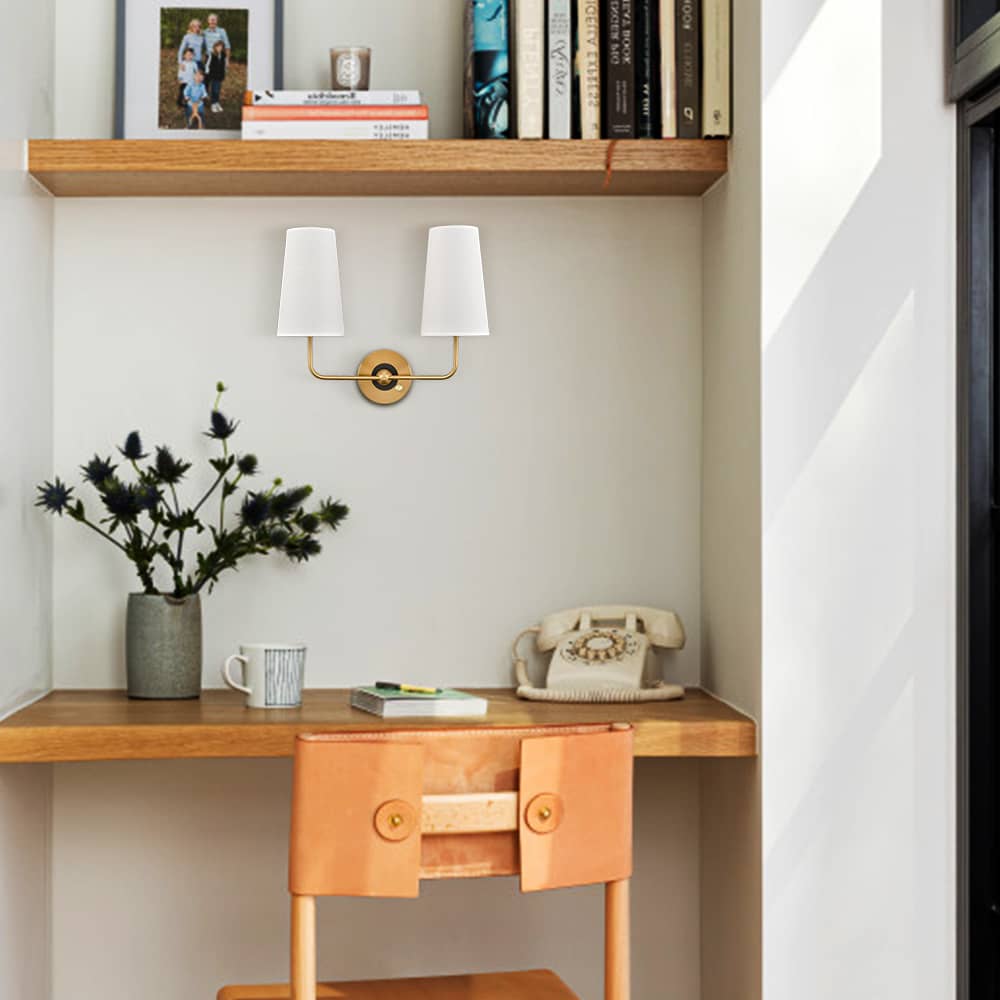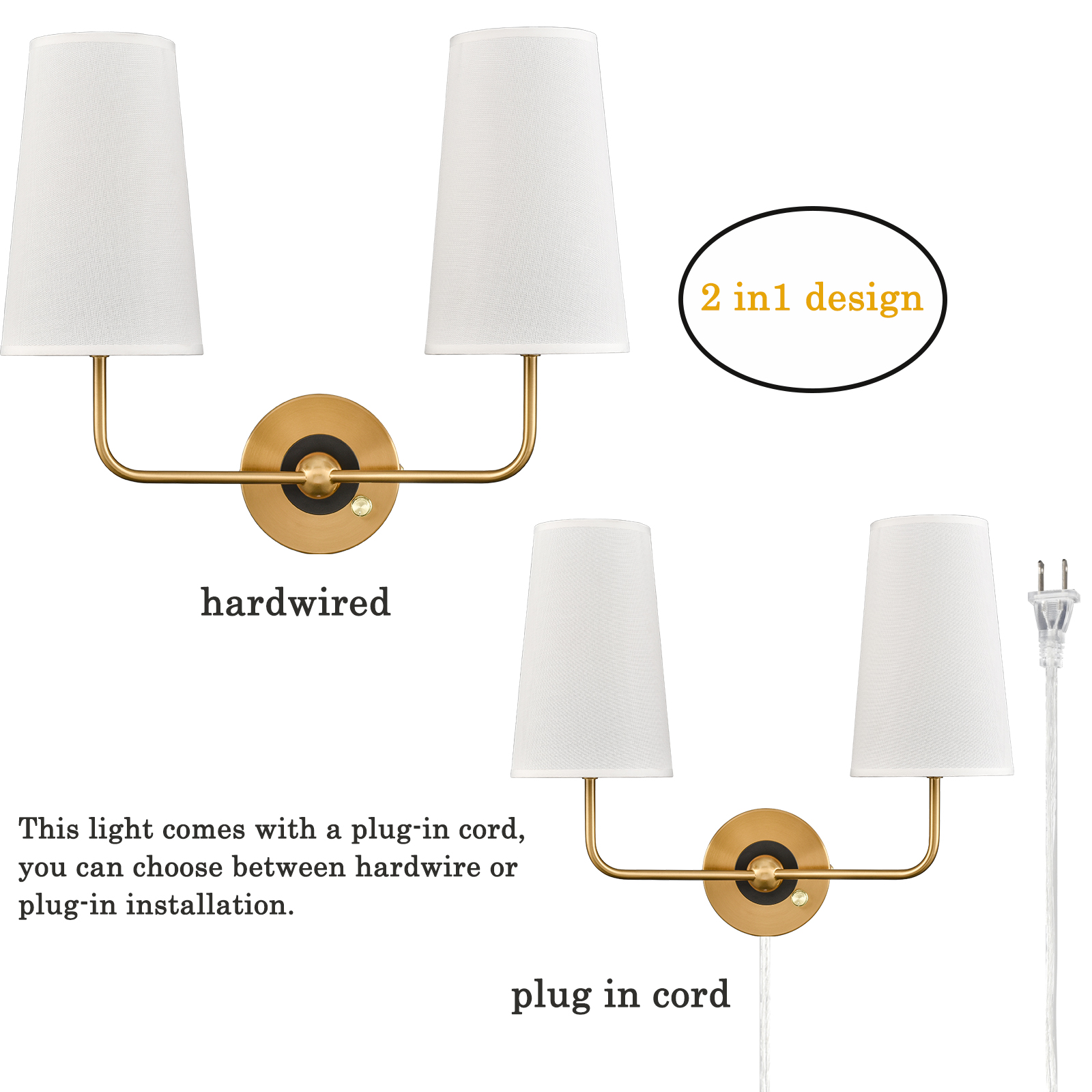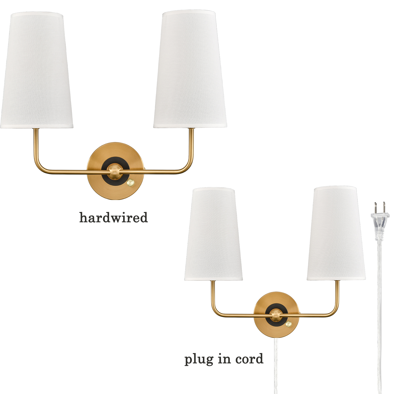 The brass plug-in wall sconce's outer ring and central globe of the canopy, lamp holders, and arm are accented with a rustproof electrophoretic brass finish, highlighting your interior with a bit of bling. The inner small ring of the canopy showcases a black finish for a refined touch. A mix of finishes encompasses both mid-century modern qualities and classic elements, yet maintains an industrial edge. Its elongated white linen cone shades cast an enchanting aura of elegance in your home. The light pouring through the fabric shades is gently muted and fills the room without any glare. It comes with a 78.7-inch plug-in cord. The switch on its canopy is both an on/off switch and a dimmer switch.