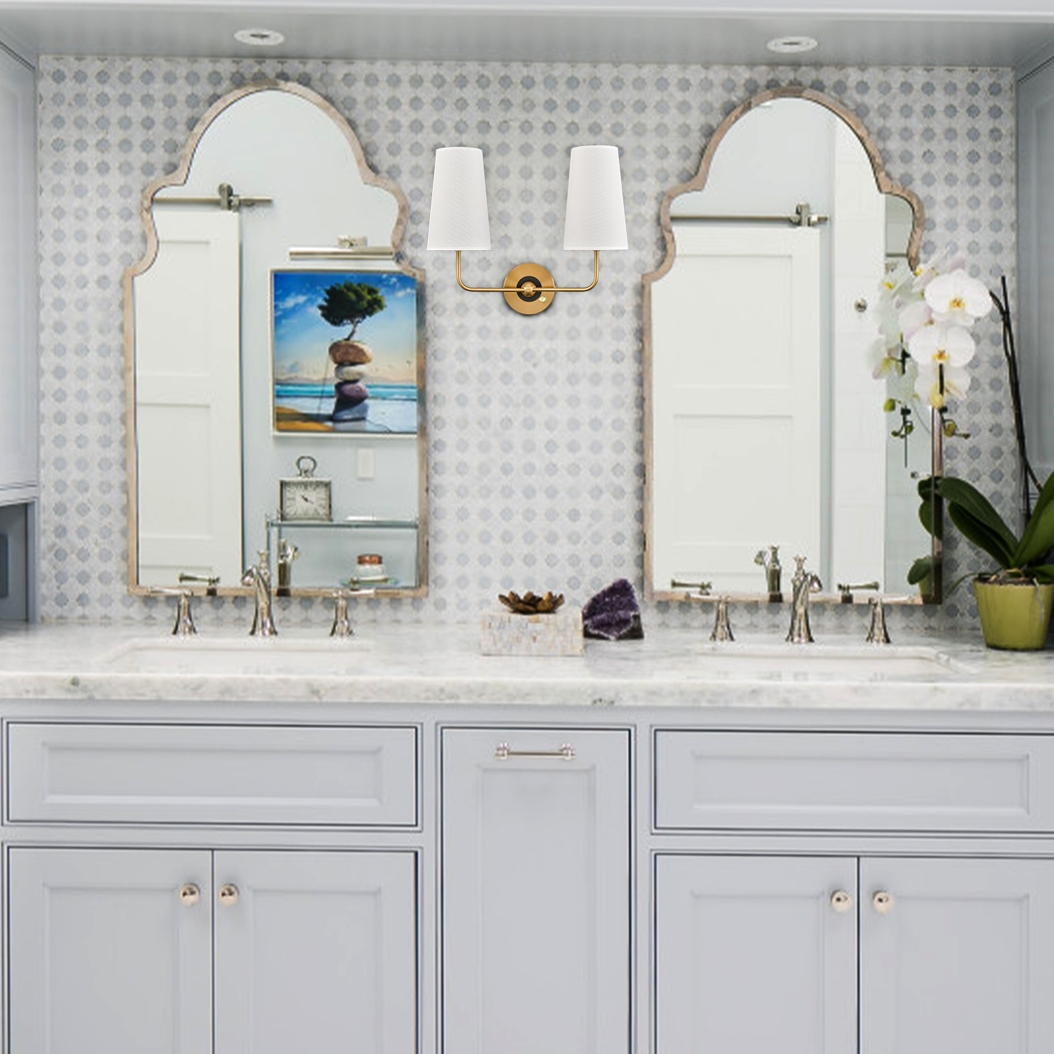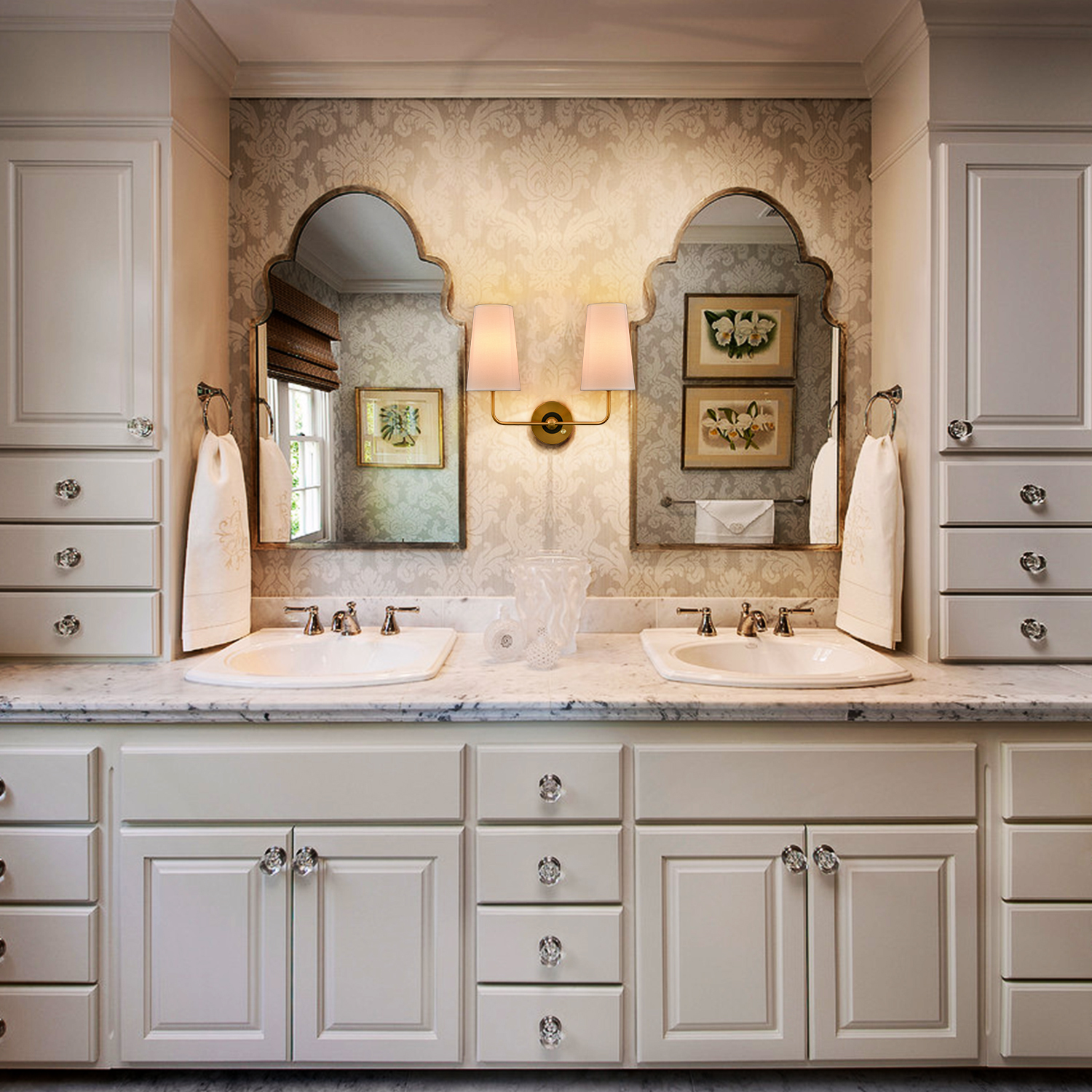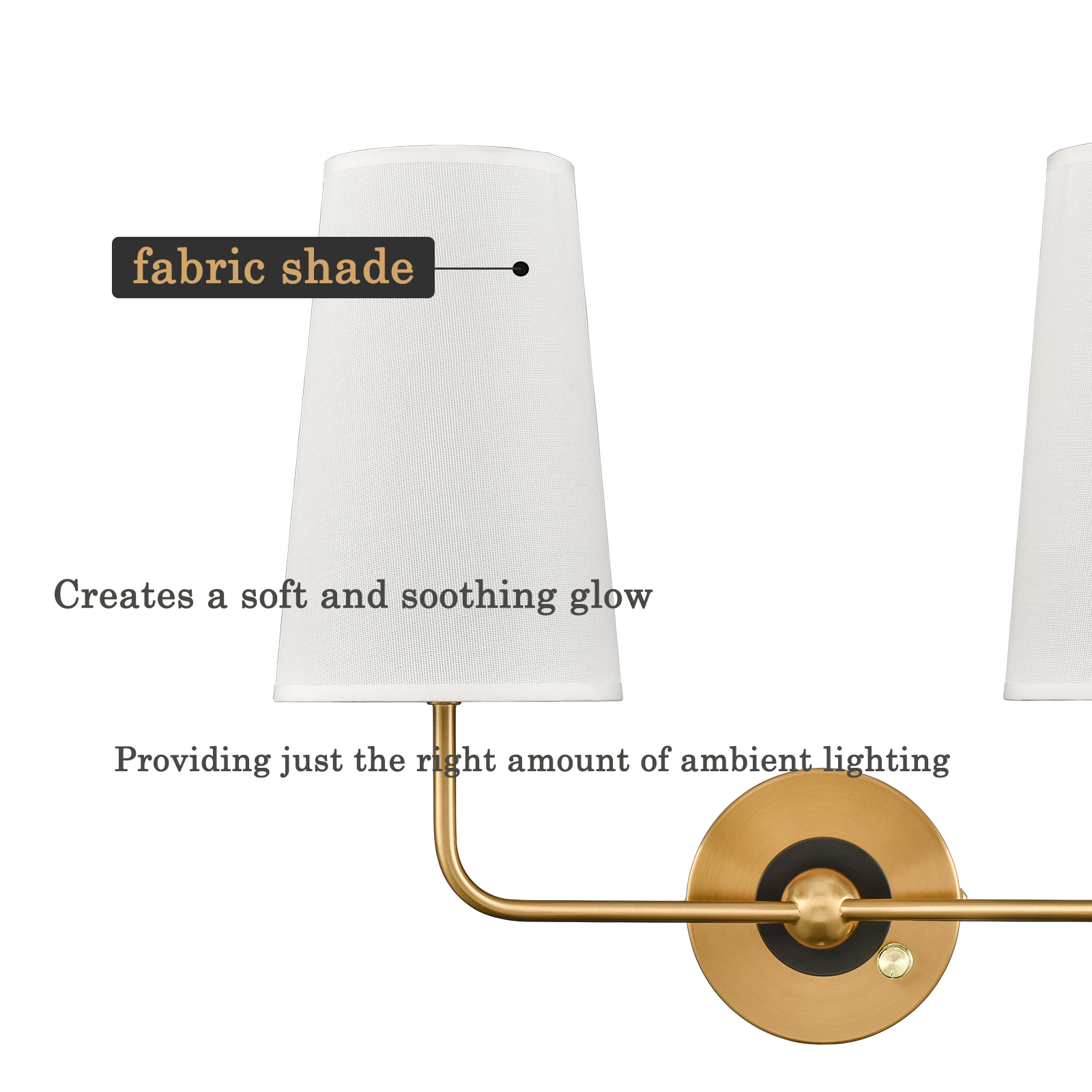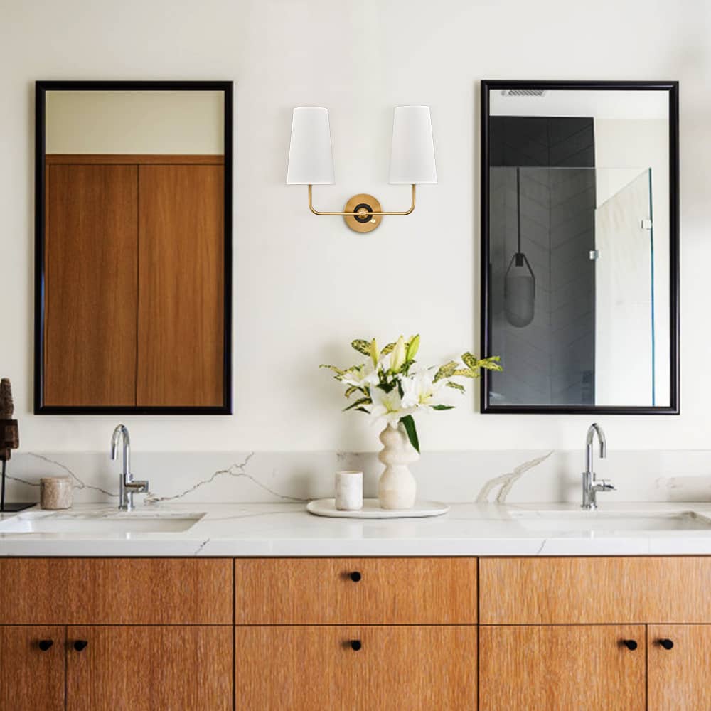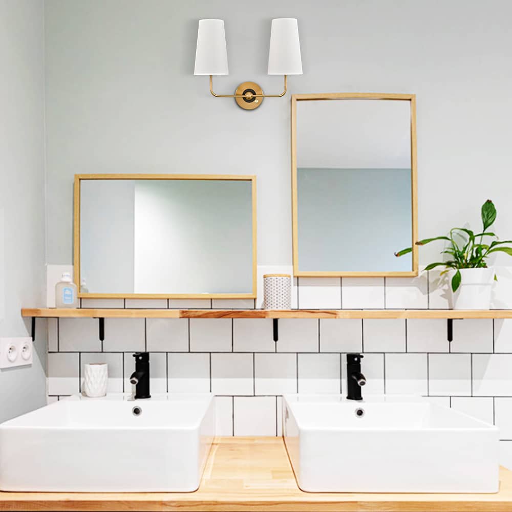 The brass plug-in wall sconce's outer ring and central globe of the canopy, lamp holders, and arm are accented with a rustproof electrophoretic brass finish, highlighting your interior with a bit of bling. The inner small ring of the canopy showcases a black finish for a refined touch. A mix of finishes encompasses both mid-century modern qualities and classic elements, yet maintains an industrial edge. Its elongated white linen cone shades cast an enchanting aura of elegance in your home. The light pouring through the fabric shades is gently muted and fills the room without any glare. It comes with a 78.7-inch plug-in cord. The switch on its canopy is both an on/off switch and a dimmer switch.