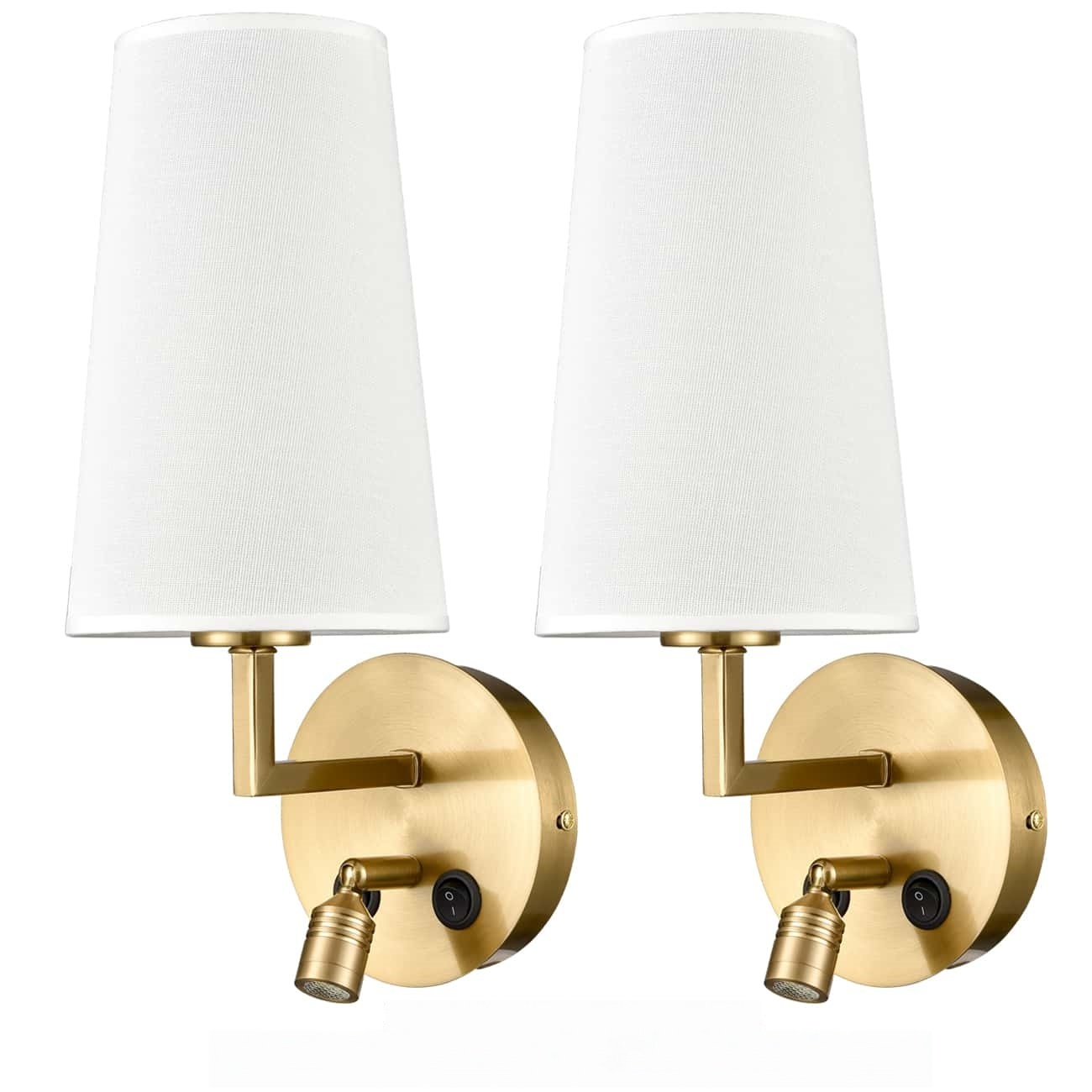 The brass gold wall sconce consists of round metal plate with USB charging port and bucket-shape white fabric lamp shade, creating a classic and modern charm decor in your living spaces. The switch on the left one controls LED reading light, the right one controls the E26 bulb. (Bulb Not Included)