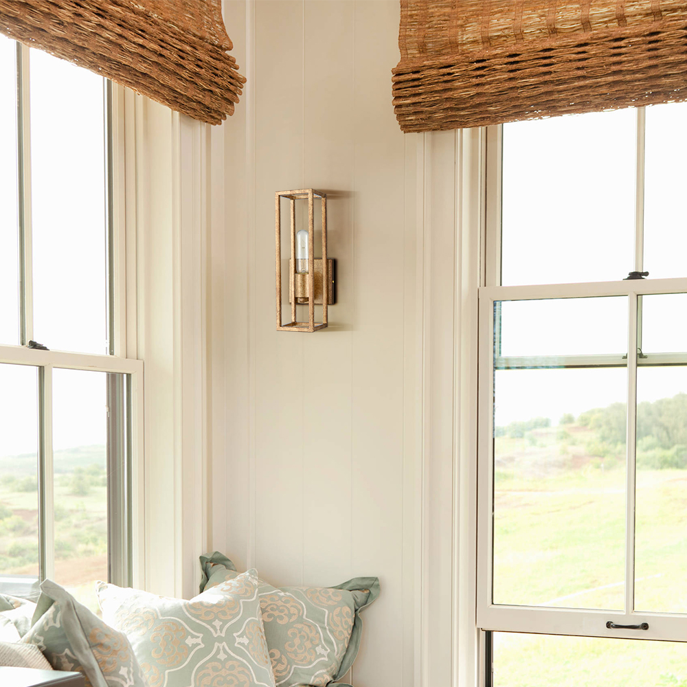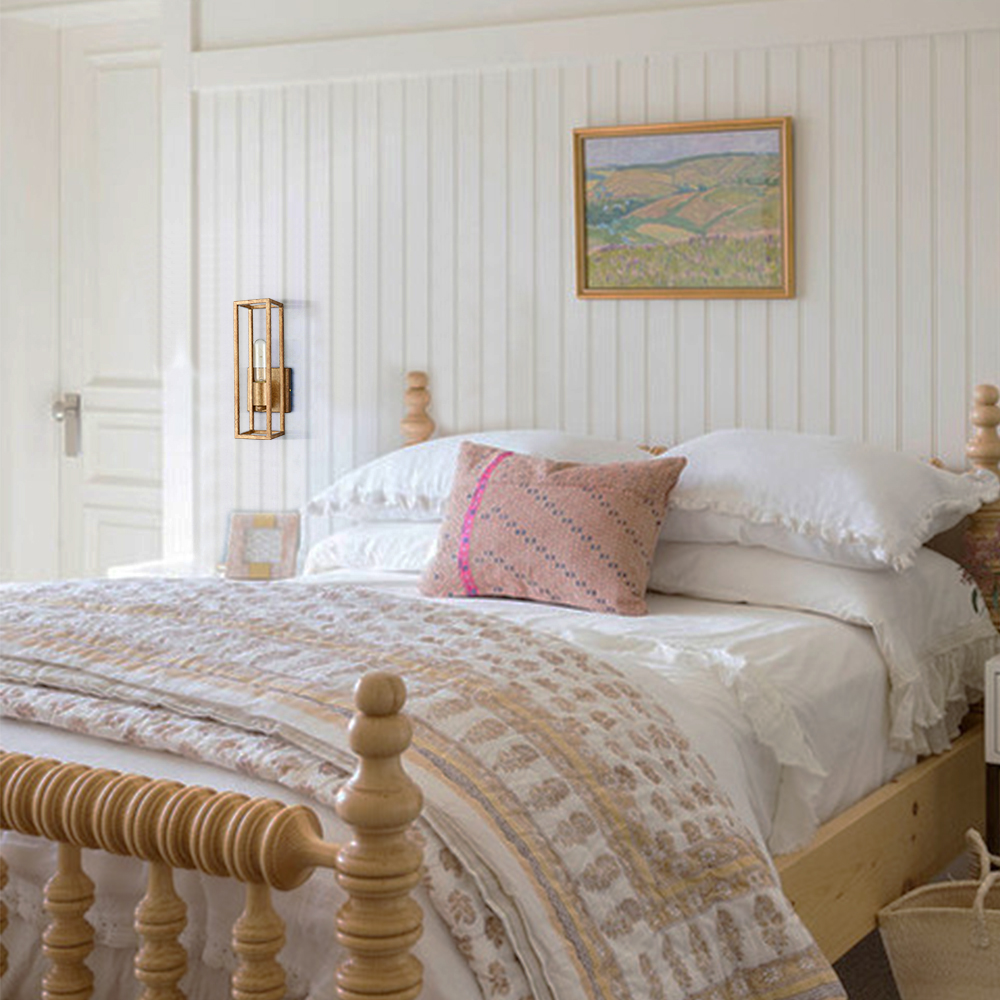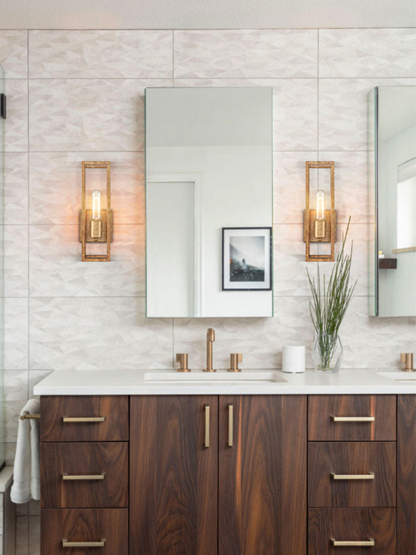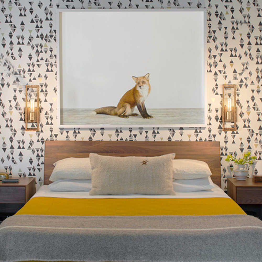 The wall sconce lighting flaunts a rustproof rusty brass finish, livening up your interior with metallic pizzazz. A rectangular open cage is designed to house and protect an exposed bulb, allowing the lights to shine through freely. Being solid and durable, it showcases the beauty of geometry and brings an unrivaled level of sophistication. Its open design makes it particularly easy for bulb replacement and cleaning. It can be mounted as uplights or downlights to suit your different lighting needs. It serves as both task and decorative lighting in your bathroom, bedroom, entryway, foyer, hallway, and porch.