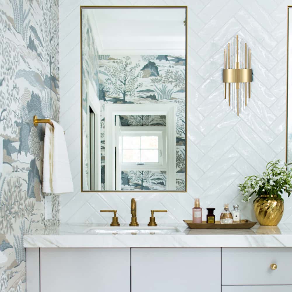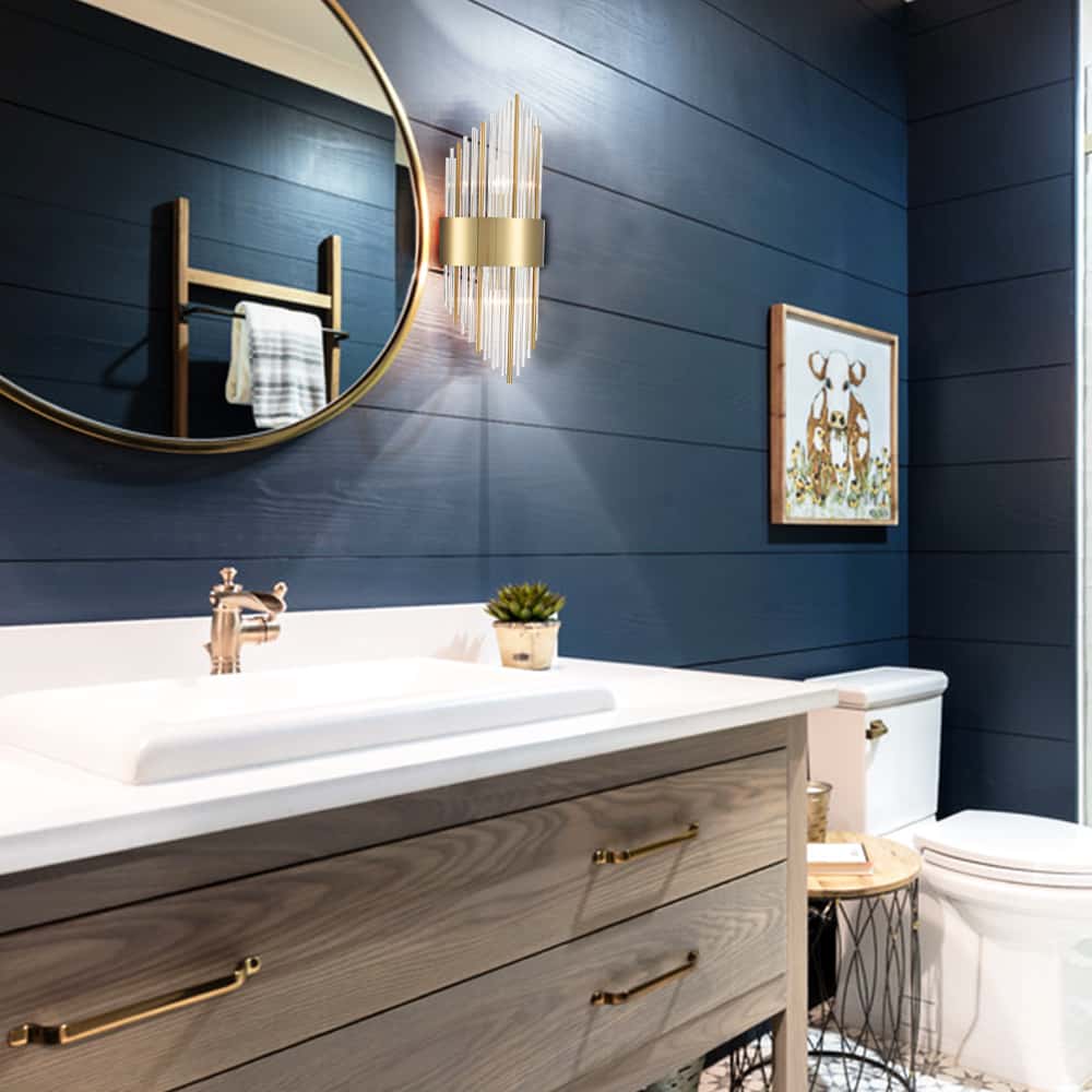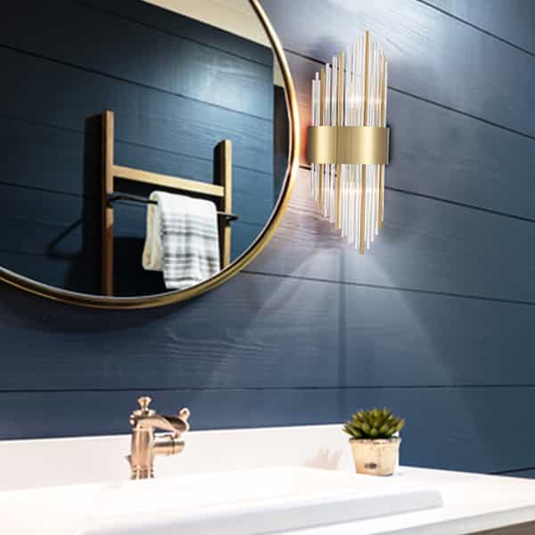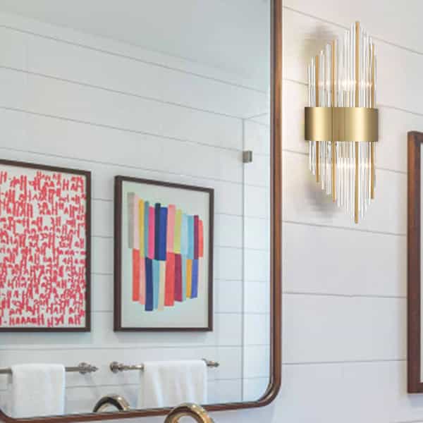 The wall sconce is dressed in electroplated titanium gold finish, pepping up your living space with a bit of bling. Featuring an impressive design, two rows of shiny clear glass rods and metal rods at mixed lengths form a striking shape and make a radiant statement in your interior.