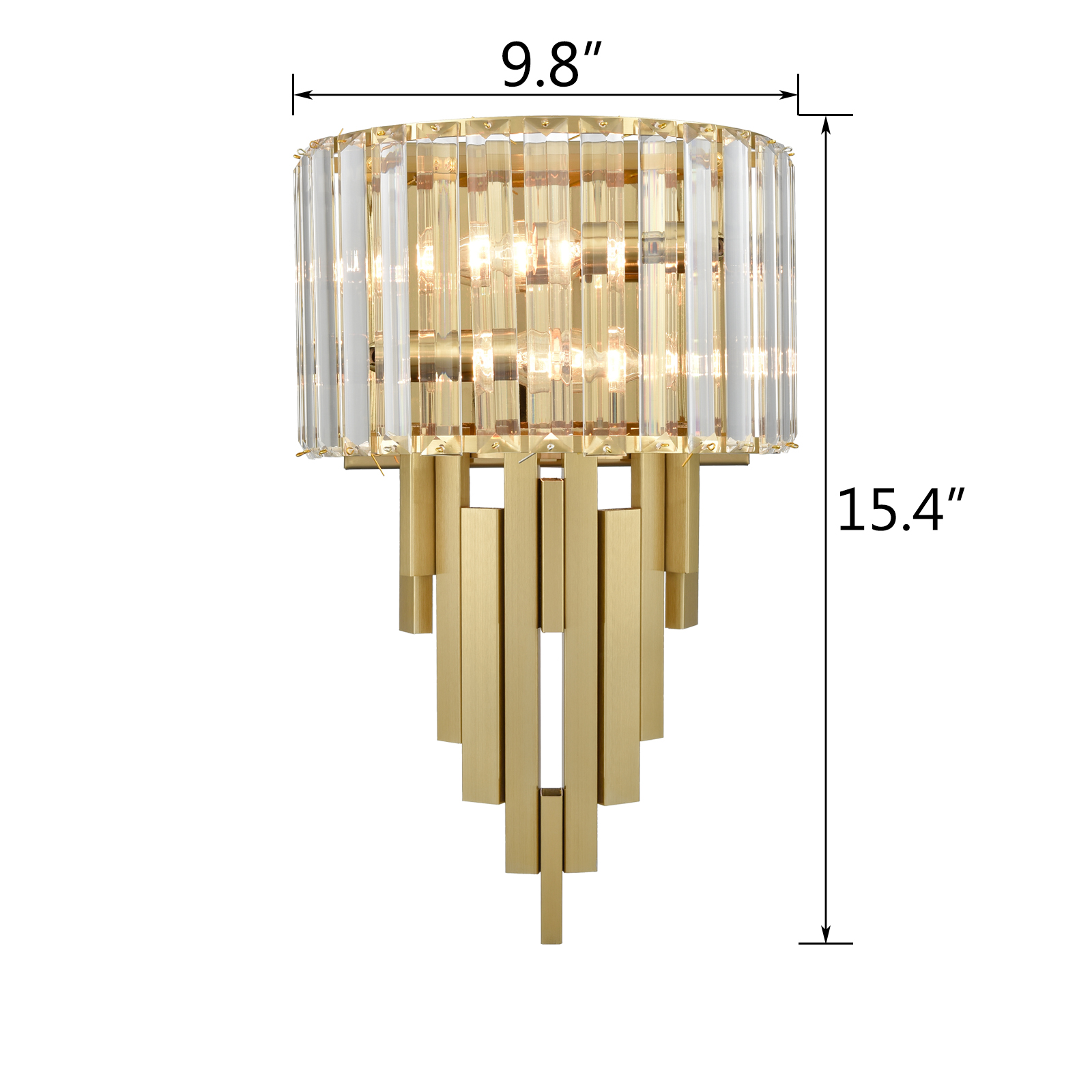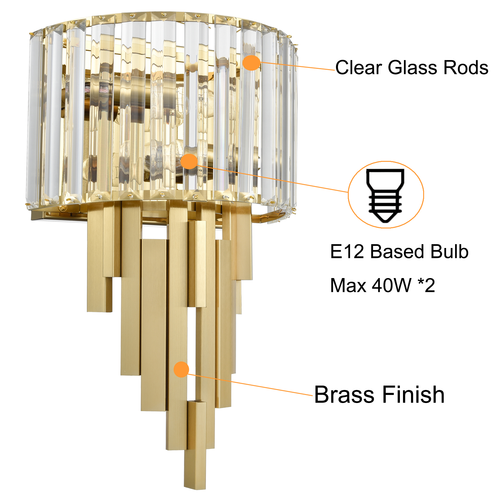 The brass wall sconce flaunts an electrophoretic brass finish, bringing a dash of metallic glitz to your living space. The triangular glass rods are arranged around the upper part of the light fixture to provide sparkling style and a touch of luxury. The brass metal rods are arranged in a zigzag pattern to deliver a dramatic decorative impact. A charming glow shines through the glass rods, creating intriguing light effects and shades. The glass rods contrast and compete with the brass tapered metal frame, adding a ton of eye appeal and enhancing the piece's visual depth and beauty even further. It can be used to provide both function and style in your bathroom, entryway, hallway, and living room.
