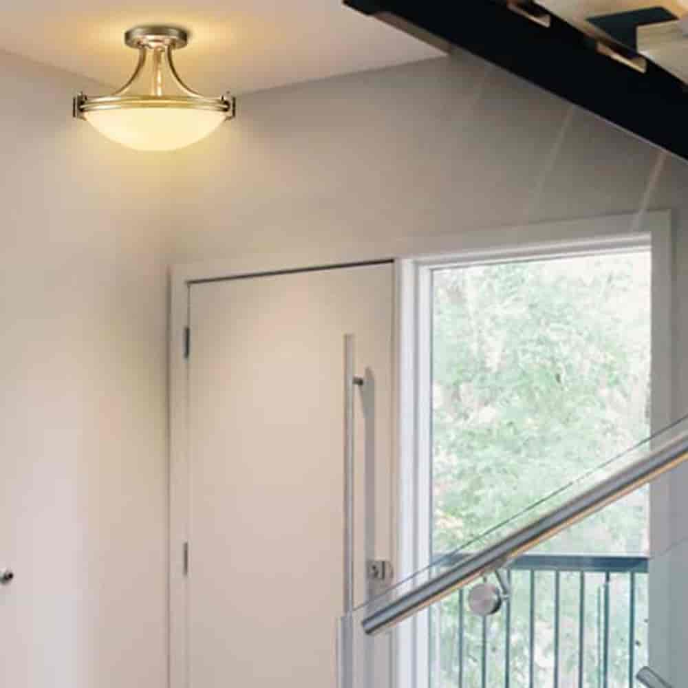 The flush mount ceiling light featuring a unique white glass shade and brushed nickel finish, ceiling light creates a clean, modern aesthetic in your house.