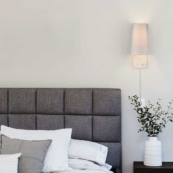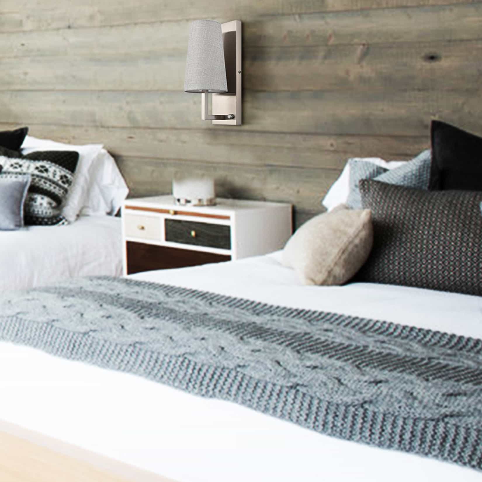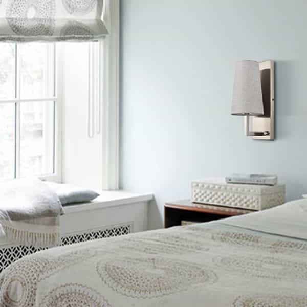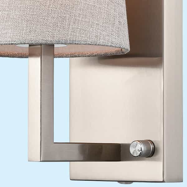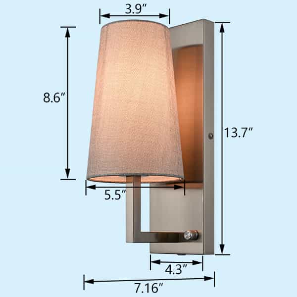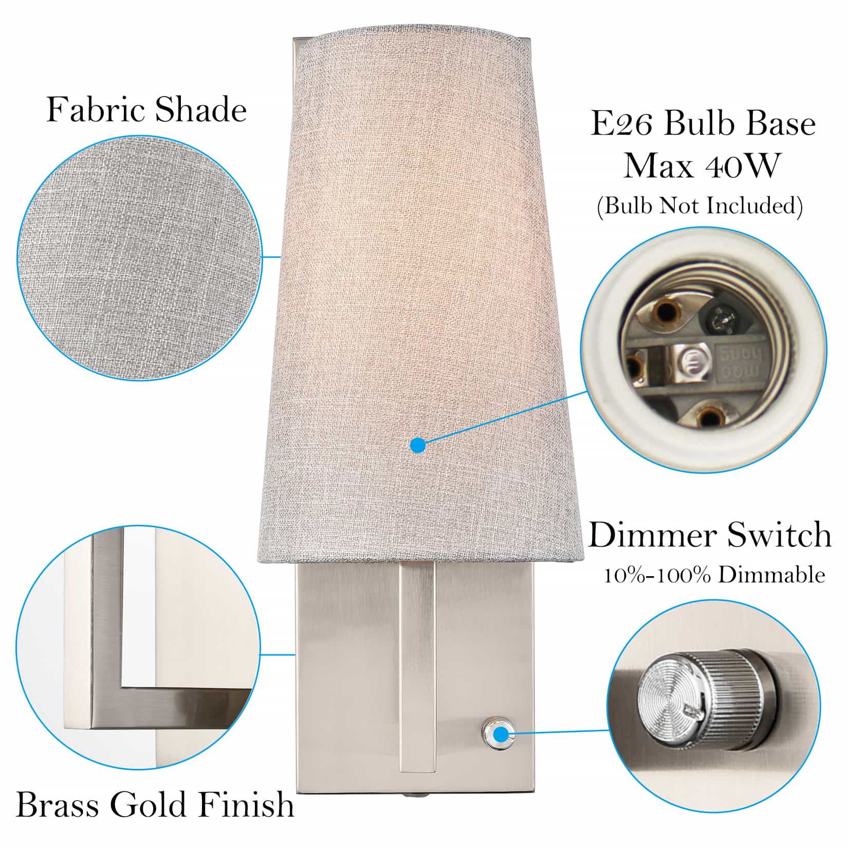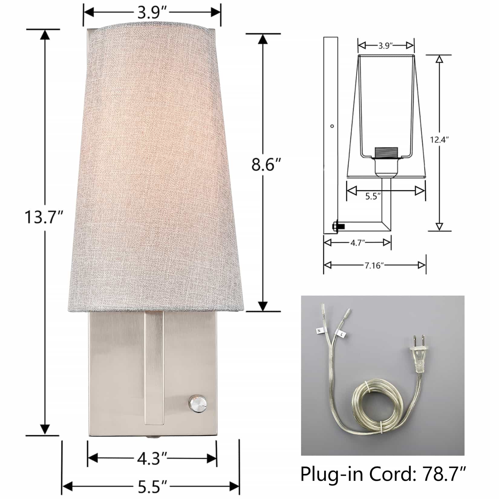 The brushed nickel plug in wall sconces' rustproof brushed nickel finish revitalizes your interior with a boost of sparkle. The light pouring through the fabric lampshades is gently muted and fills the room without any glare. The rectangular canopies showcase the beauty of geometry and convey a refined touch. Their light gray lampshades contrast the brushed nickel finish and add alluring visual interest to the space. Each wall sconce comes with a 78.7-inch plug-in cord. The switch on their canopies is both an on/off switch and a dimmer switch. Their dimmer switch is compatible with incandescent and halogen bulbs.