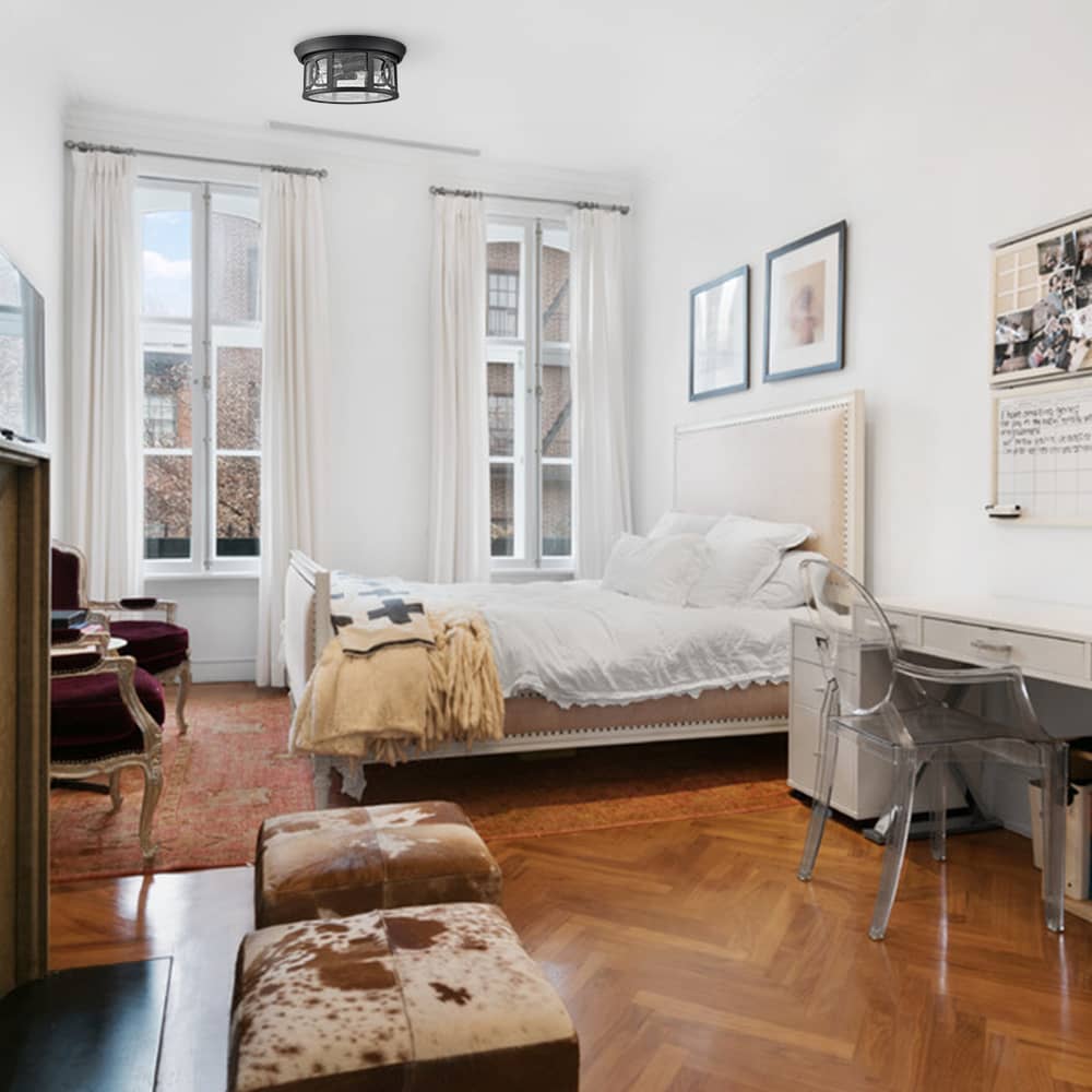 Finished in matte black, the modern indoor outdoor ceiling light gives your indoor/outdoor space a bit of vintage vibe. The ceiling light is protected by a metal cage that flaunts conjoining semicircles, rounding out the design with a refined touch. Timeless and elegant, the ceiling light is sure to shine in your bathroom, kitchen, bedroom, porch, hallway, foyer, dining room, entryway, and living room. Being weather-resistant, it is perfect for outdoor use. It is ETL listed. Dimension: 4.9 inches high * 9.96 inches wide; canopy: 11.8 inches.