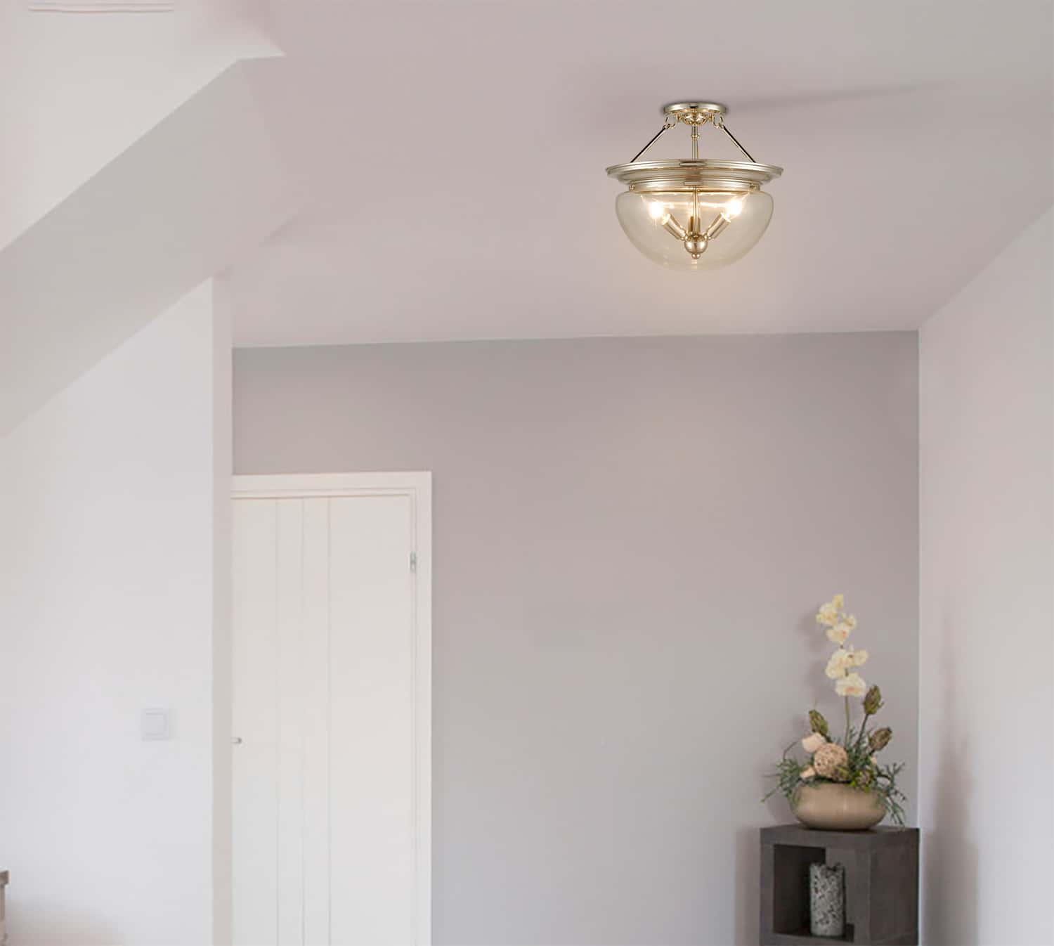 The semi flush mount ceiling light offers glitzy sparkle to your aesthetic with a brushed nickel finish. It flaunts a clear glass dome shade that is topped with a rounded frame, providing a large dose of texture to the interior. Crafted of high-temperature resistant glass, its clear glass dome shade elevates your interior with an elegant touch.