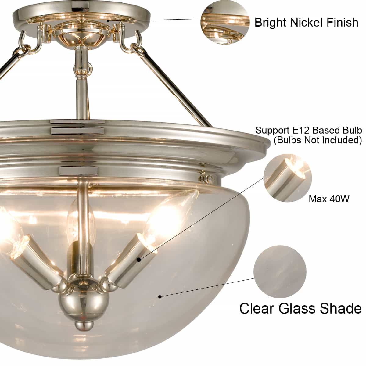Add this amazing piece to your bedroom, dining room, entryway, foyer, hallway, kitchen, and living room. Compatible with three 40-watt E12-based bulbs (NOT included). Fully dimmable with a compatible dimmer switch and dimmable bulbs.