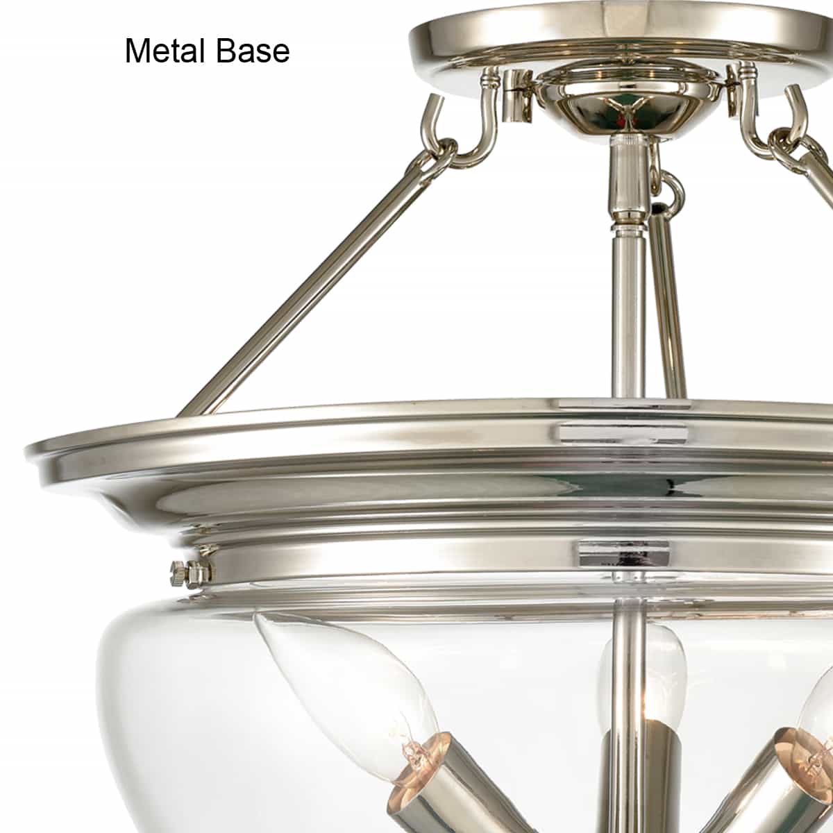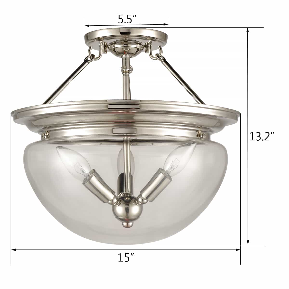 The ceiling light’s dome shade is designed to house three candelabra-inspired lights pointing upward in a triangular shape. The ceiling light is suspended by three metal rods extending upward in a pyramidal shape. It is a fantastic addition to your living space with its gleaming finish.