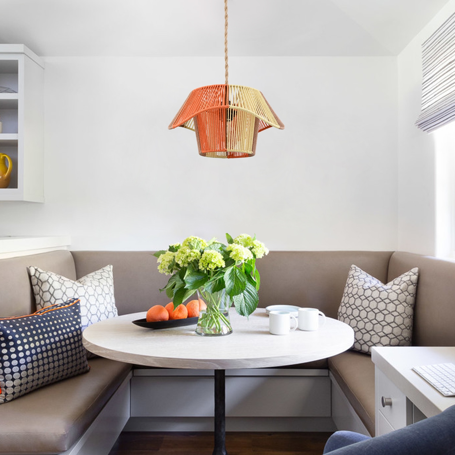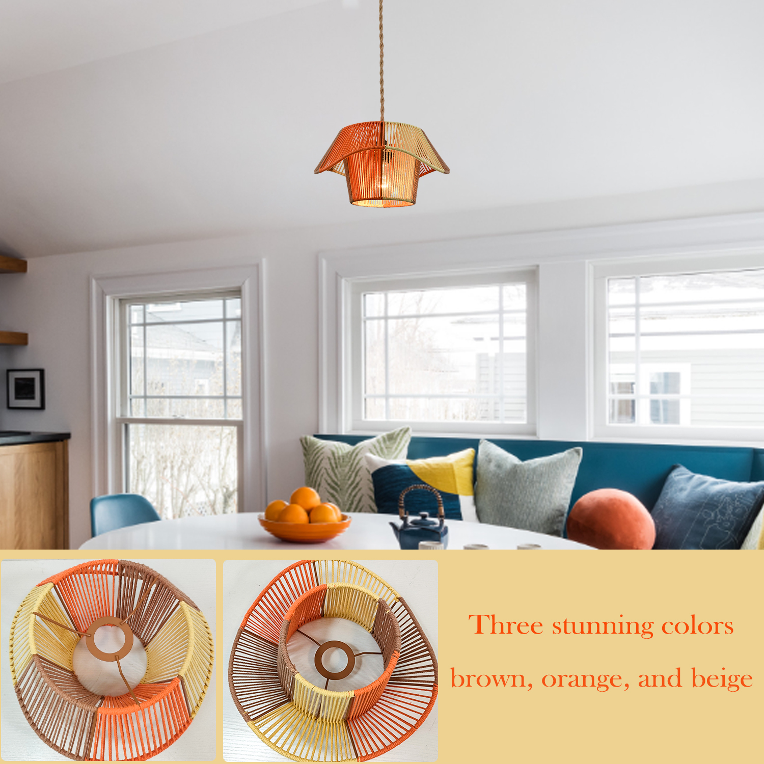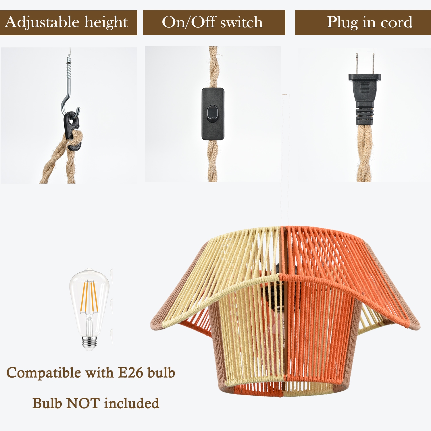 Expertly crafted with paper ropes, the colorful hanging light helps the space achieve an organic aesthetic. Featuring a multi-colored finish of brown, orange, and beige, its airy drum shade brings a touch of geometry and a snappy look to the space. The open lampshade encircles an exposed bulb in the middle, rounding out the design with a large dose of texture. Its airy drum shade is protected by an outer airy cone cage, showing off a perfect blend of artistry and functionality. Featuring fine workmanship, it sports hand-woven details on the paper rope lamp body, serving as a refreshing sight to the space. A charming glow shines through the airy shade, creating beautiful, intriguing shadows. It comes with an adjustable 177.16-inch braided hemp rope plug-in cord.