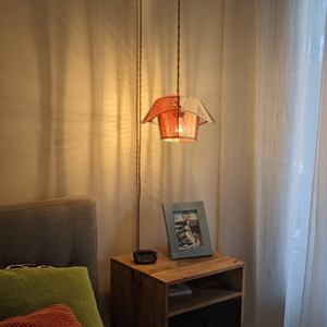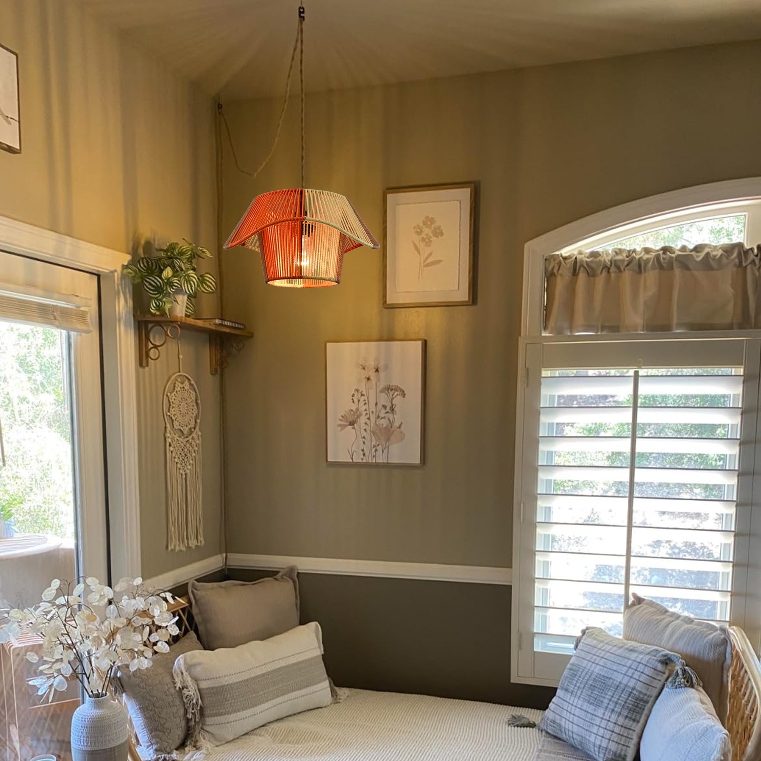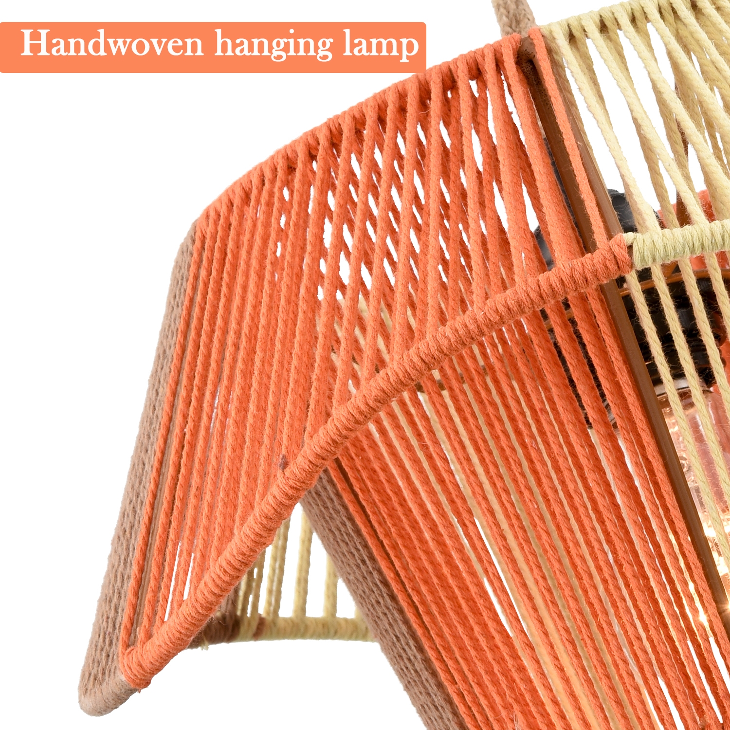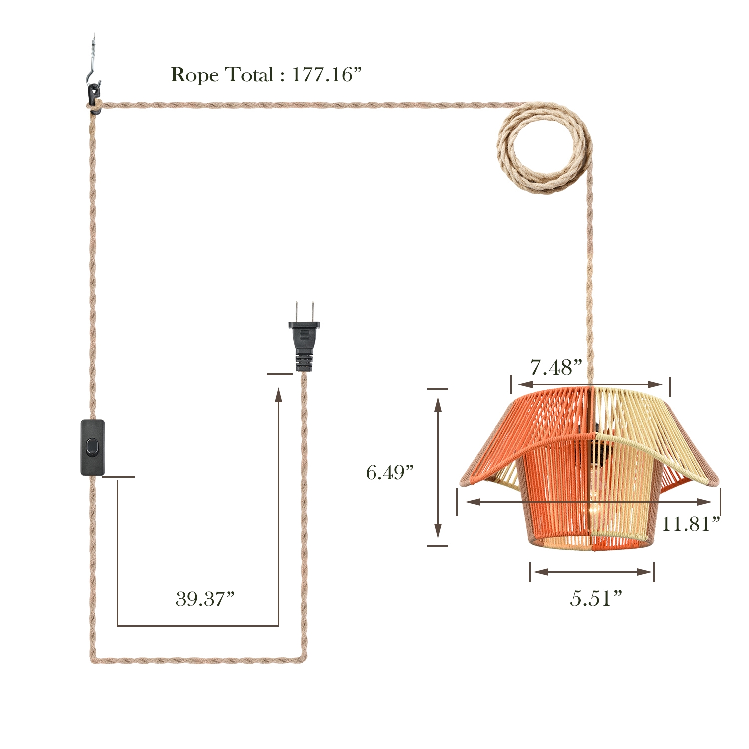 Expertly crafted with paper ropes, the colorful hanging light helps the space achieve an organic aesthetic. Featuring a multi-colored finish of brown, orange, and beige, its airy drum shade brings a touch of geometry and a snappy look to the space. The open lampshade encircles an exposed bulb in the middle, rounding out the design with a large dose of texture. Its airy drum shade is protected by an outer airy cone cage, showing off a perfect blend of artistry and functionality. Featuring fine workmanship, it sports hand-woven details on the paper rope lamp body, serving as a refreshing sight to the space. A charming glow shines through the airy shade, creating beautiful, intriguing shadows. It comes with an adjustable 177.16-inch braided hemp rope plug-in cord.