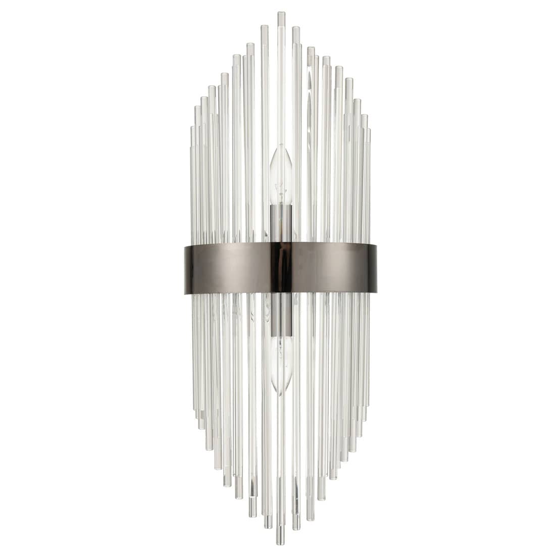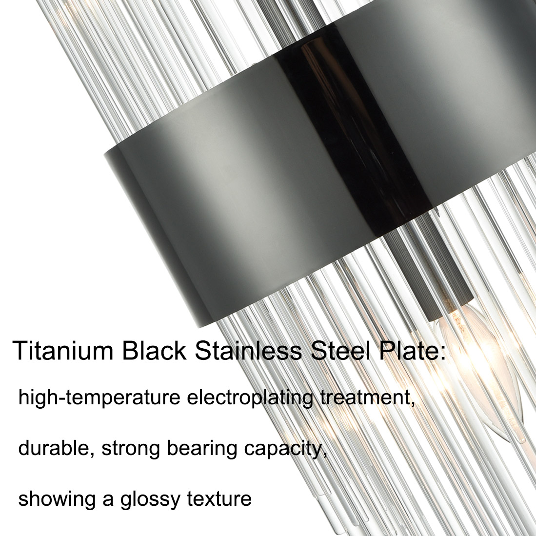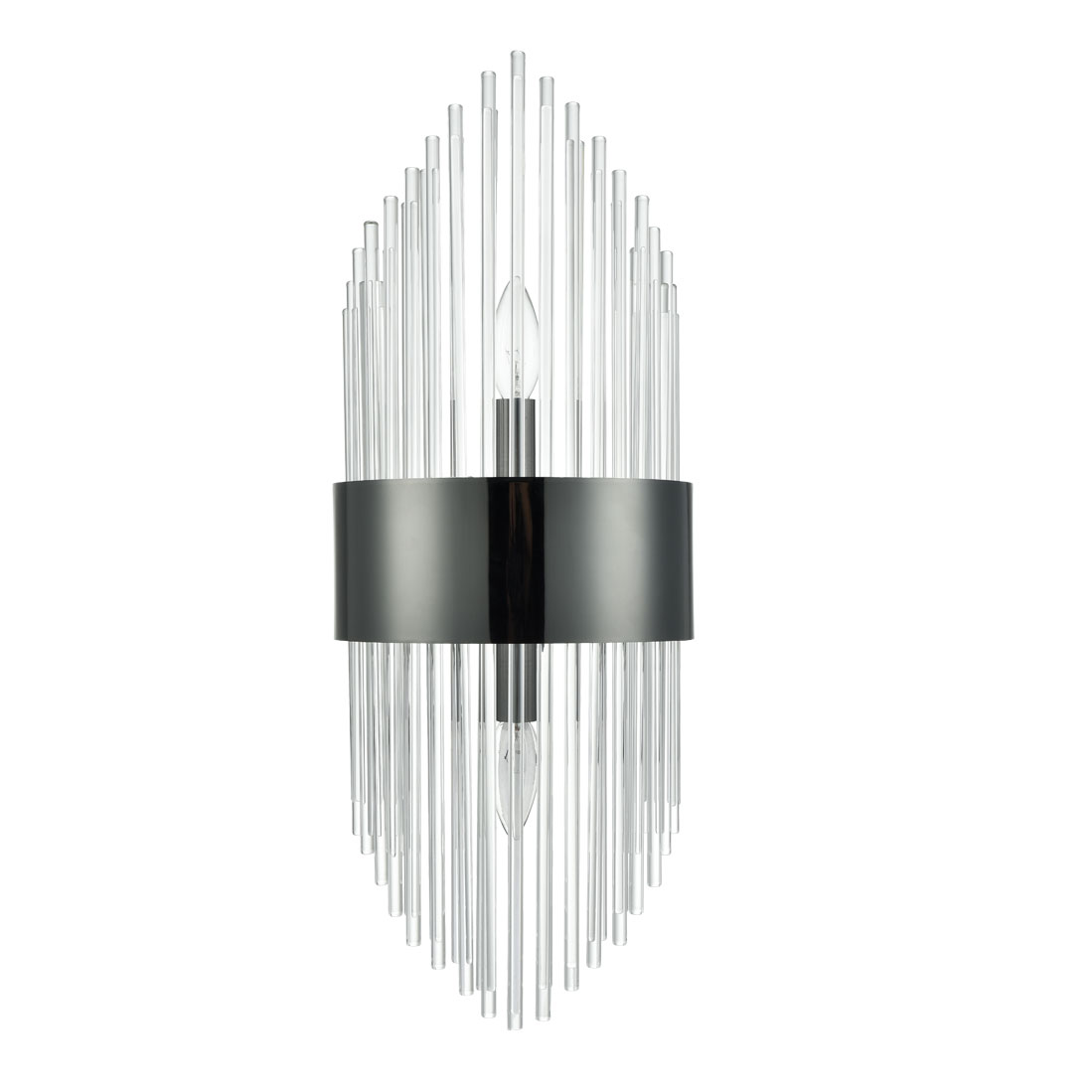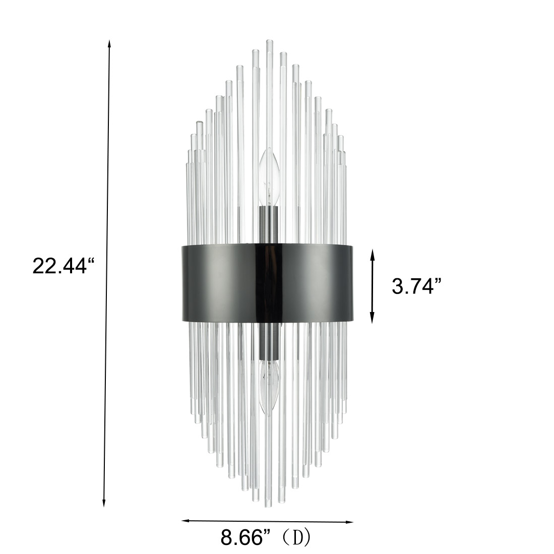 The wall sconces’ lamp-holders and metal rings securing the glass rods are dressed in an electroplated titanium black finish, bringing a touch of modern sophistication to the living space. Featuring an impressive design, two rows of shiny clear crystal glass rods at mixed lengths form a striking shape and make a radiant statement in your interior.