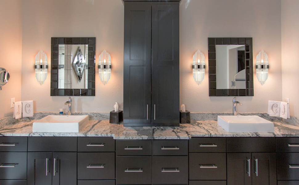 The wall sconces’ lamp-holders and metal rings securing the glass rods are dressed in an electroplated titanium black finish, bringing a touch of modern sophistication to the living space. Featuring an impressive design, two rows of shiny clear crystal glass rods at mixed lengths form a striking shape and make a radiant statement in your interior.