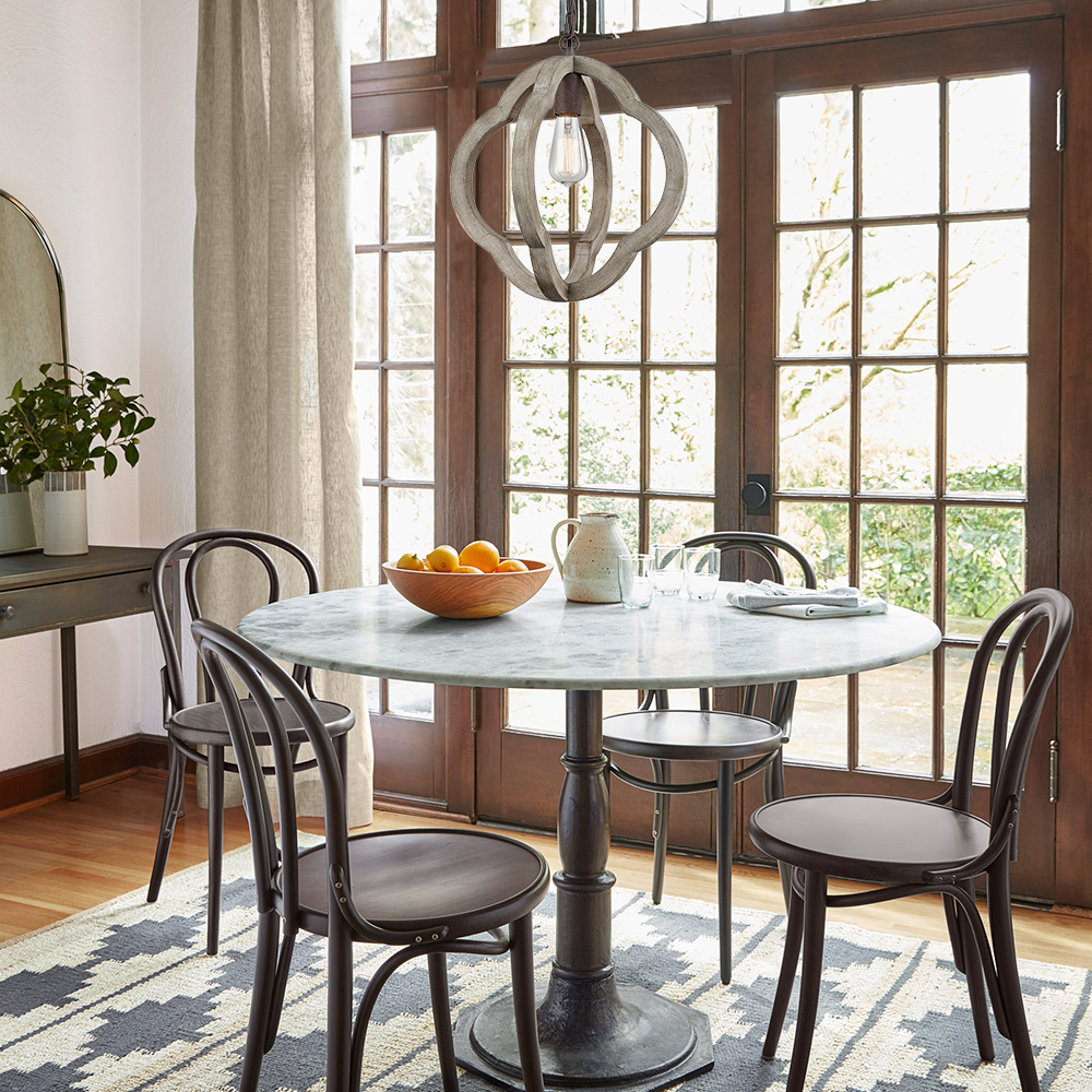 Rustic iron and distressed wood globe complement each other in this rustic globe chandelier. The distressed wood finish and rustic iron accents complement as well as contrast one another. A combination that goes well over a farmhouse dining table or vingage interior.