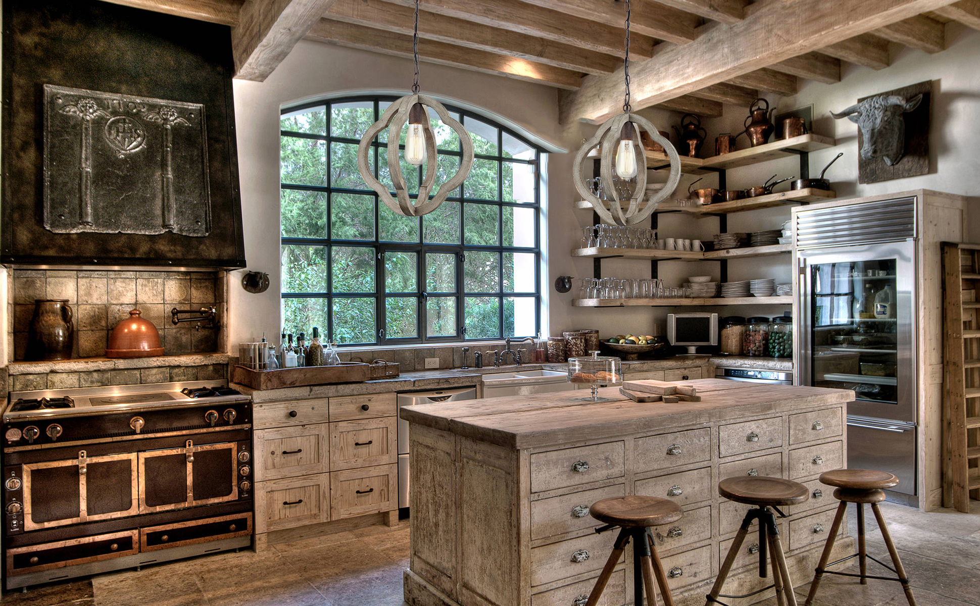 Rustic iron and distressed wood globe complement each other in this rustic globe chandelier. The distressed wood finish and rustic iron accents complement as well as contrast one another. A combination that goes well over a farmhouse dining table or vingage interior.