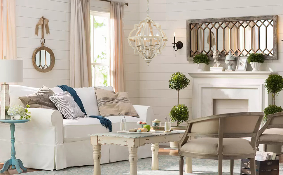 Illuminate your space in farmhouse-chic style with this six-light candle-style chandelier! Crafted of wood in distressing off-white finish, this fixture features an open shaped silhouette made from quatrefoil-inspired frames. The simple design but devoted handwork represent the luxe of french county lights.
