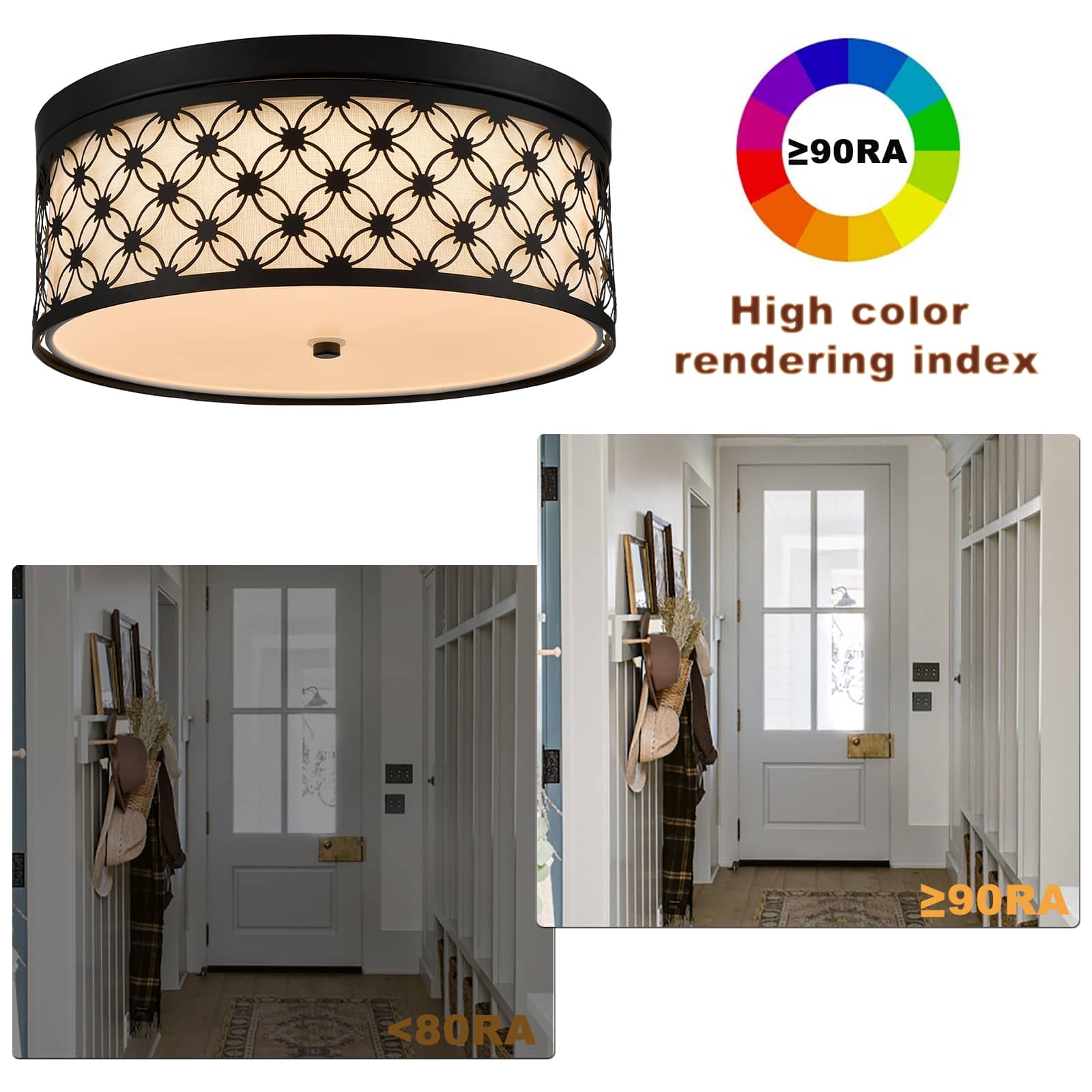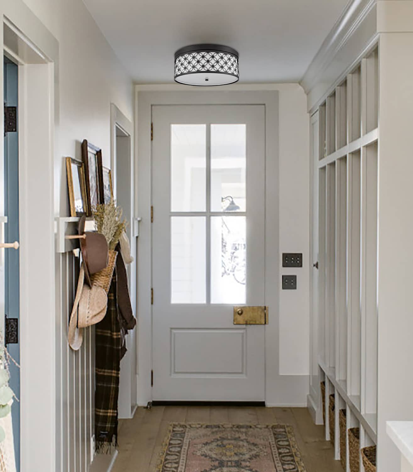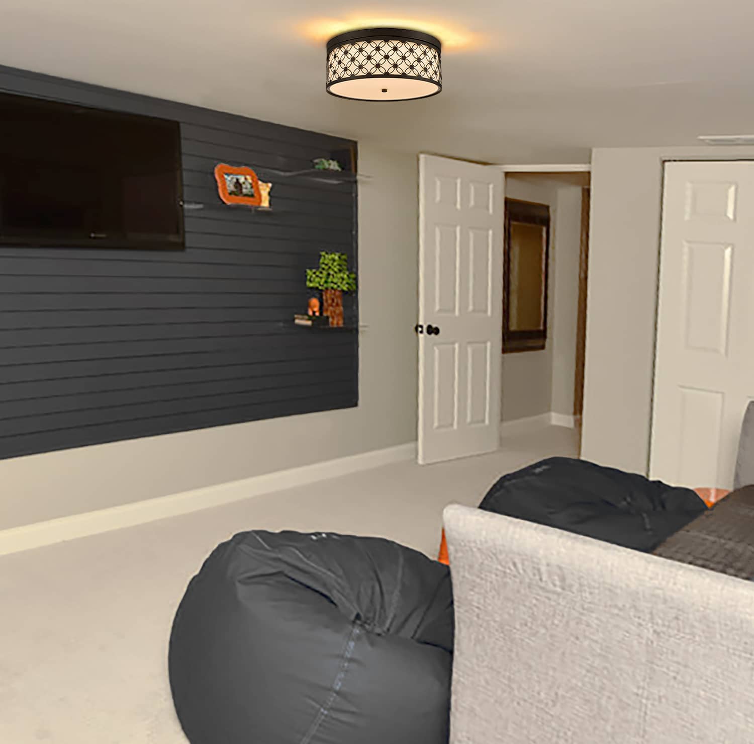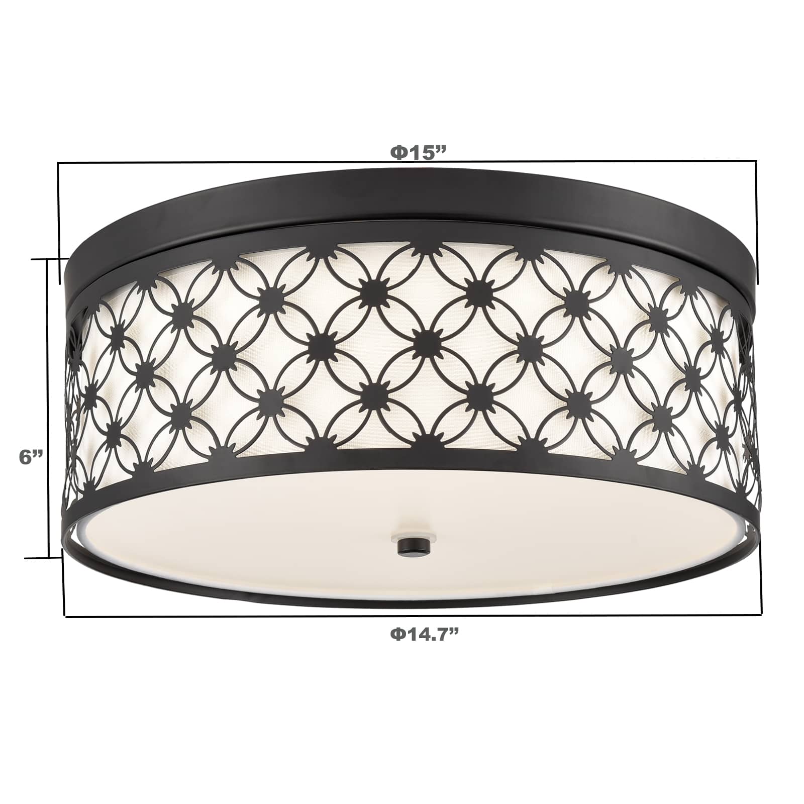 The black metal dimmable led ceiling light’s canopy, lamp-holder, bottom accent, and airy cage are coated in a black finish. Its creamy white linen drum shade is protected by an airy metal cage featuring conjoining circles and floral patterns, creating a look that is sure to be noticed. The light pouring through the fabric lampshade is gently muted and fills the room without any glare. The black metal dimmable led ceiling light is an attention-grabbing addition to your space with its stunning airy cage.