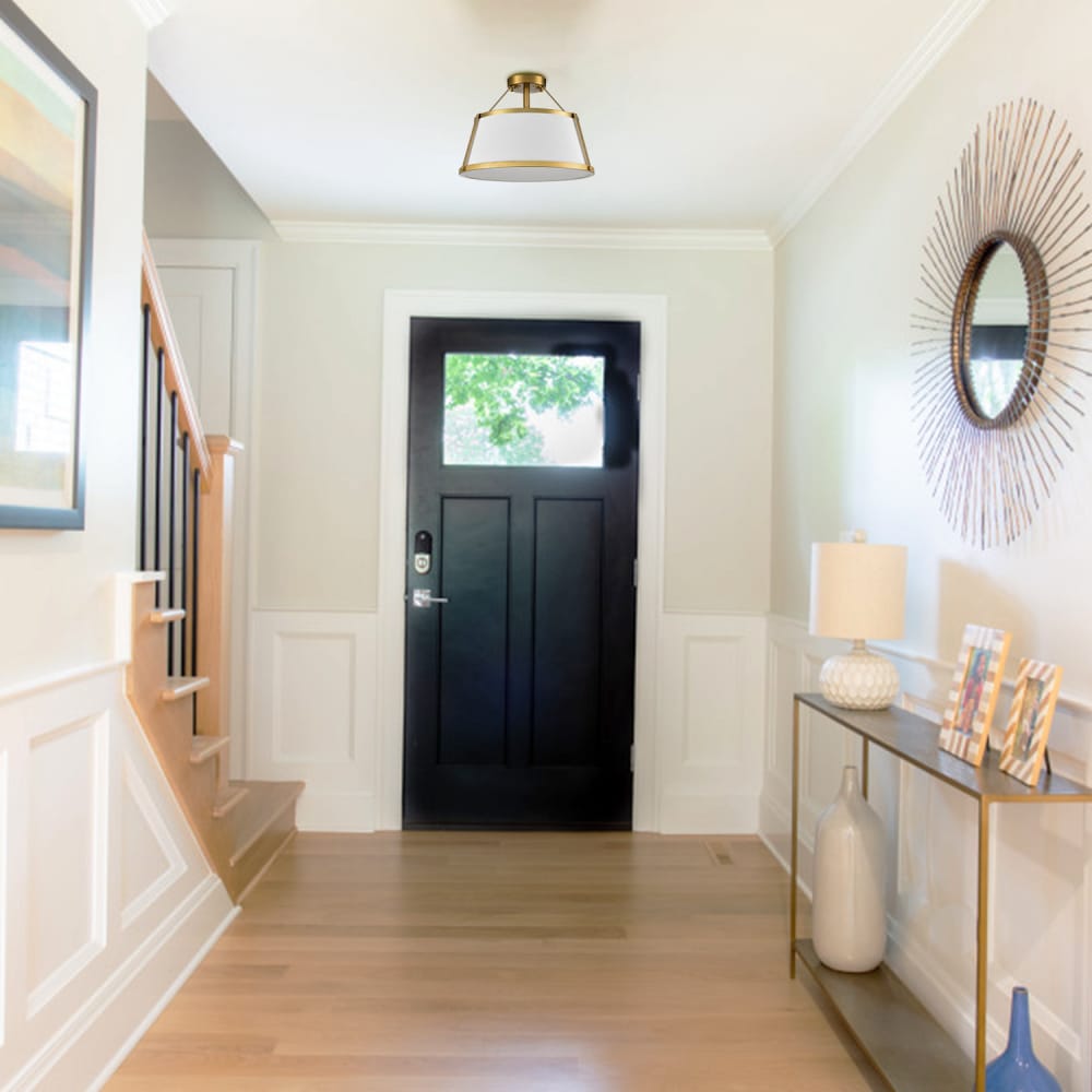 The drum ceiling light’s canopy, lamp-holder, frame, arms, and hanging rod flaunt a rustproof electrophoretic brass, pepping up your living space with a bit of bling. Its linen drum shade is held aloft by the three-pronged metal frame and three arms attached the canopy for bringing rich visual interest to your interior. The light pouring through the linen drum shade is gently muted and fills the room without any glare. Its trapezoid drum shade gives your living space a touch of geometry. Featuring RA≧90 and 120V/60Hz, it emits flicker-free light, helping you avoid eyestrain. It is a perfect fixture for your bedroom, dining room, entryway, hallway, kitchen, and living room.