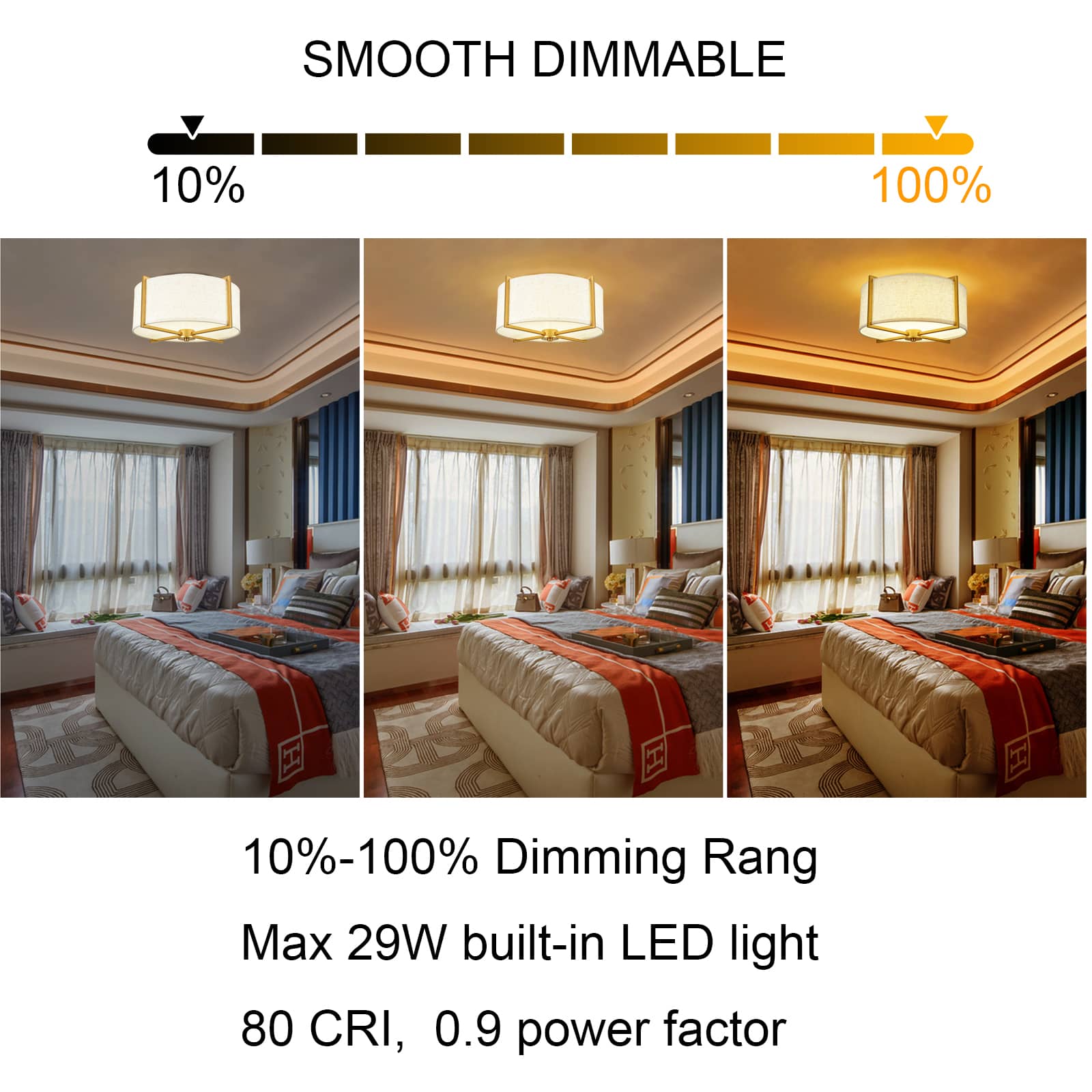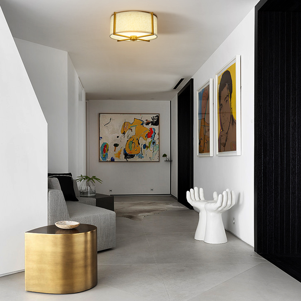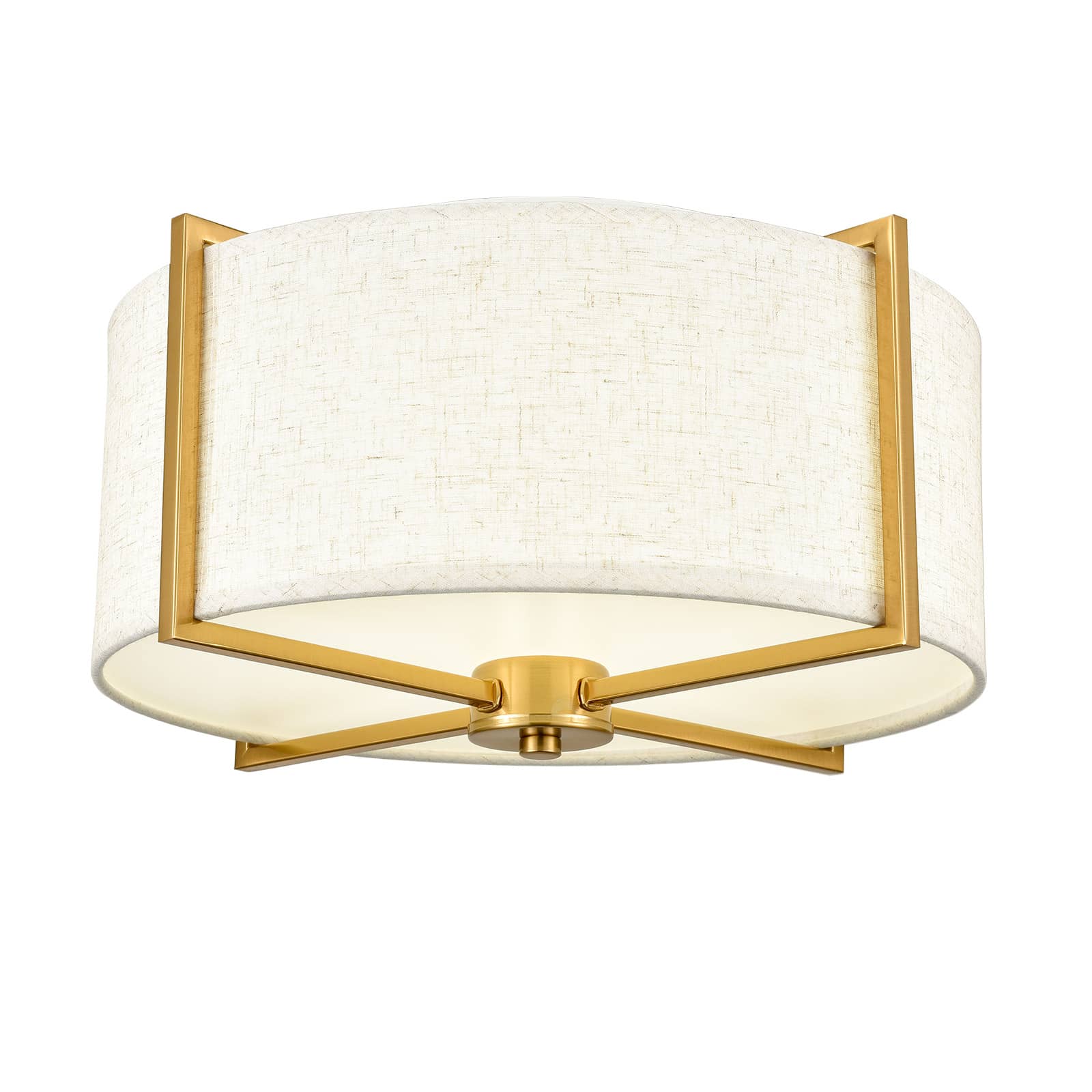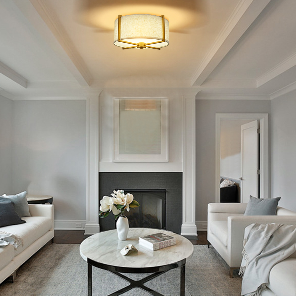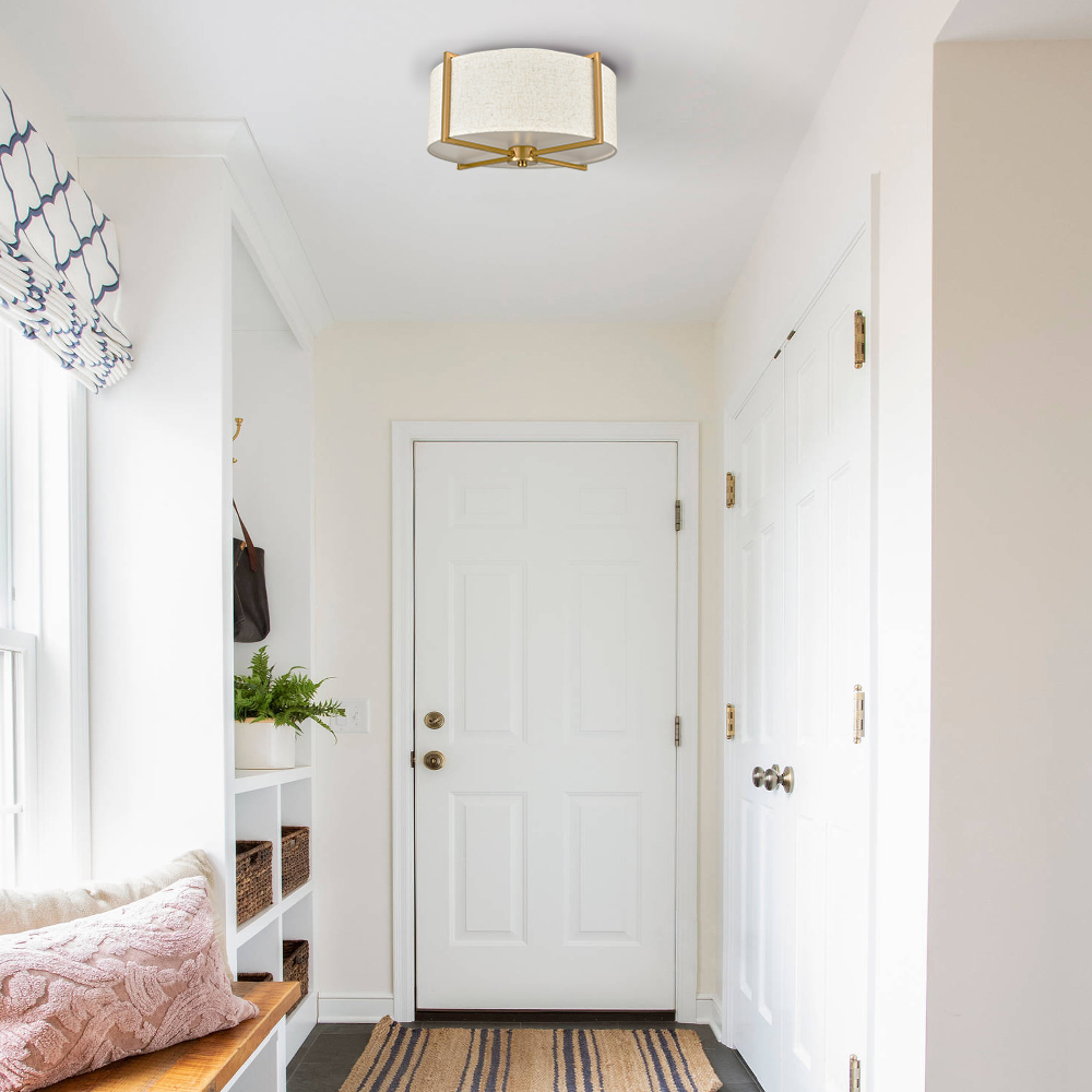 The LED flush mount ceiling light’s lamp-holder, bottom accent, and metal arms bring a glint of glamour to your home with a gleaming electrophoretic brass finish. Crafted of beige slub linen, its drum shade encircles a bulb and conveys an aura of elegance. The light pouring through the fabric lampshade is gently muted and fills the room without any glare. The LED flush mount ceiling light’s fabric shade is held in place by two crisscross metal arms to add alluring visual interest to the space. It is an awesome addition to your space with its mid-century vibe. Its beige slub linen lampshade contrasts the shiny finish and adds alluring eye appeal to the space.