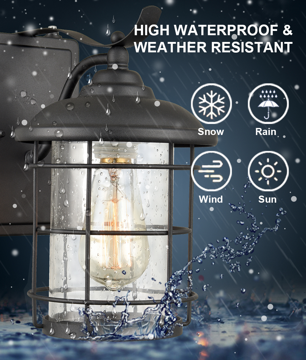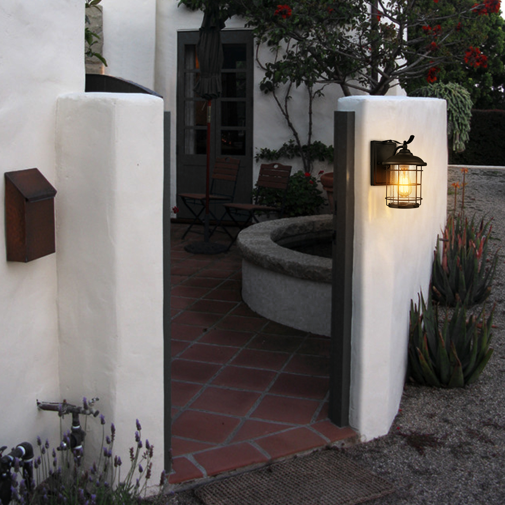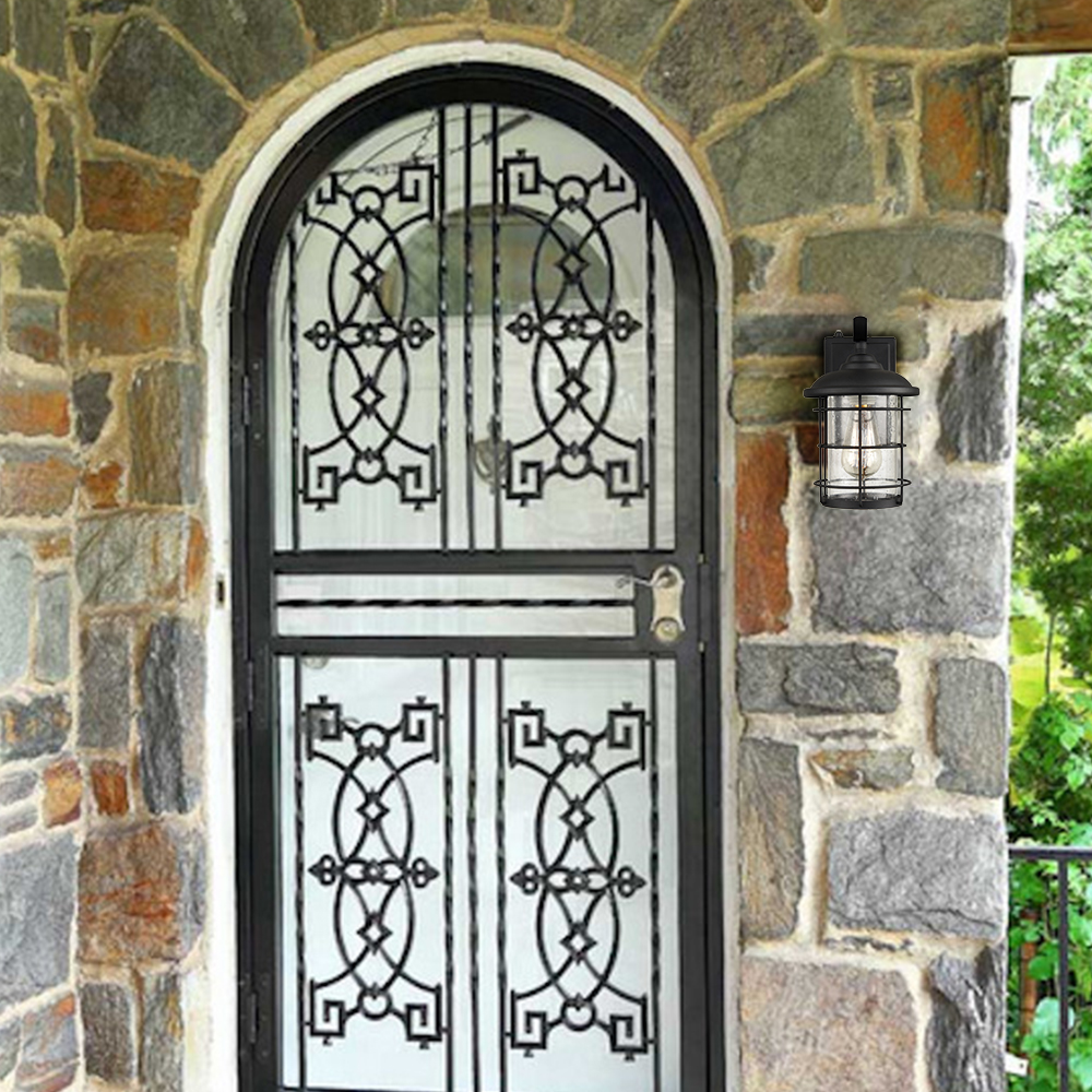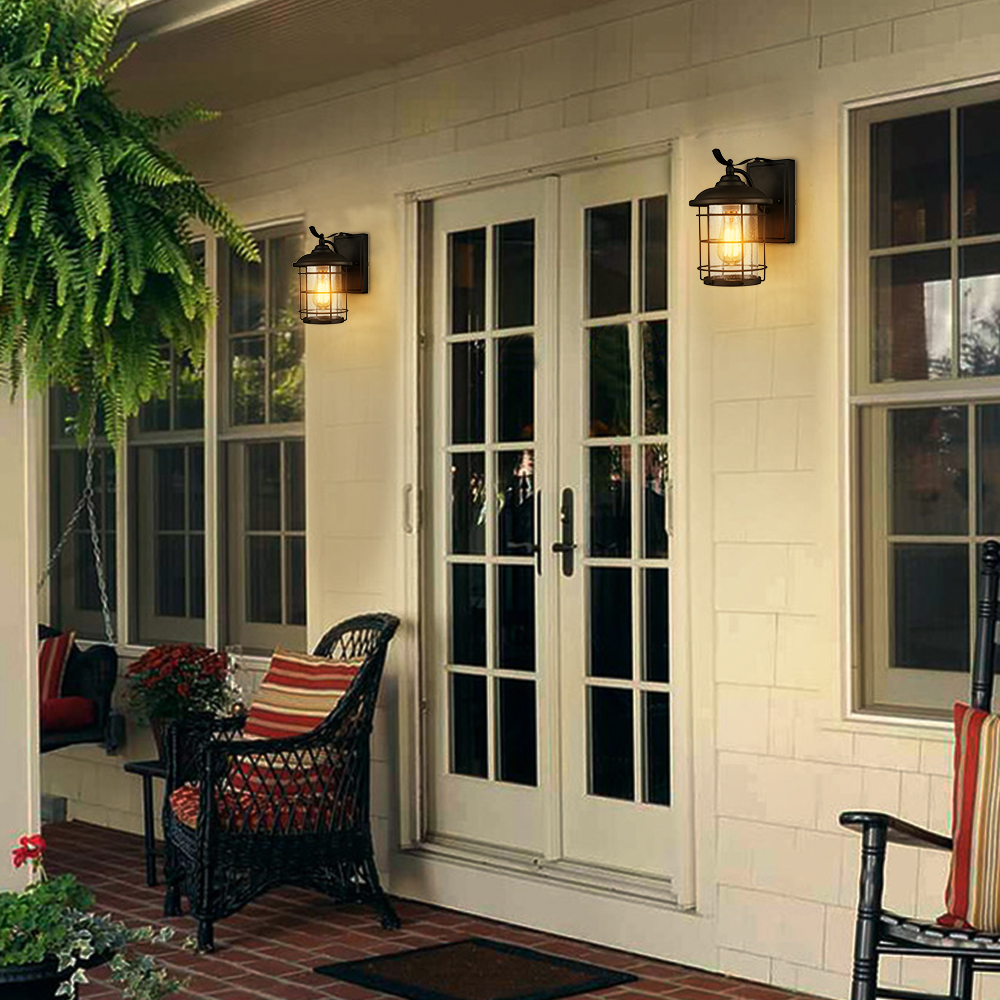Finished in matte black, the outdoor wall light fixtures lend a bit of industrial touch to your outdoor space. Their cylinder seeded glass shades are showing off the beauty of geometry. Both glass shades are topped off with cone covers and are protected by crisscross open metal cages.