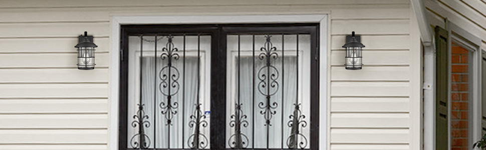Finished in matte black, the outdoor wall light fixtures lend a bit of industrial touch to your outdoor space. Their cylinder seeded glass shades are showing off the beauty of geometry. Both glass shades are topped off with cone covers and are protected by crisscross open metal cages.