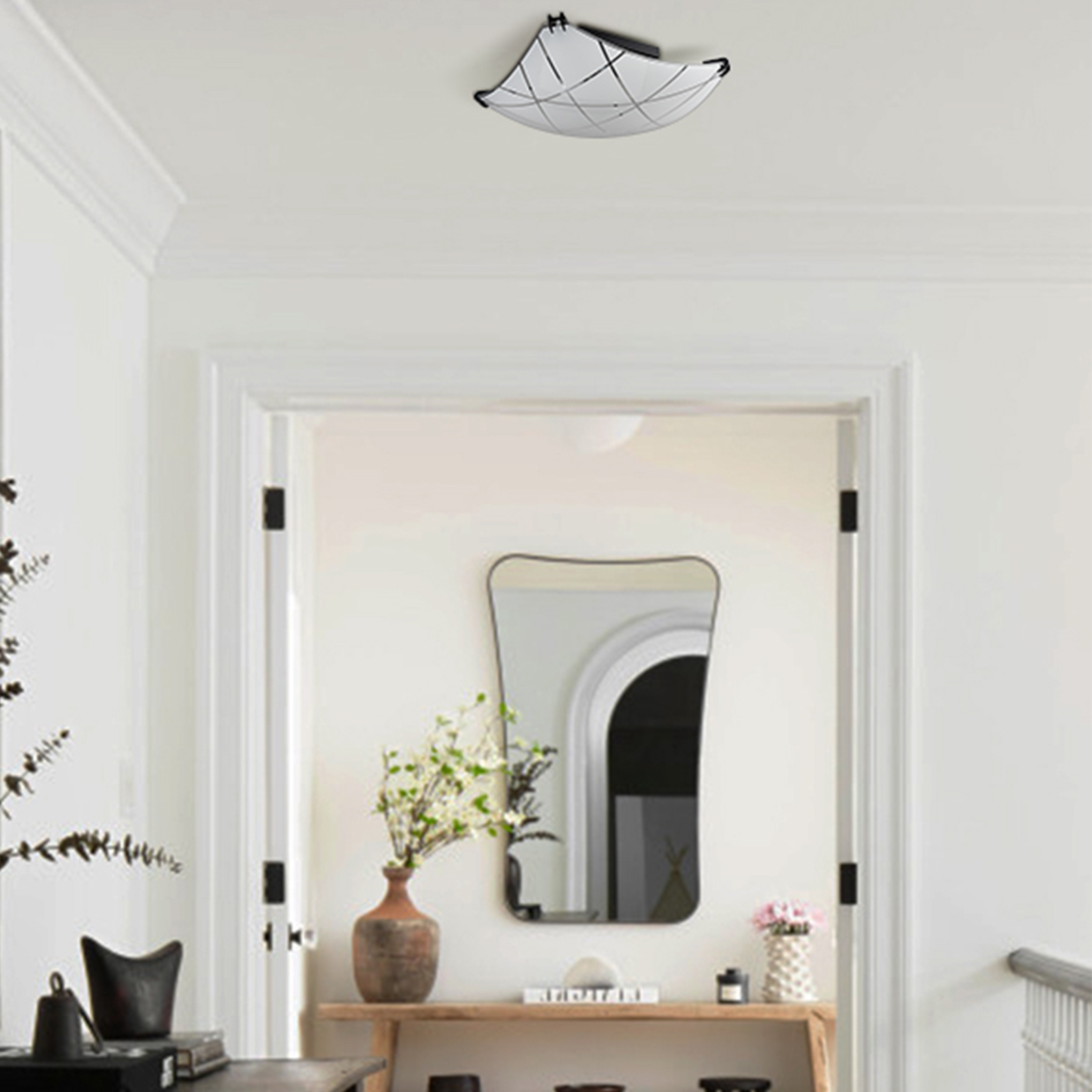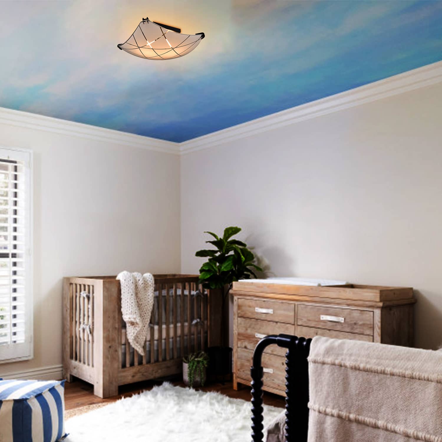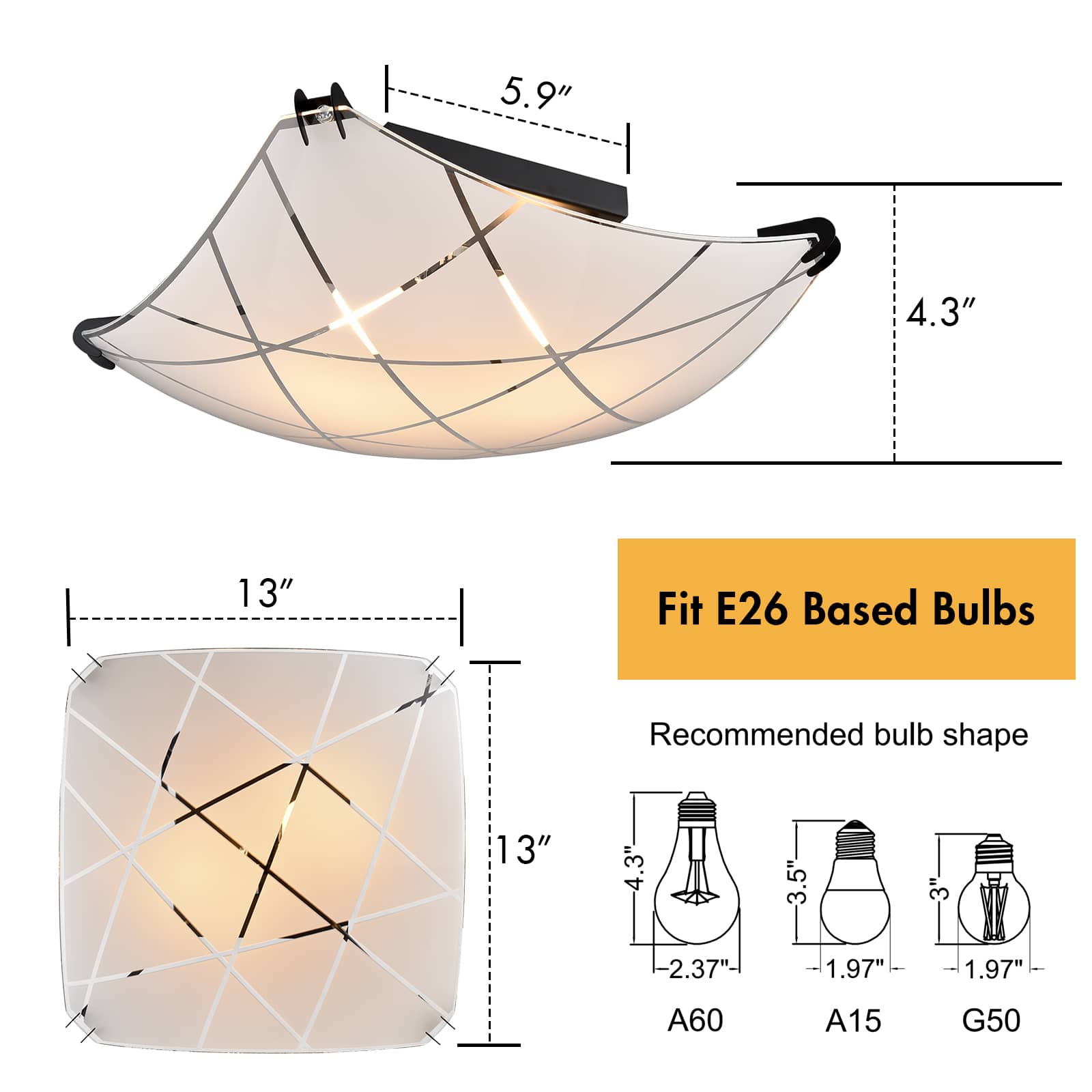 The farmhouse 2-light ceiling light boasts a semigloss black finish, giving your living space a touch of urban sophistication. Its square bent glass shade shows off crisscross painted stripes, which gives your living space a dose of whimsy and a touch of geometry. The lampshade is held aloft by 4 retractable hooks attached to the canopy. Its black finish pairs nicely with the square bend glass shade, delivering a dramatic decorative impact. The amazing texture of the glass shade is the perfect finishing touch for your home. It allows the light to gently shine through the bent glass shade and casts intricate shadows. It adds depth and character to the space, creating an alluring eye appeal.