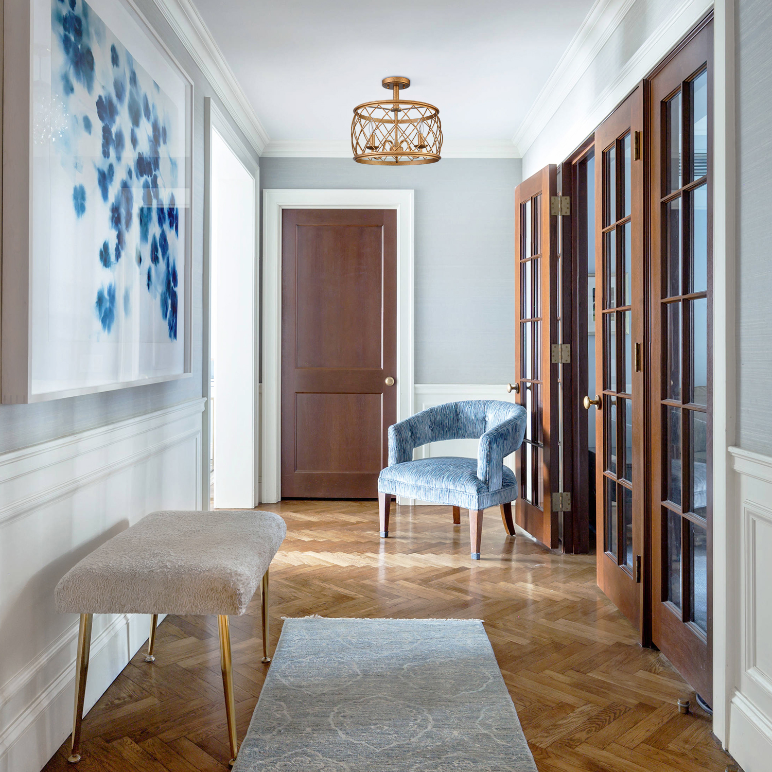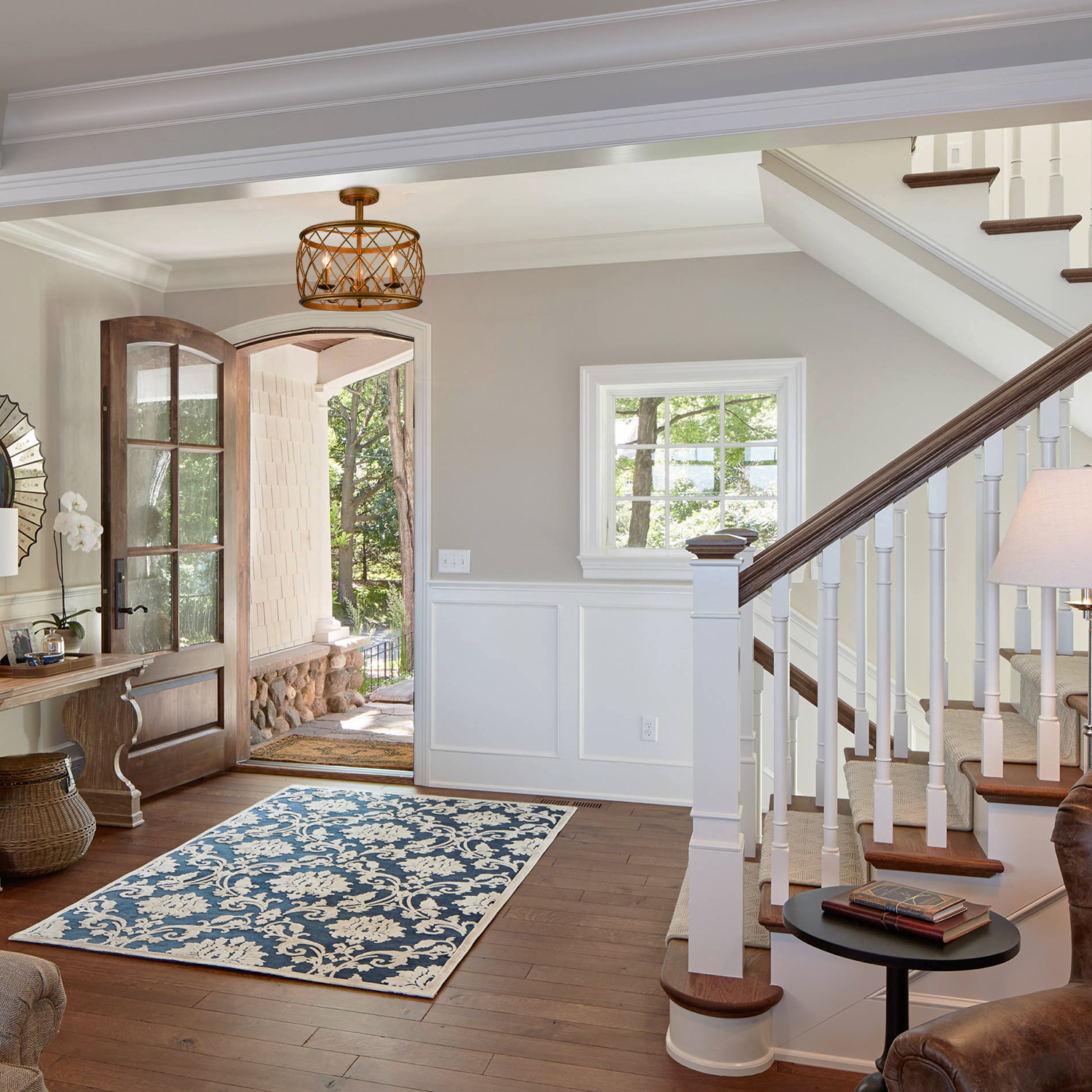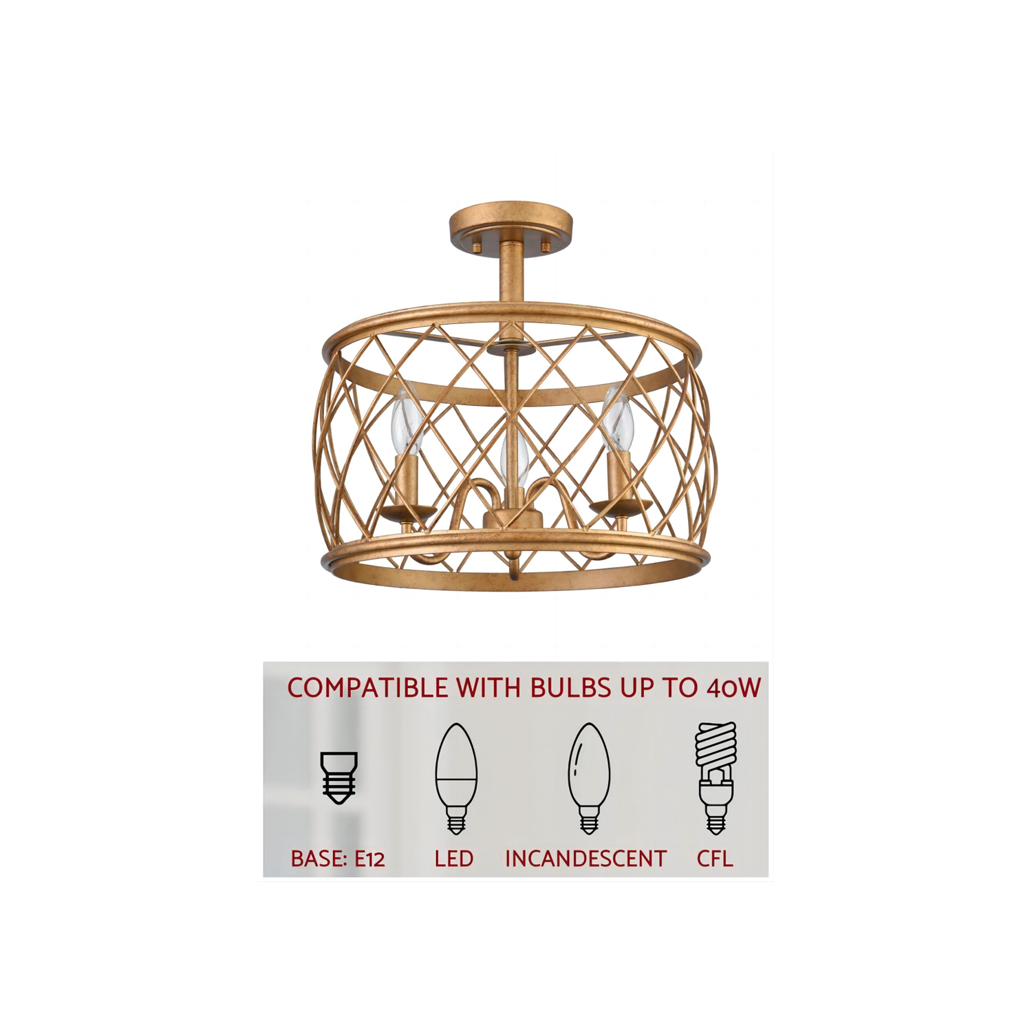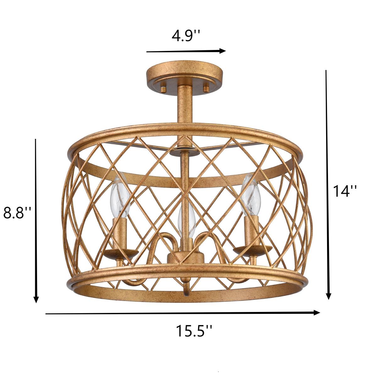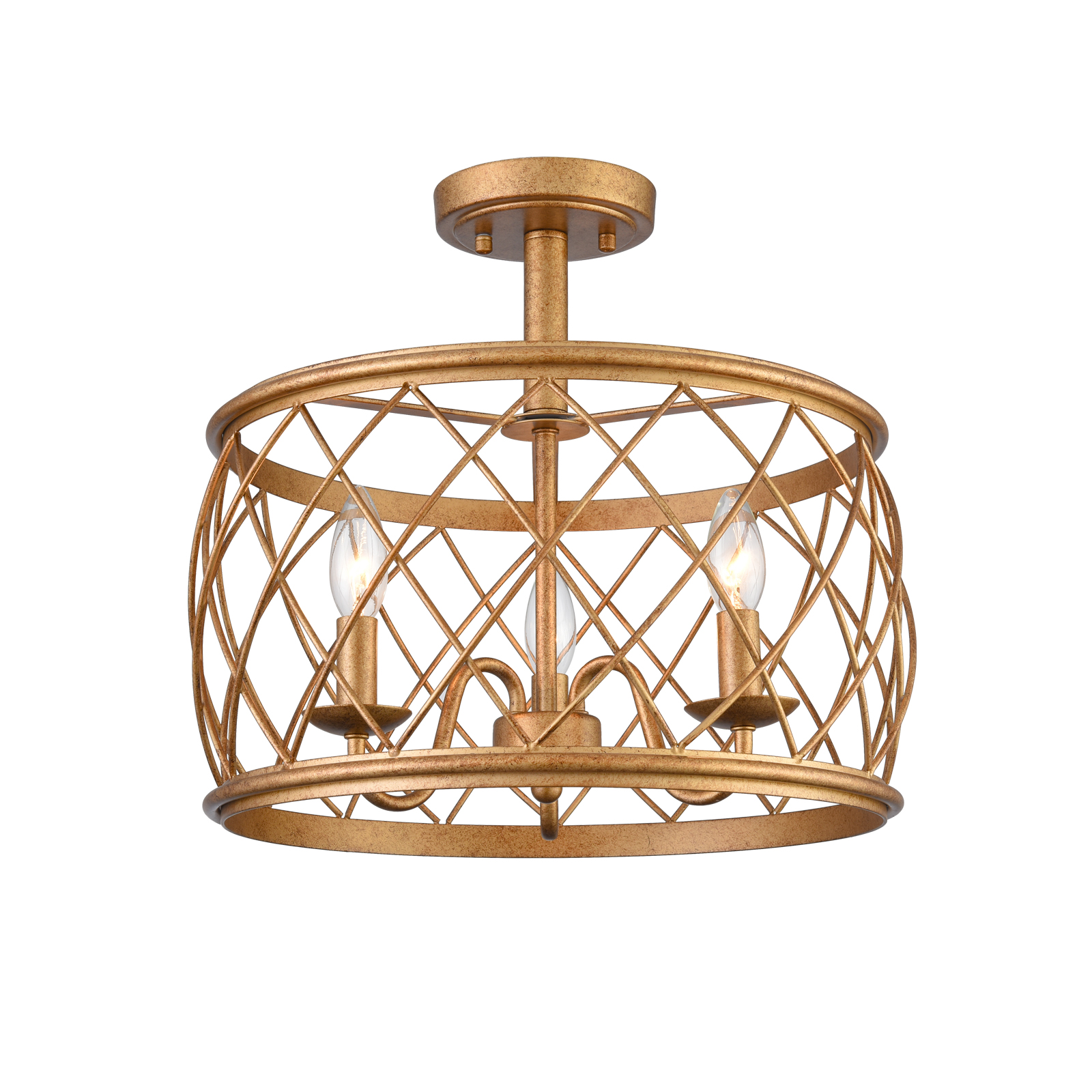 Being dressed in a rusty gold finish, the drum semi-flush mount ceiling light livens up your interior with metallic glitz. It flaunts a unique drum shade look that keeps your home look open and airy. Featuring a crisscross accent, its drum shade adds visual interest and character to your living space. Three exposed candelabra-inspired lights inside the drum shade are supported by scrolling arms, which lends a ton of texture to complete the aesthetic.