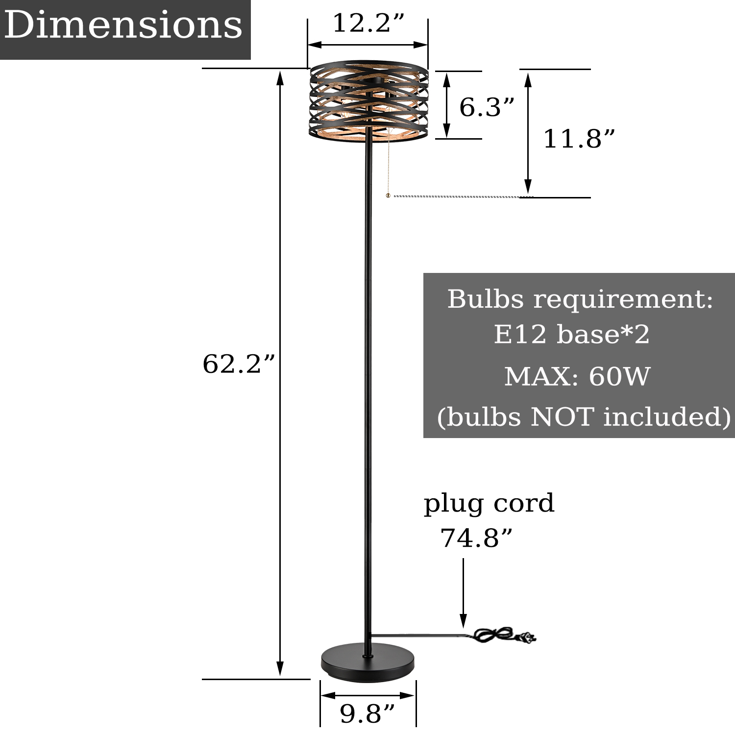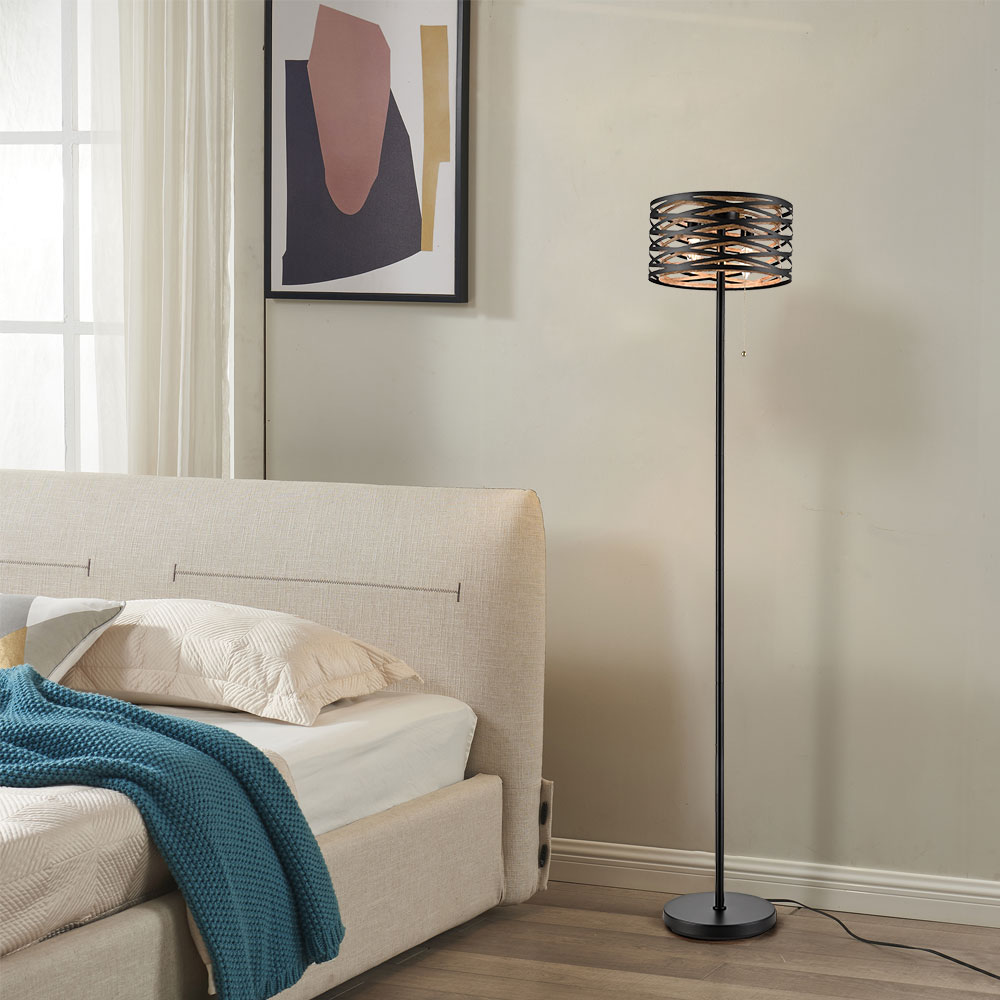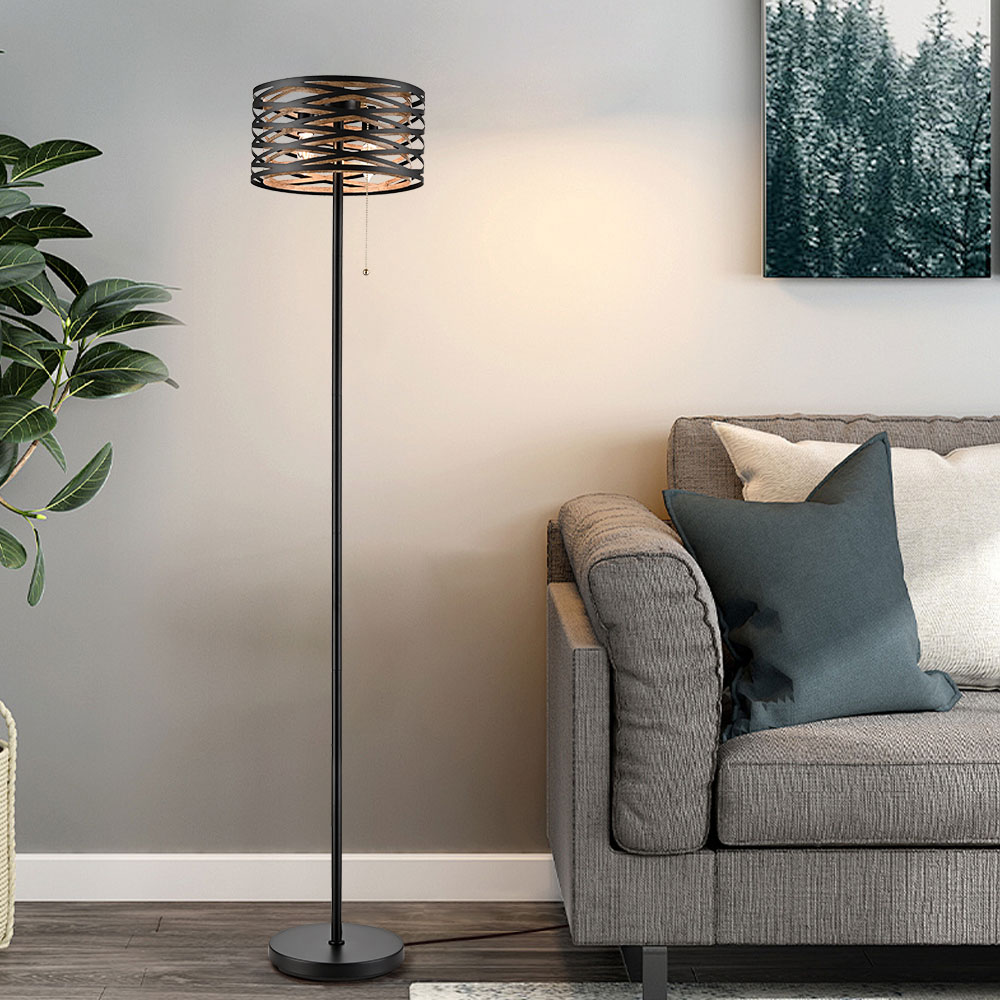 Showcasing a drum shade design, the 2-light floor lamp flaunts a two-tone finish with a new twist on a modern style. The intertwined lines are painted with a black finish on the outer layer while it boasts a smaller drum shade coated in a wood grain finish on the inner layer. It doubles up on drum shades, creating layers of nuanced light. The airy cage encircles an exposed bulb in the middle, rounding out the design with a large dose of texture. With the stunning shades of black and wood grain swirled together, it adds visual interest and attractive eye appeal to your living space. It comes with an on/off pull chain switch and a 74.8-inch power cord.