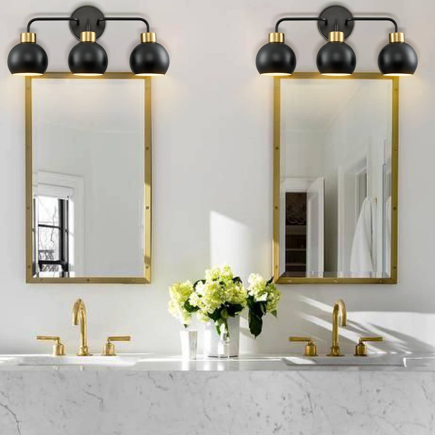 The black wall sconce's lamp holders sport a rustproof brass finish, highlighting your interior with a bit of bling. Its globe shades boast a rustproof black finish on the outer surface while they flaunt a white finish on the inner surface. The white interior of the lampshades helps reflect the light. Showing off a sleek sphere silhouette, it offers the perfect blend of mid-century classic and contemporary elements and completes the aesthetic with a touch of geometry. Its black finish features 220-degree high-temperature baking varnish craft for strong adhesion and scratch resistance.