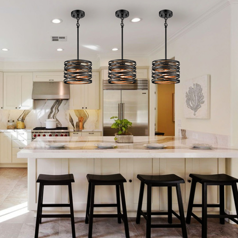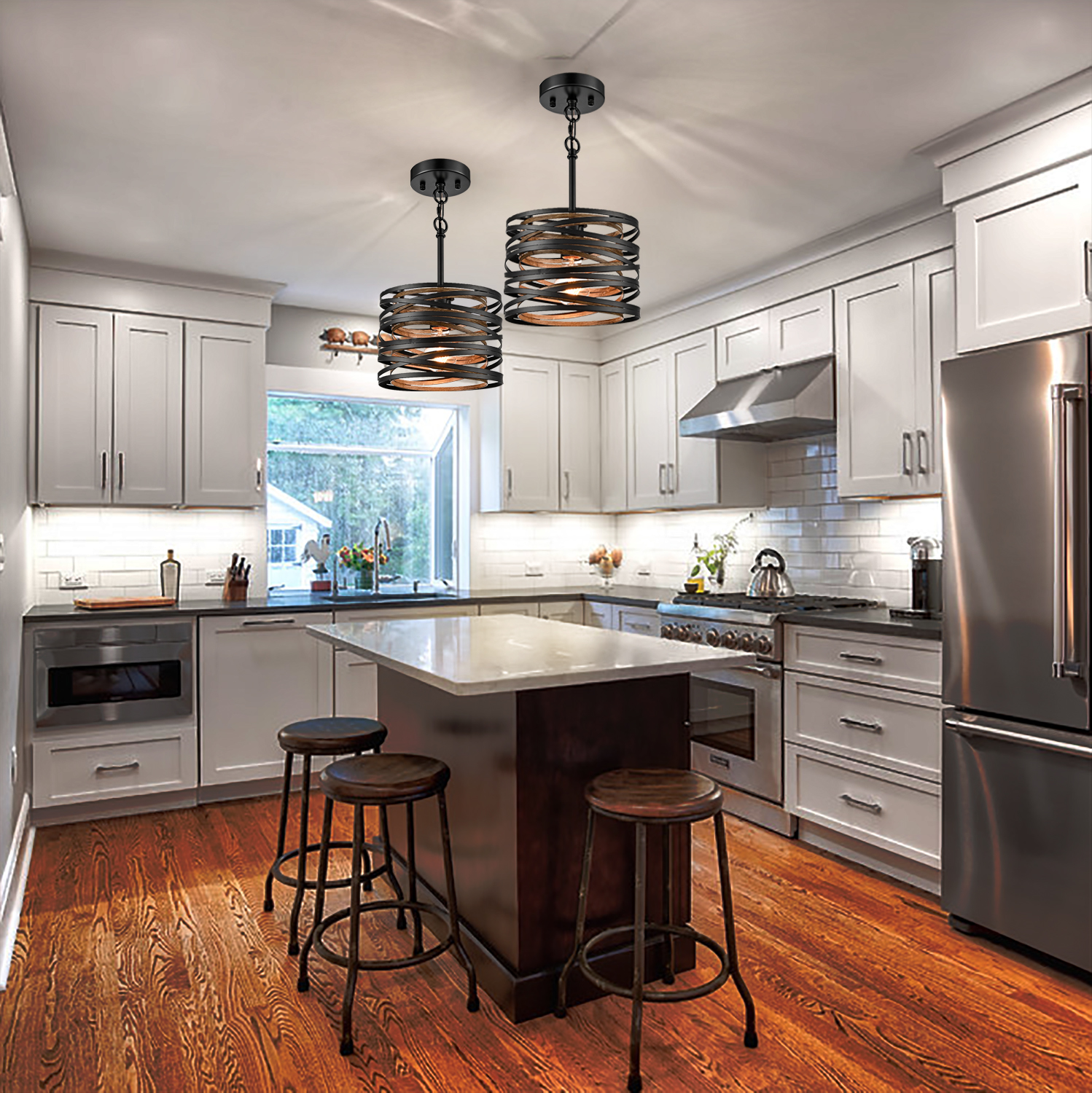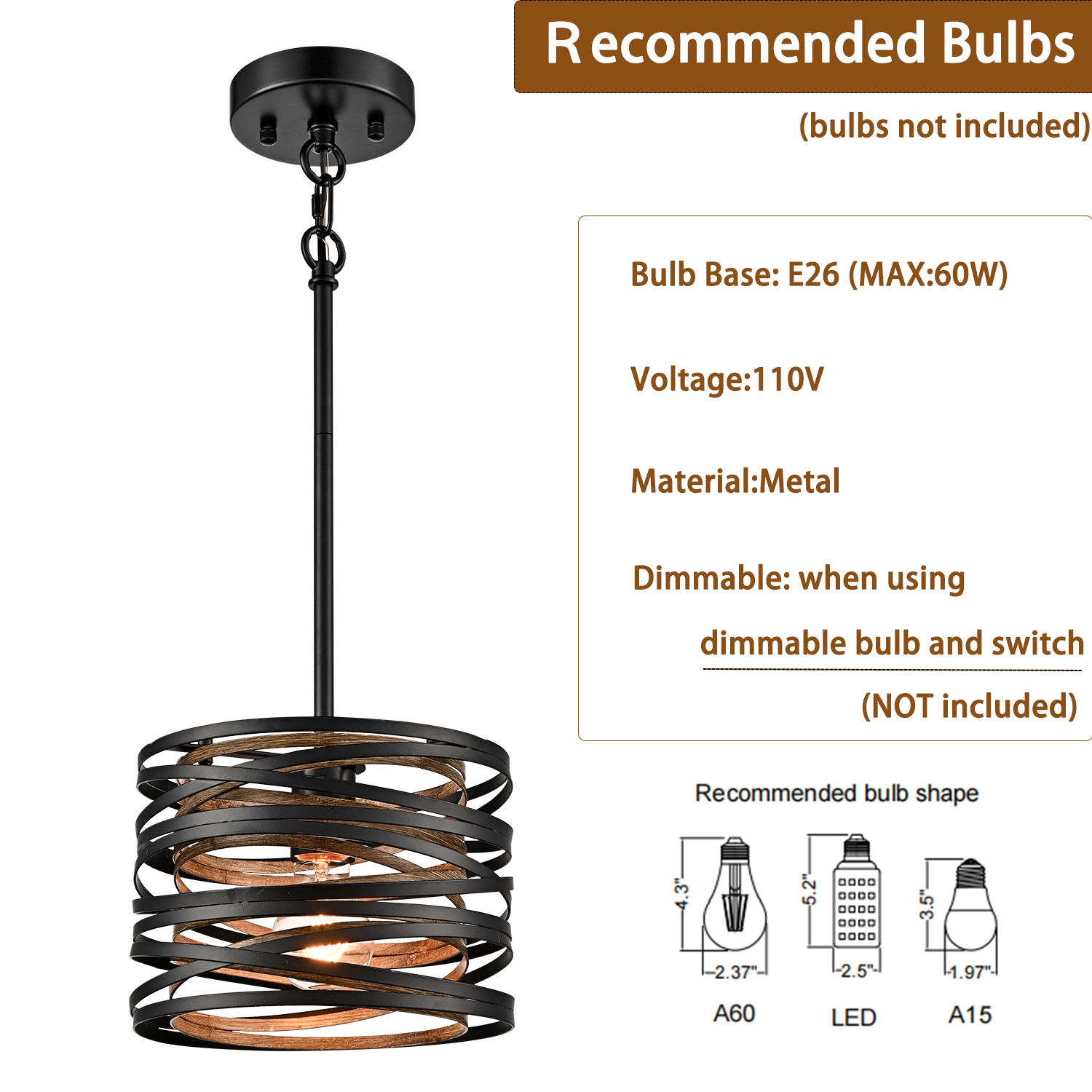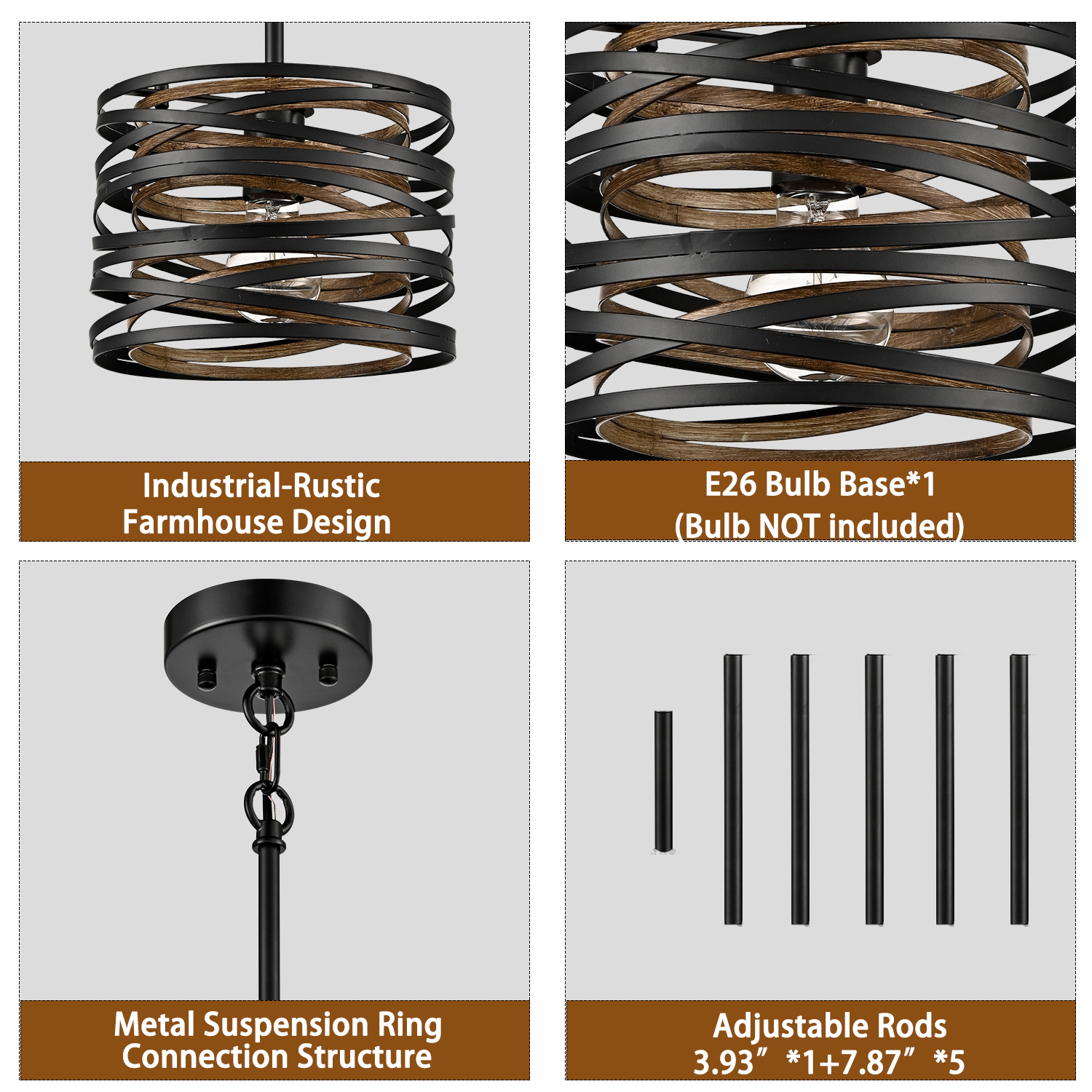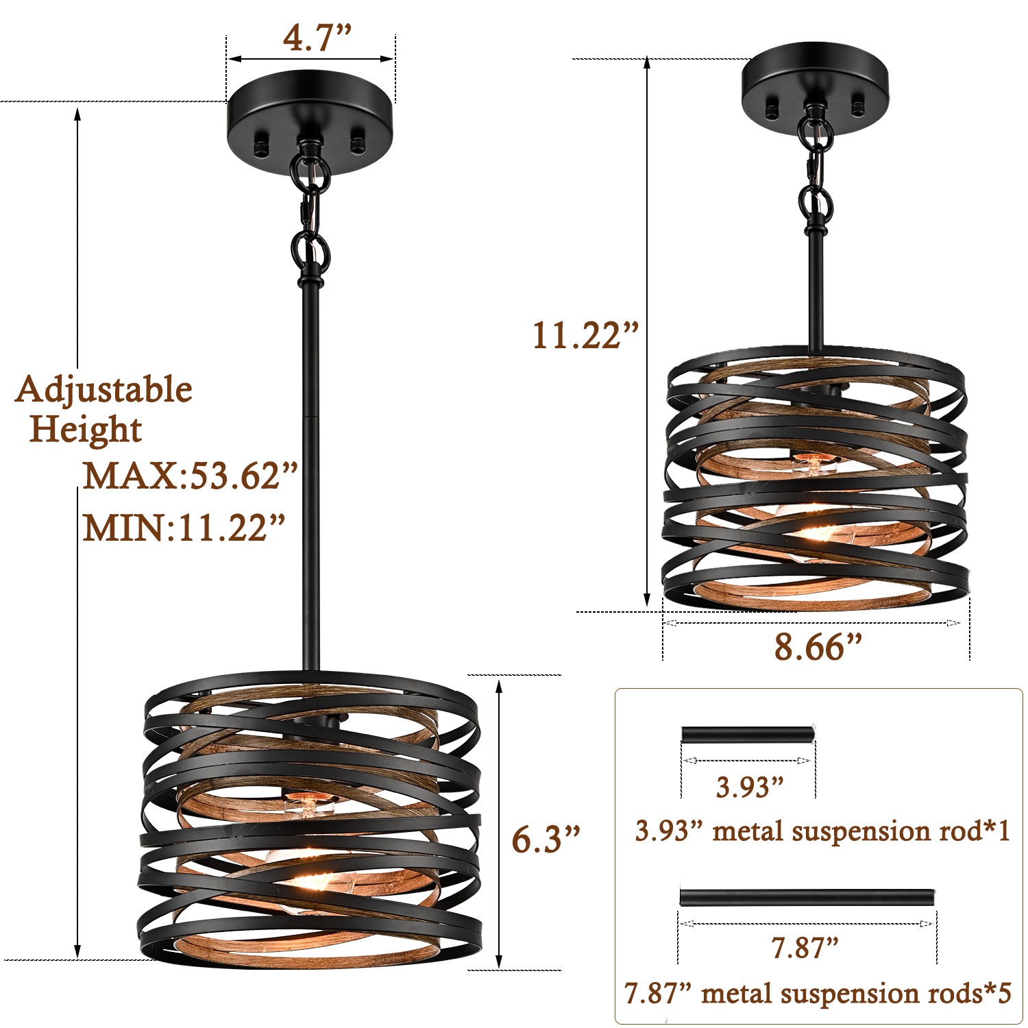 Showcasing a drum shade design, the black metal pendant light fixture flaunts a two-tone finish with a new twist on a modern style. The intertwined lines are painted with a black finish on the outer layer while it boasts a smaller drum shade coated in a wood grain finish on the inner layer. It doubles up on drum shades, creating layers of nuanced light. The airy cage encircles an exposed bulb in the middle, rounding out the design with a large dose of texture. With stunning shades of black and wood grain swirled together, it adds visual interest and attractive eye appeal to your living space. It comes with five 7.87-inch rods and one 3.93-inch rod to suit your different lighting needs.