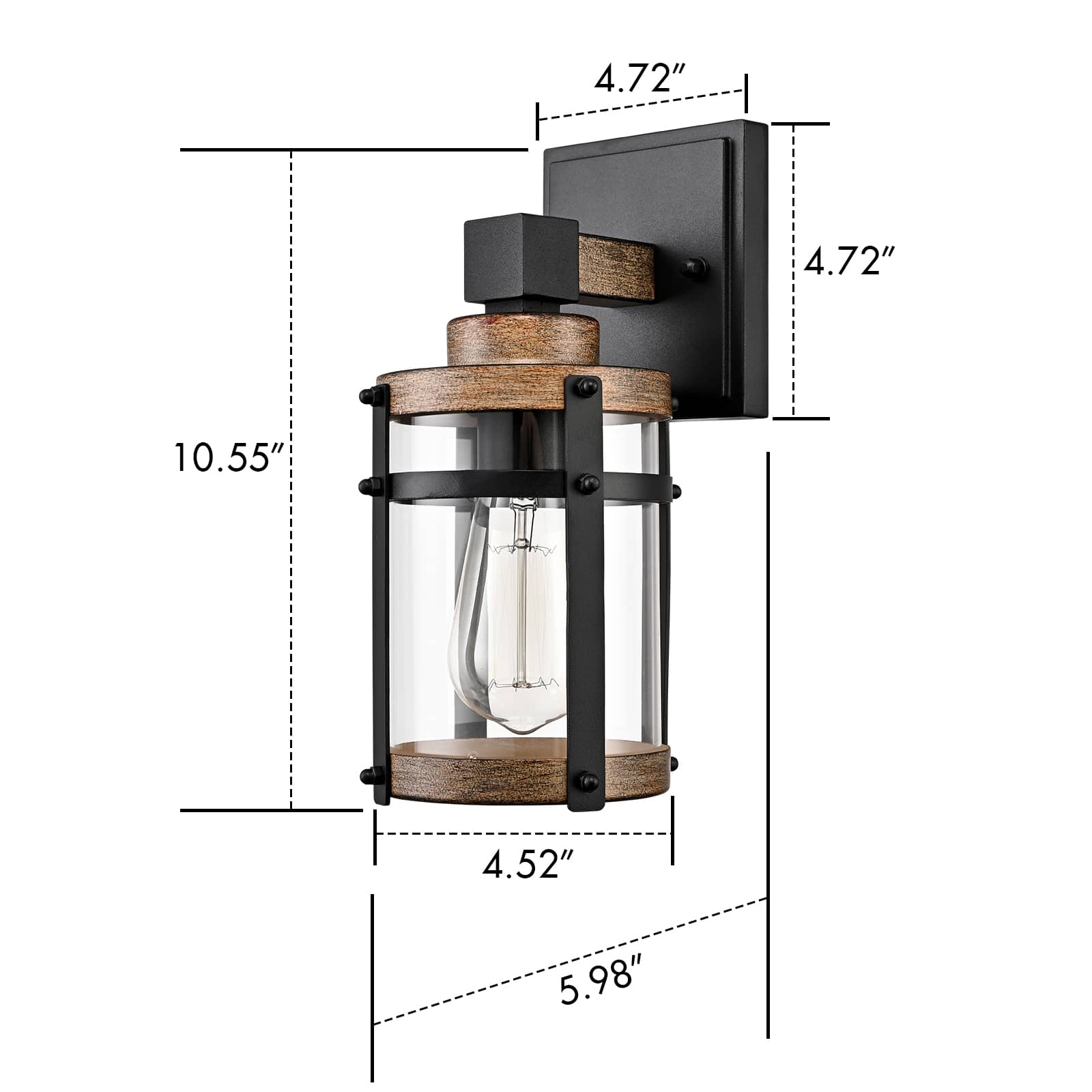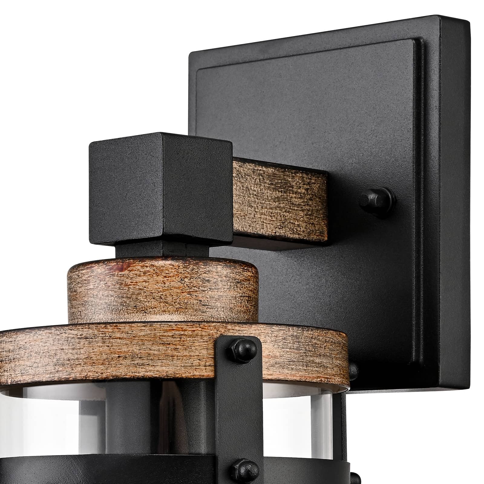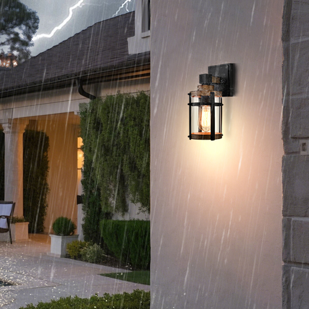 The outdoor wall sconce’s canopy, lamp holder, and intersecting framing accents gracefully embracing the glass shade gives your alfresco space a touch of modern sophistication with a matte black finish. The other parts of the wall sconce add a ton of texture to the alfresco space with a brown finish. A mix of finishes encompasses both nature-inspired qualities and farmhouse elements, yet maintains an industrial edge. Its cylinder clear glass shade shows off the beauty of geometry and conveys a refined touch to the space. The black finish contrasts the brown hue on the light and adds alluring eye appeal to the alfresco space. Its open bottom design makes it particularly easy for bulb replacement and cleaning. Being weather-resistant, it is perfect for outdoor use.