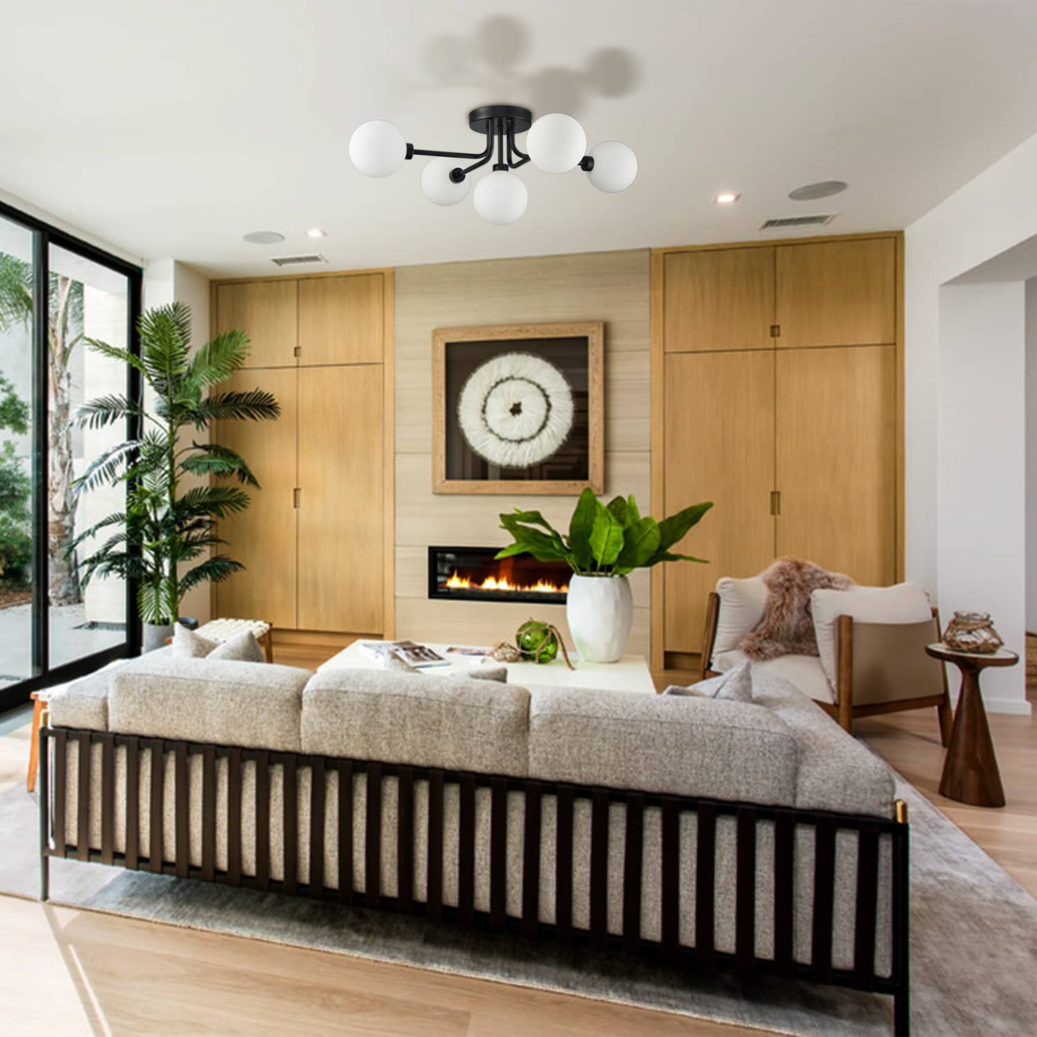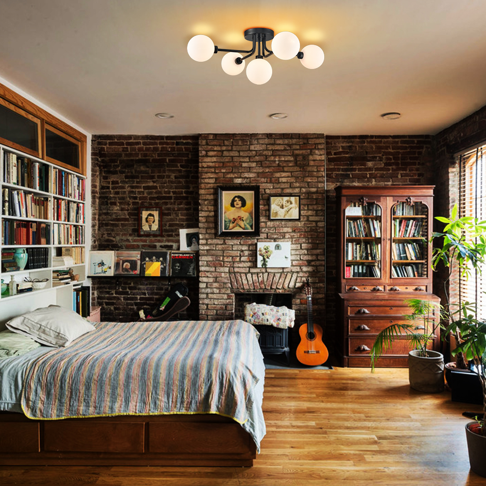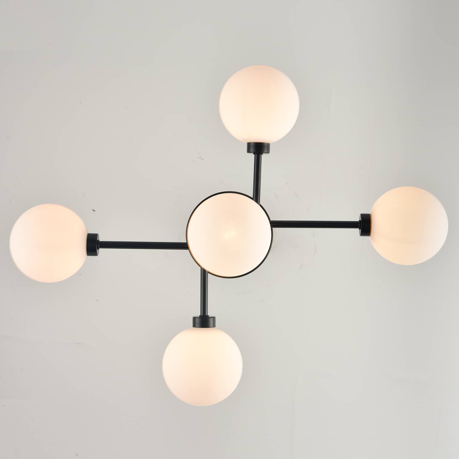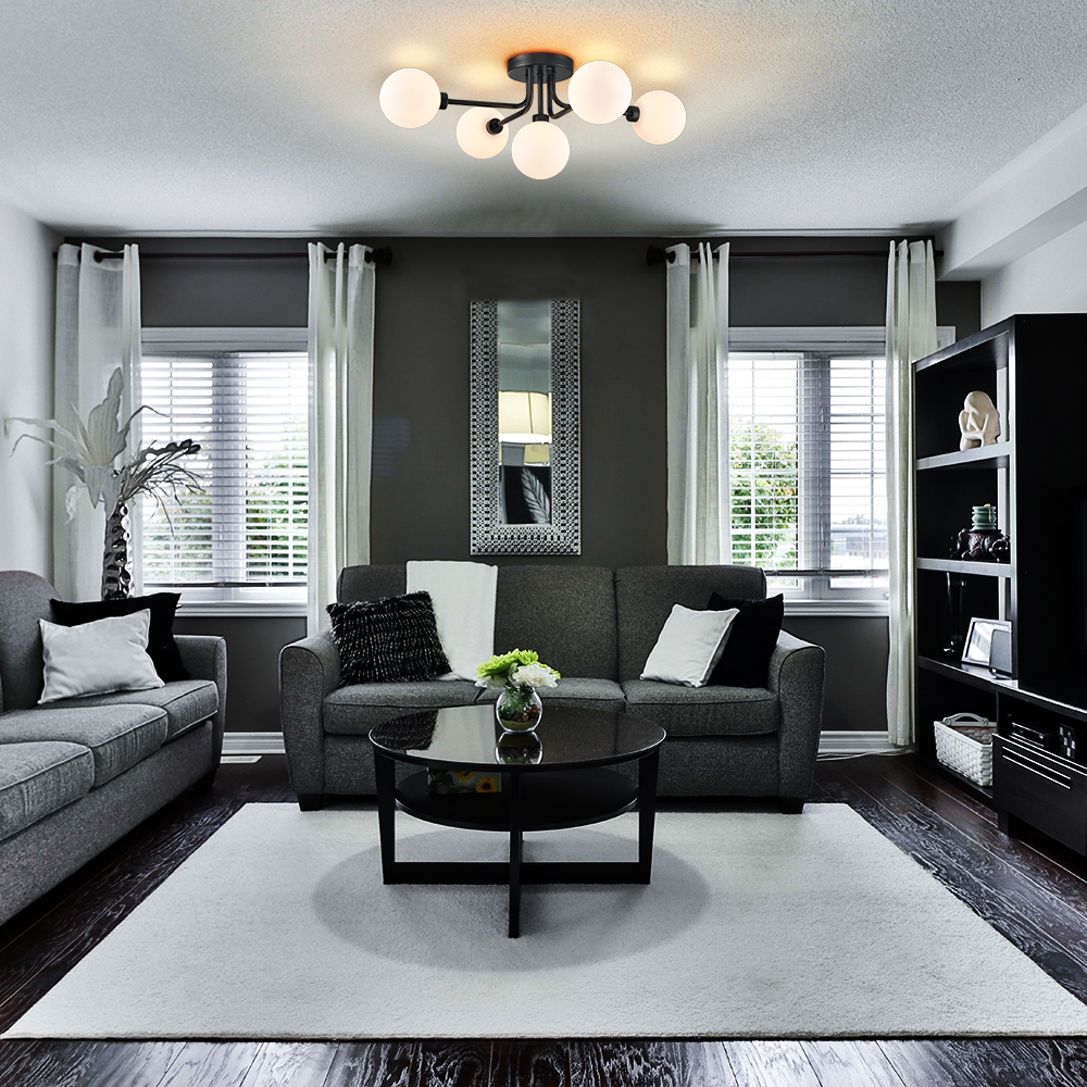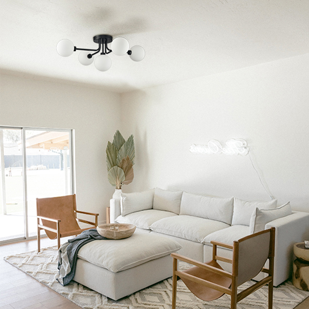 The industrial semi flush mount ceiling light’s canopy, arms, and lamp-holders give your living space a touch of urban sophistication with a black finish. Crafted from impurity-free hand-blown opaque opal glass, the ceiling light provides the perfect blend of mid-century classic and contemporary elements. Four out of five glass shades are supported by gracefully curved arms and extend outward in every direction to encircle the one in the middle.